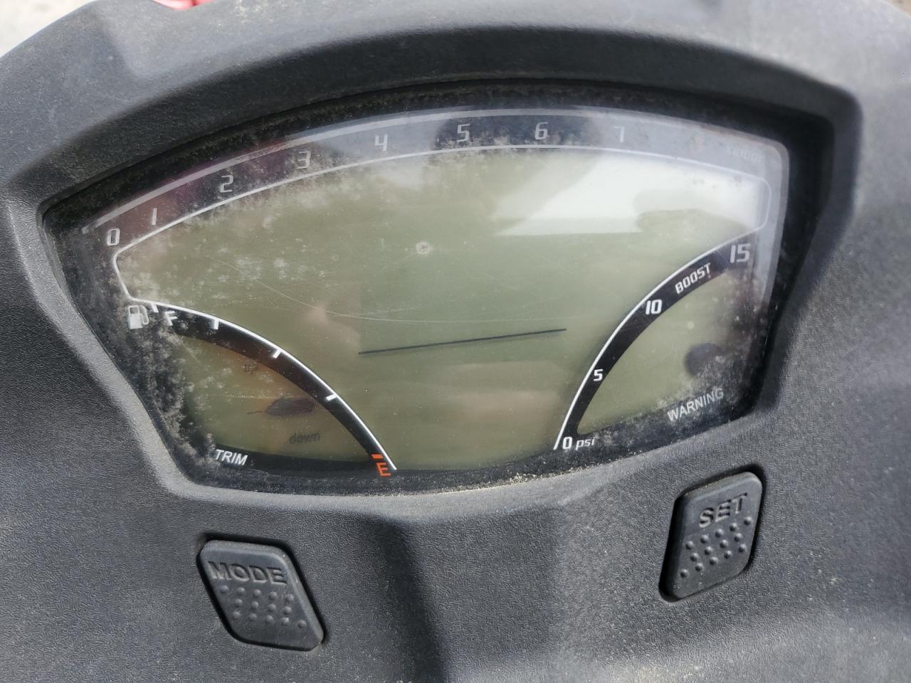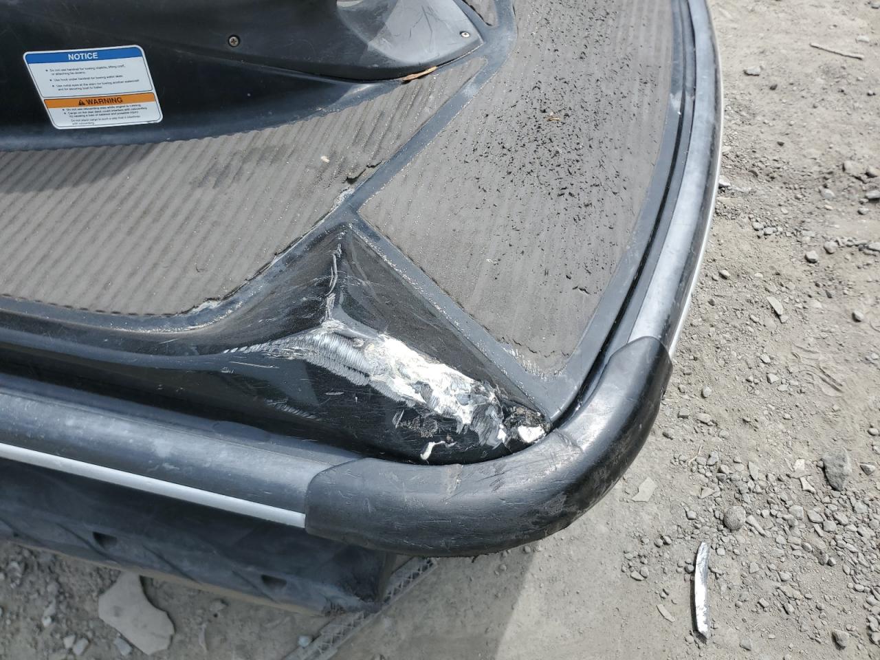 The jet ski exhibits cosmetic damage to its body panels. The rear end shows damage, suggesting a potential impact. The engine appears intact, but further inspection may be needed. The interior is in good condition with the dashboard showing some wear. Overall, the jet ski requires some repairs.