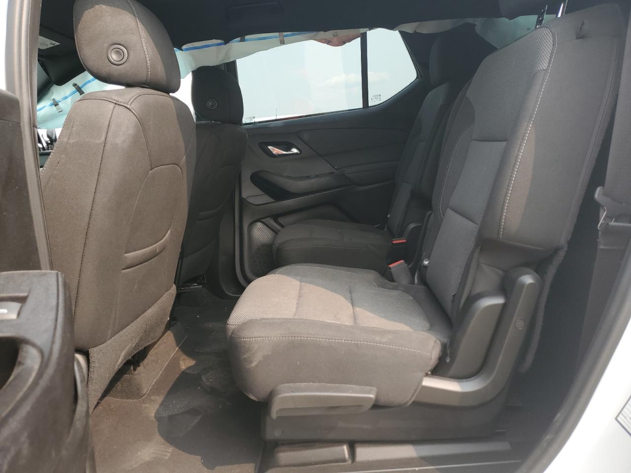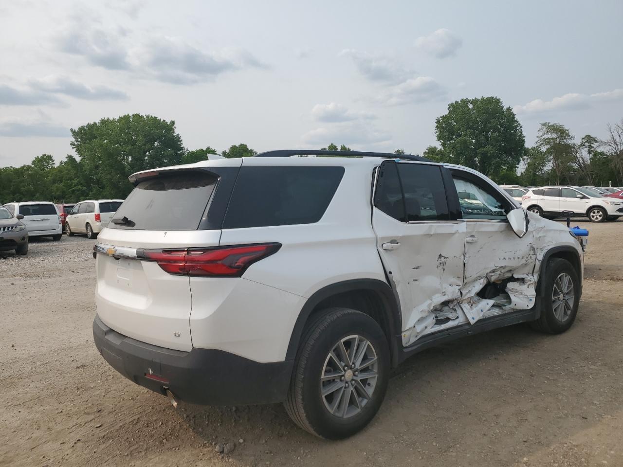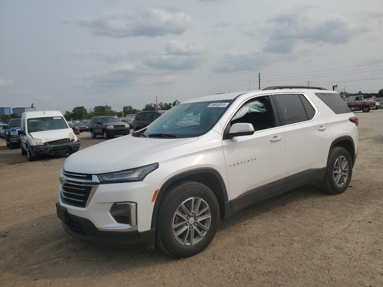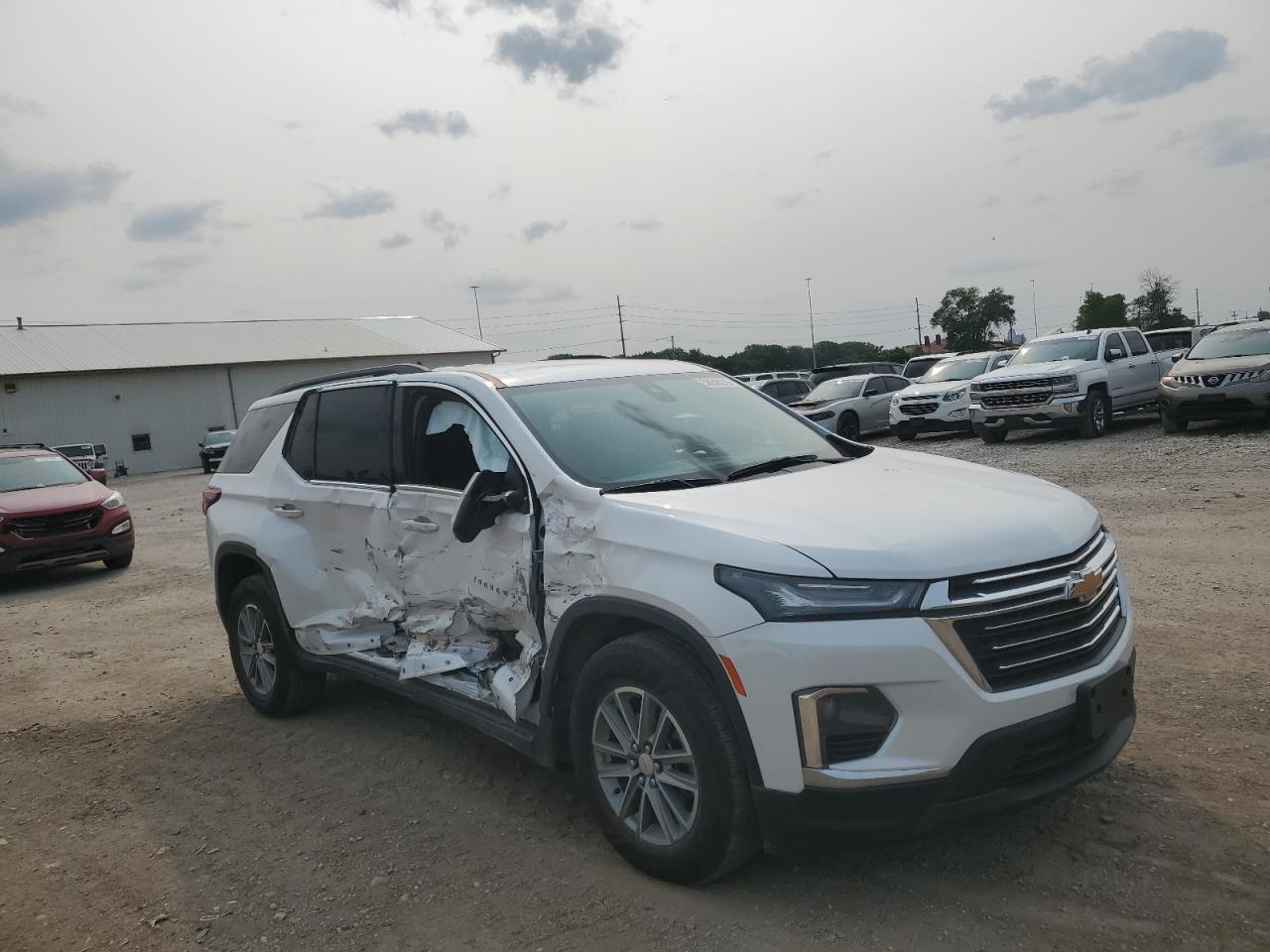 FairWhite 2023 CHEVROLET TRAVERSE L with side damage, Run & Drive Verified status. The vehicle's exterior shows significant damage to the side, but the interior appears to be in good condition. The vehicle is drivable. The wheels and lights appear to be intact. The car requires considerable repair. This SUV is in fair overall condition due to the body damage. The starting code is Run & Drive Verified.