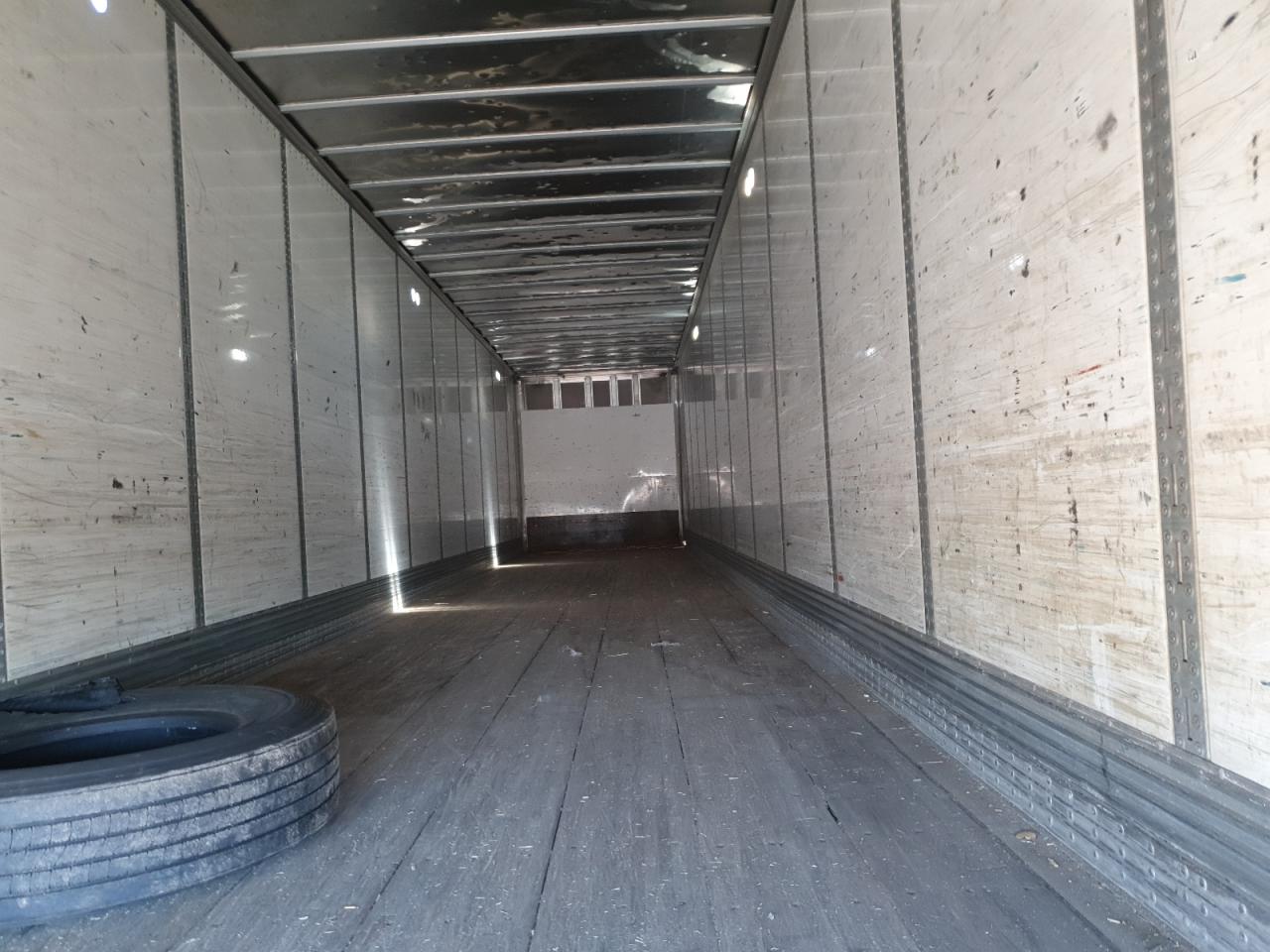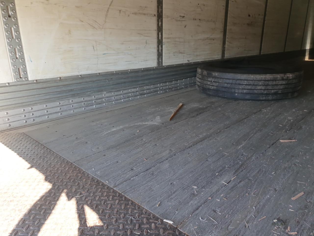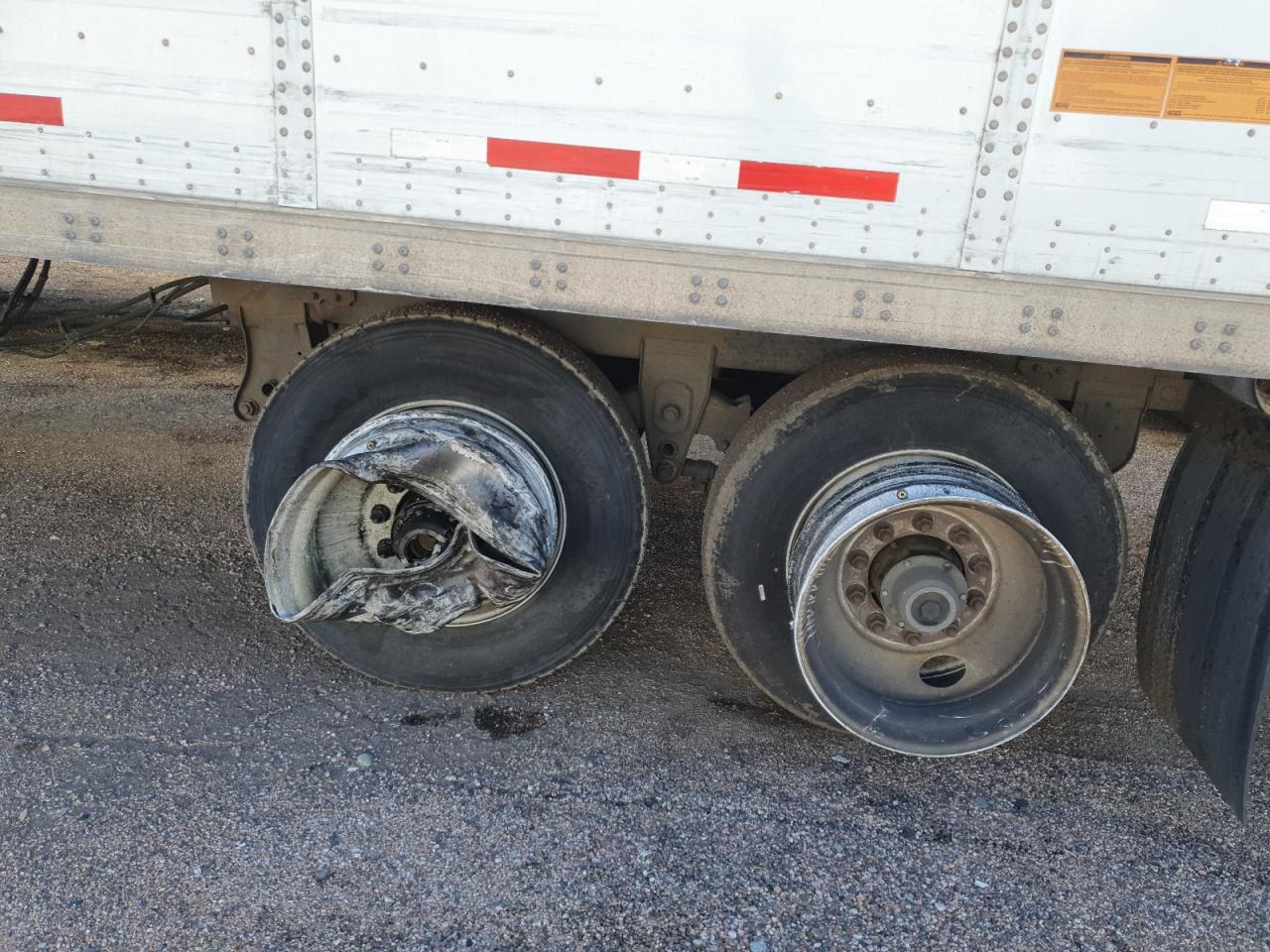 The trailer exhibits side body damage. The wheels are damaged, requiring potential repair or replacement. The exterior condition is fair, indicating some degree of damage.