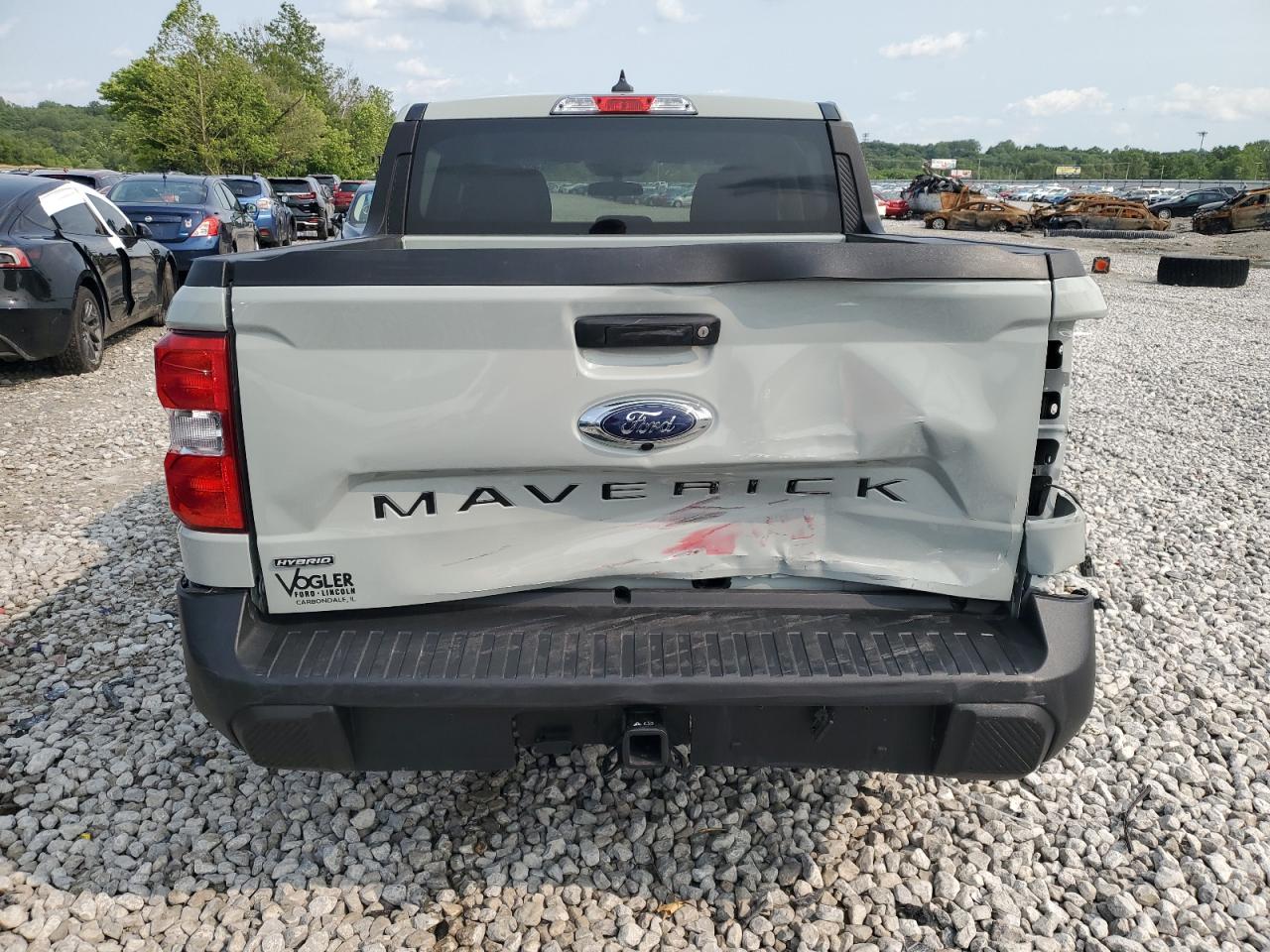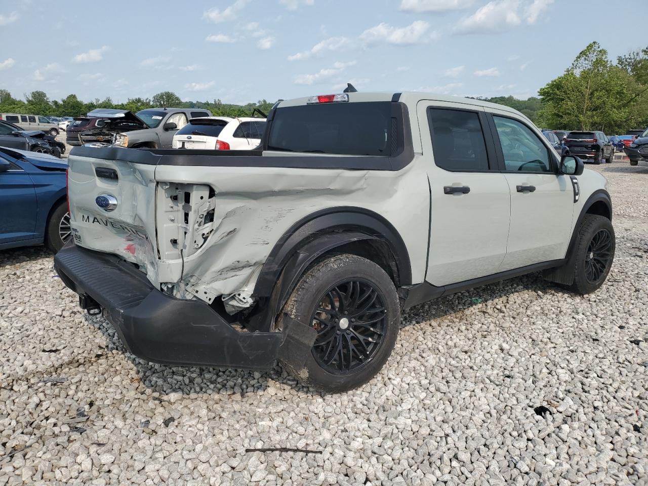 The Ford Maverick X has significant damage to the rear end, including the tailgate and bumper. The damage appears to be Body damage, likely impacting structural elements. The damage is visible on the rear body panels.