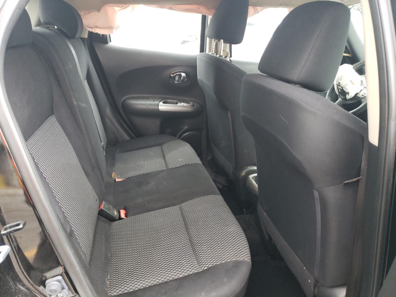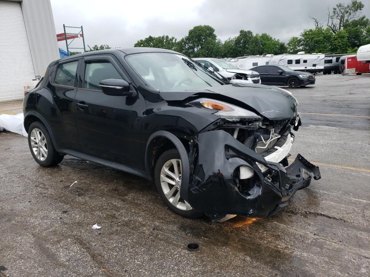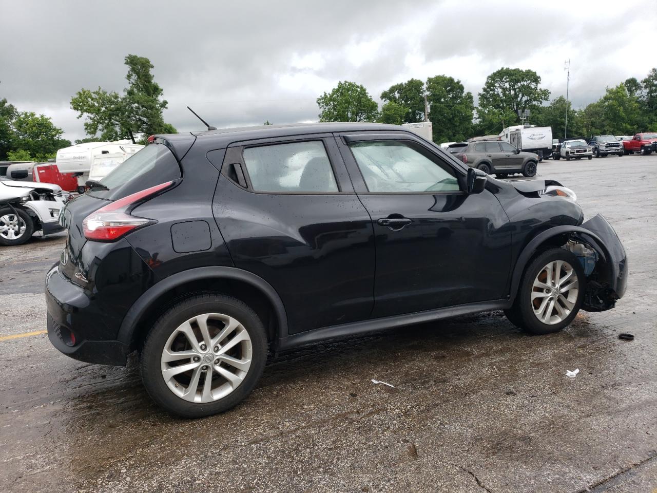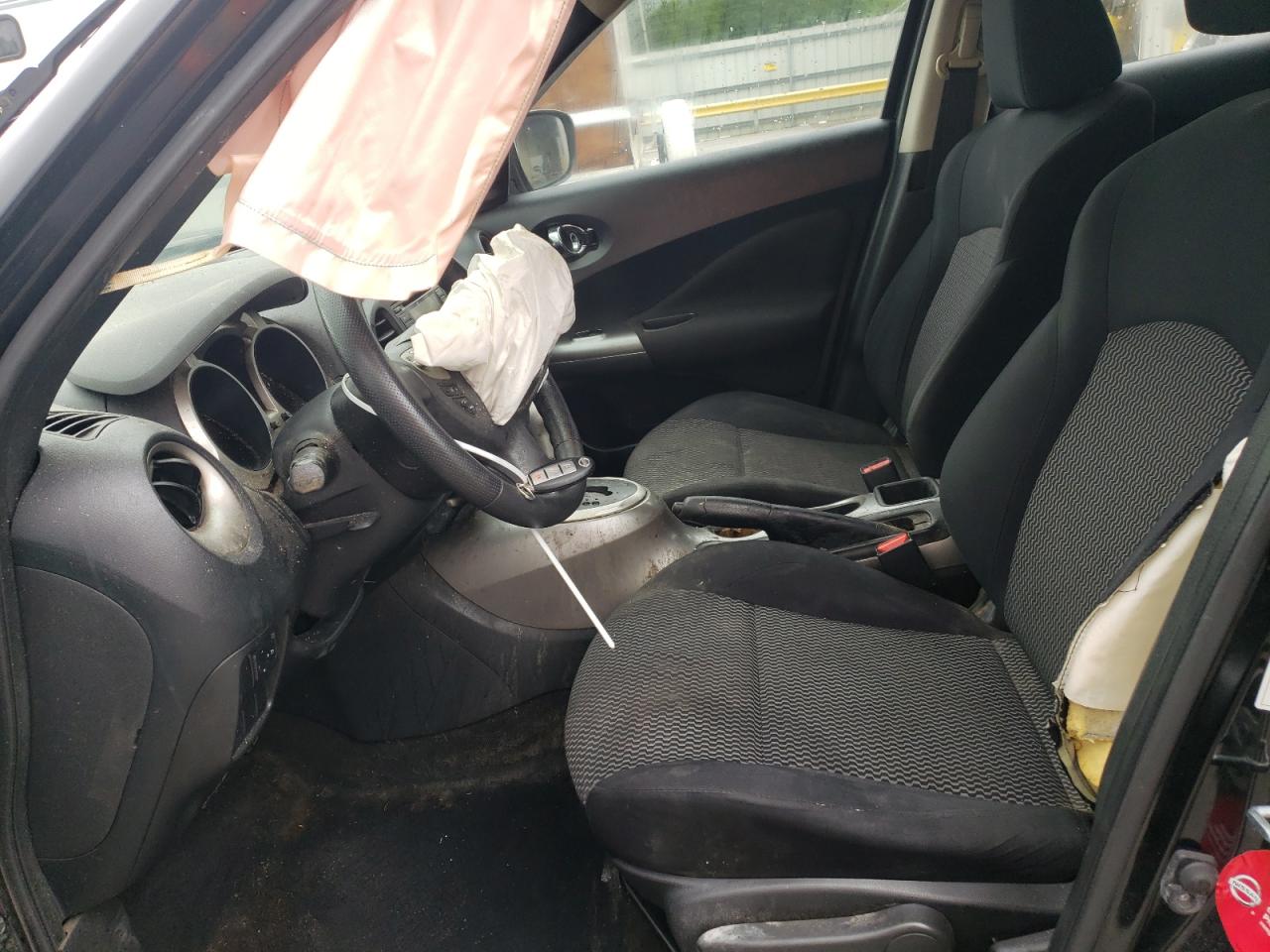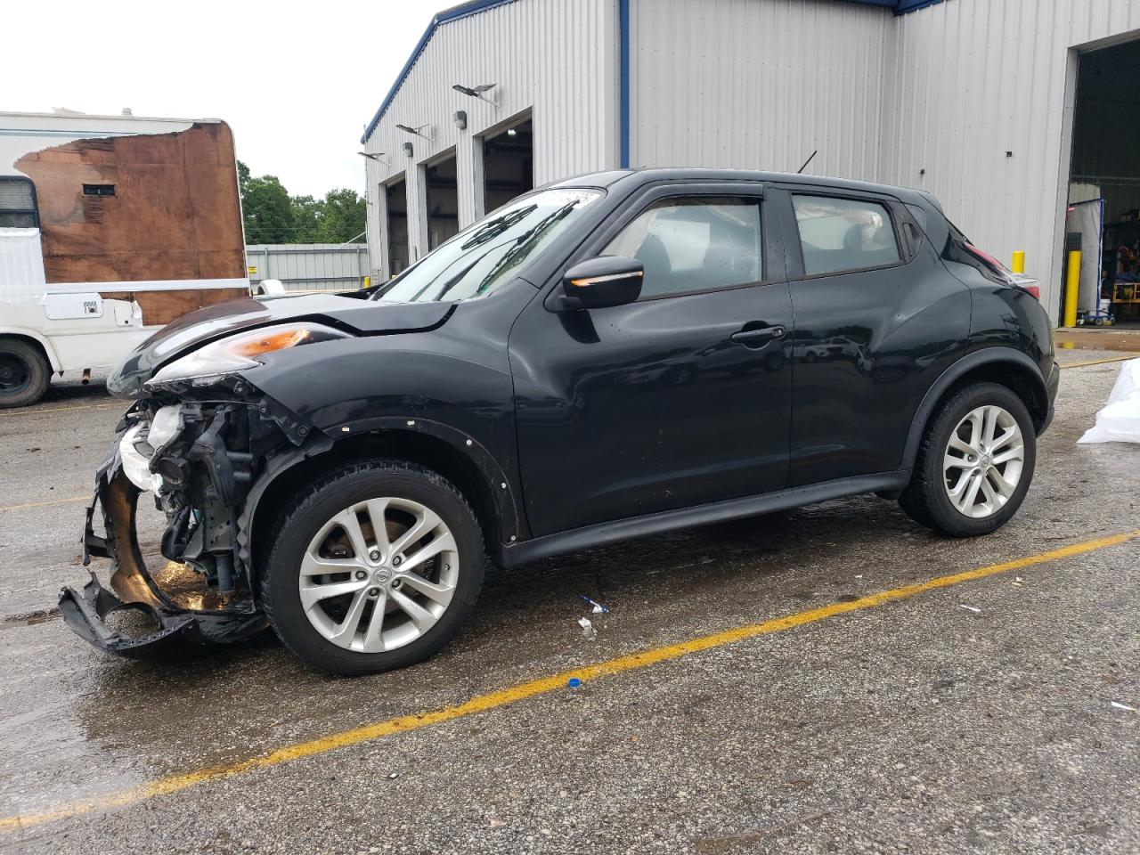 FairThis 2017 NISSAN JUKE S in black shows significant front-end damage. The primary damage is to the front end. Secondary damage is not present. The car is listed as 'Run & Drive Verified'. The interior appears to have deployed airbags, and the dashboard shows some wear. Wheels are present but the front end requires repair.