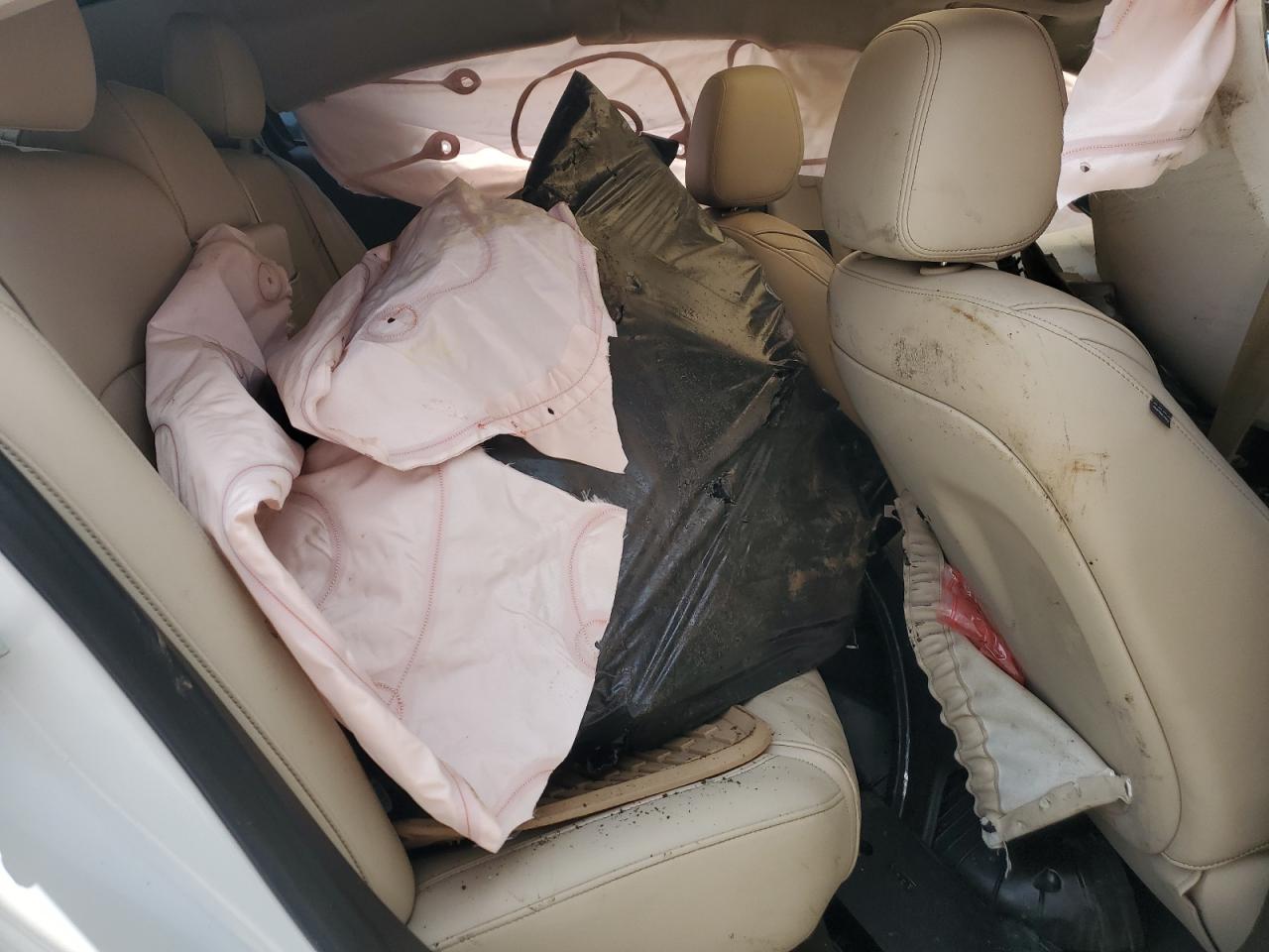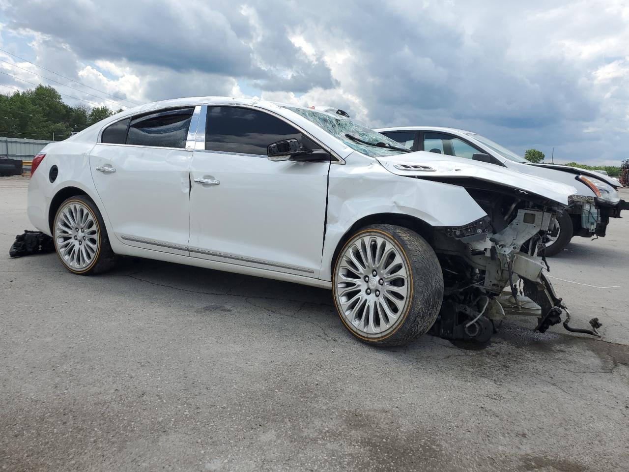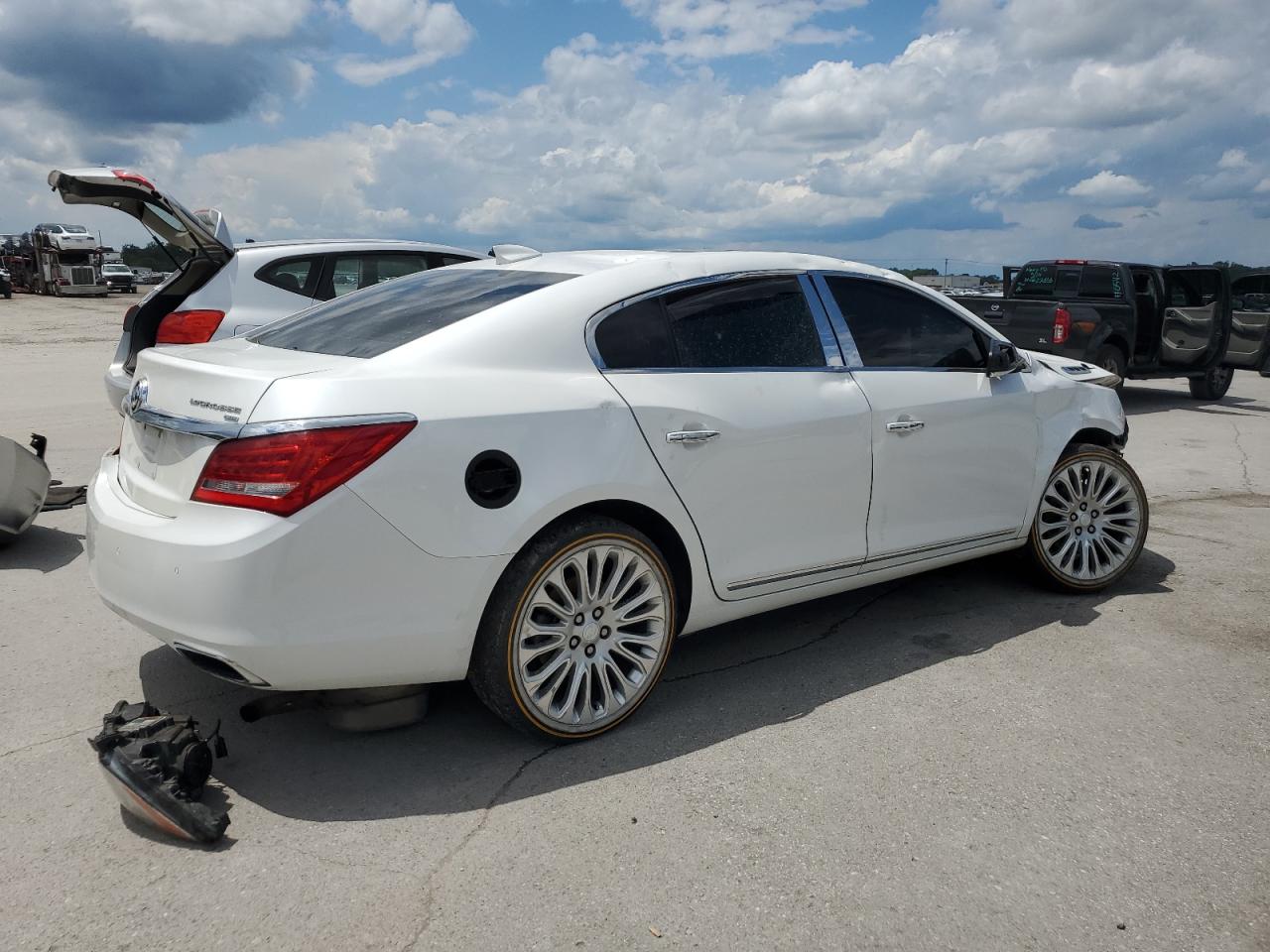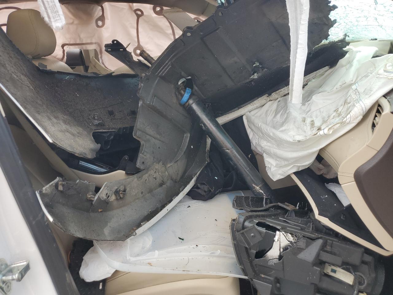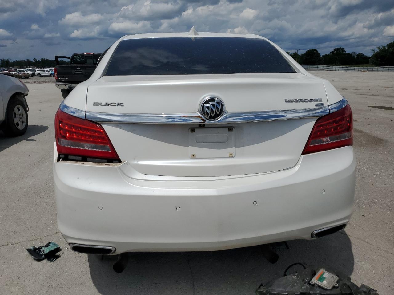 PoorThe 2016 BUICK LACROSSE P exhibits severe collision damage. The white exterior shows significant body panel damage throughout, including the front end, sides, and rear. The wheels appear to be damaged and out of alignment. The lights and glasses are damaged as well. The interior shows extensive damage, with deployed airbags and visible structural damage.