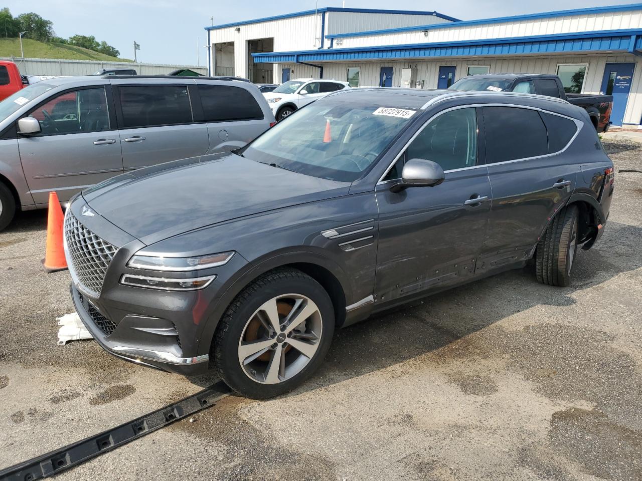 GoodThe 2021 Genesis GV80 BASE, a gray SUV, exhibits body damage on the side, indicating a 'Body' Vehicle Damage Category. The car is drivable, with no apparent damage to the wheels, lights, or glasses. The interior appears to be in good condition, and there is no visible damage to the airbags. The car has moderate visible damage requiring some repair.