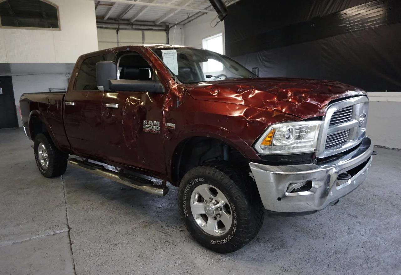 Good2017 RAM 2500 LARAM in burgundy. The vehicle's exterior exhibits cosmetic damage, primarily to the body panels. It is drivable, and the interior shows minimal wear. The car is in good overall condition, suitable for repair, and is verified as Run & Drive.