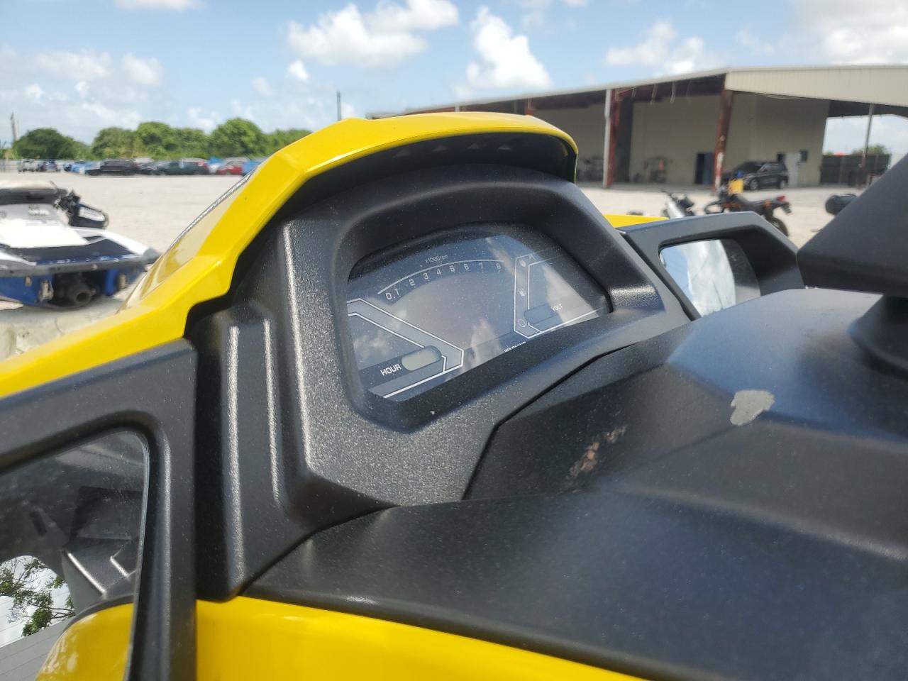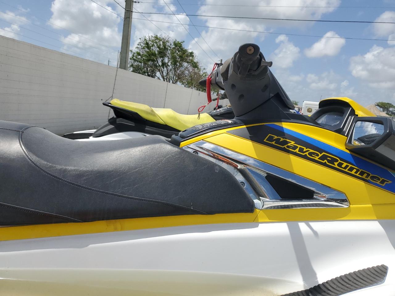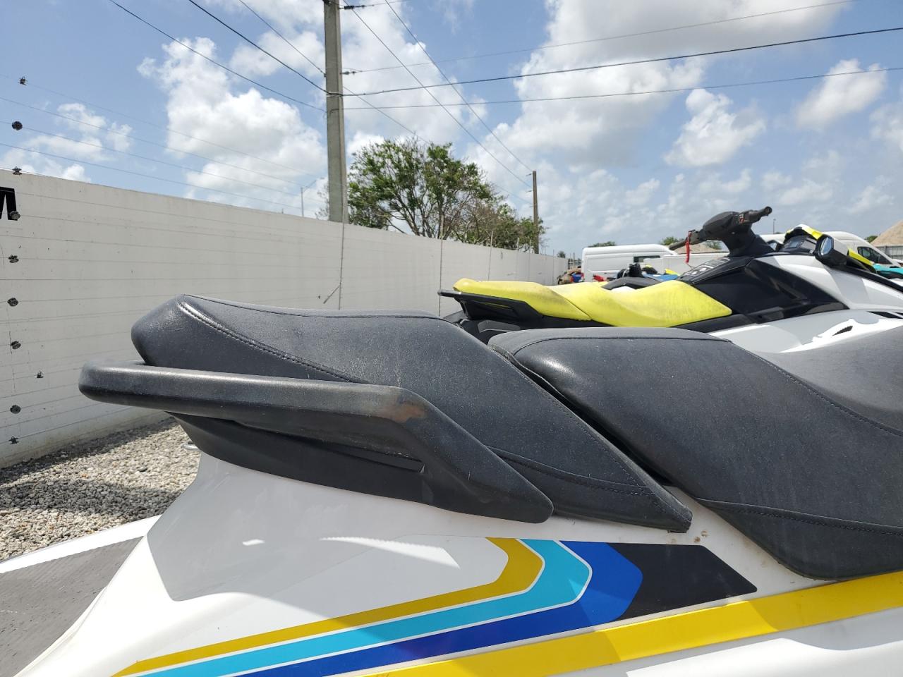The jetski has cosmetic damage, specifically minor dents and scratches on the body. There is no significant damage to the frame or mechanical components. Interior condition is well-maintained. The wheels and lights appear to be in good condition.