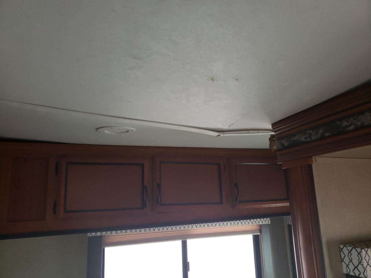 The RV exhibits damage primarily on the roof, suggesting potential water damage. The exterior shows signs of wear, but the wheels, lights, and glasses appear to be intact. The interior appears to have moderate wear and tear. Overall, the vehicle requires repair.