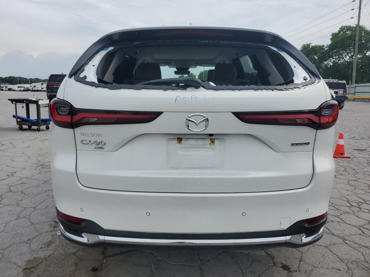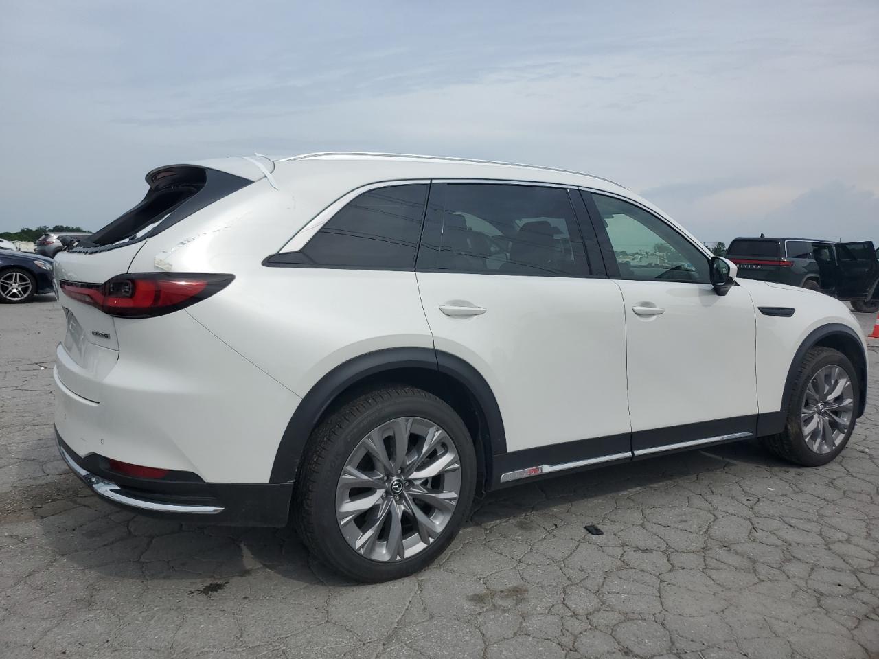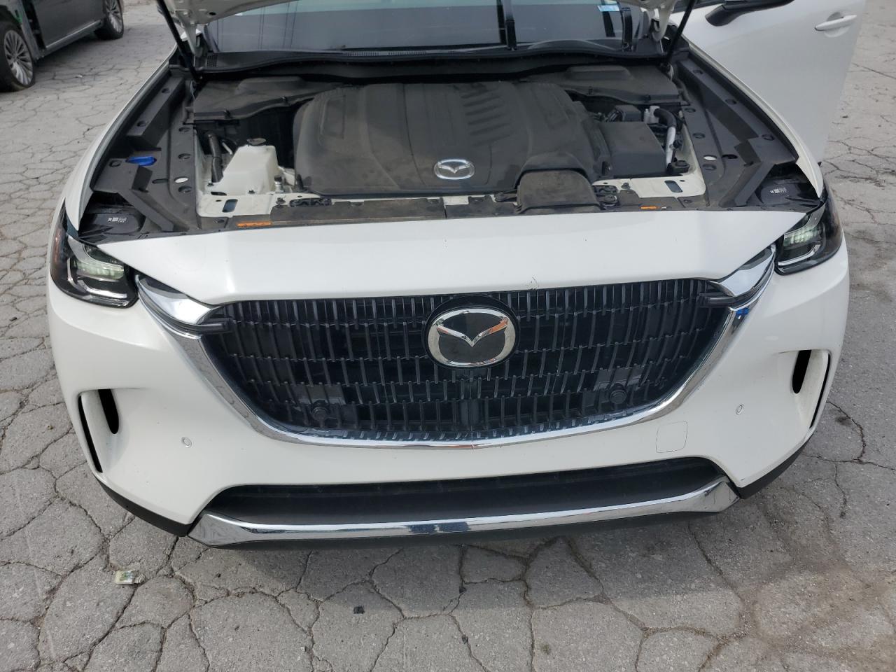 FairThe MAZDA CX-90 PREM 2024 exhibits damage. The primary damage is located in the REAR END, and secondary damage is due to HAIL. The car is white and has a Run & Drive Verified start code.