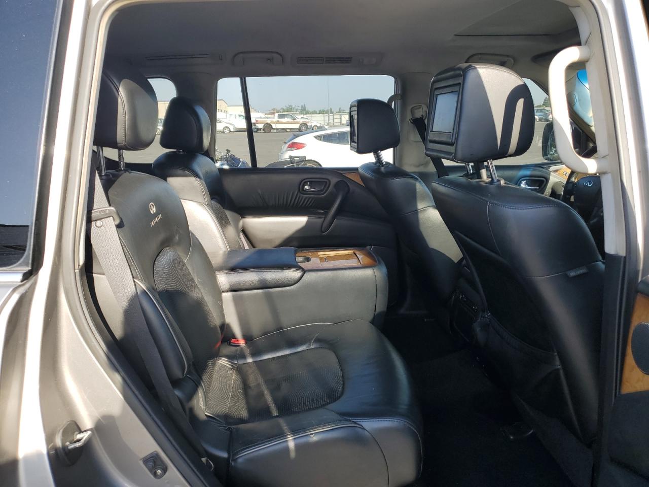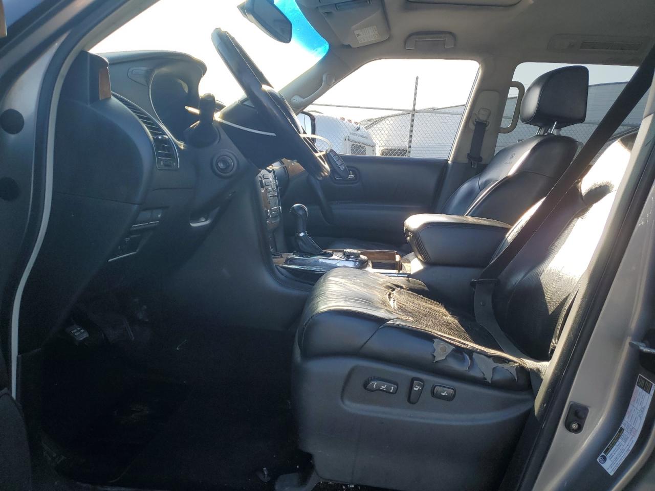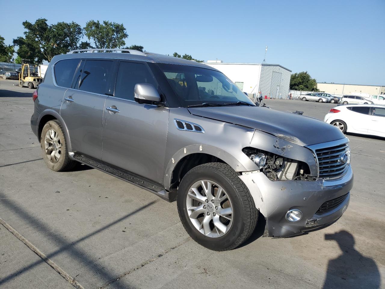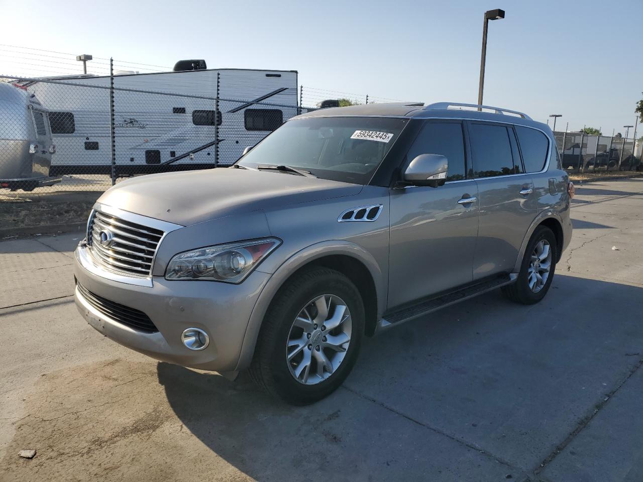 FairINFINITI QX56 2013, gray, with Run & Drive Verified start code. Primary damage: FRONT END, secondary: REAR END. The vehicle shows damage to the front and rear ends. The front end has significant damage, including the bumper, lights, and possibly the hood. The rear end shows visible damage as well. The vehicle's interior appears to have wear and tear. The wheels seem to be in decent condition, but the overall state is affected by the significant body damage. The airbags status is not visible from the images.