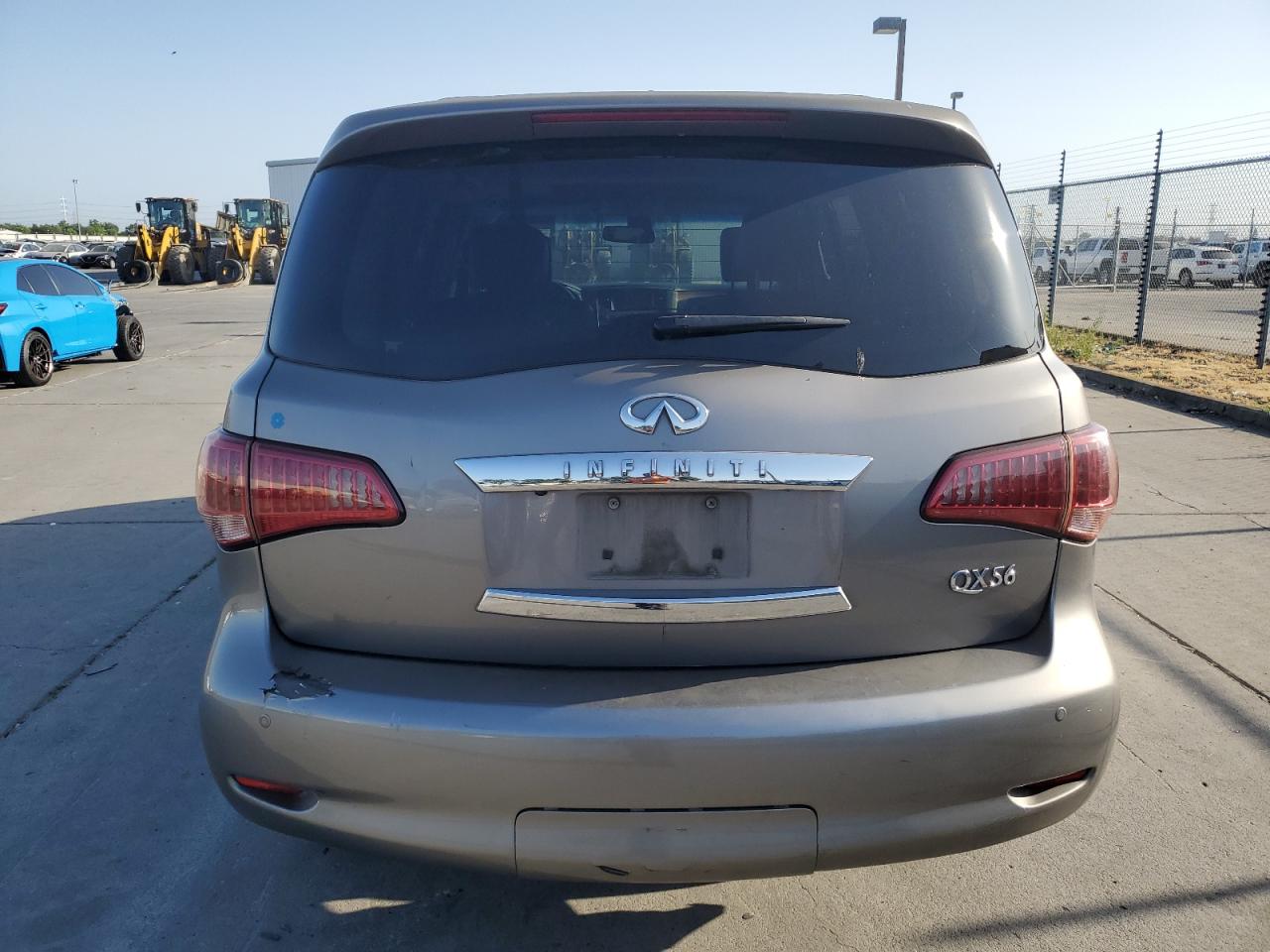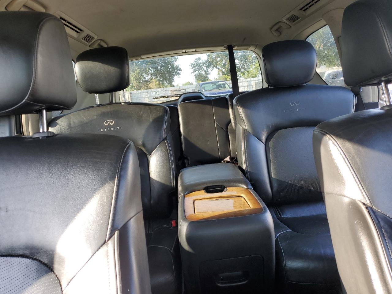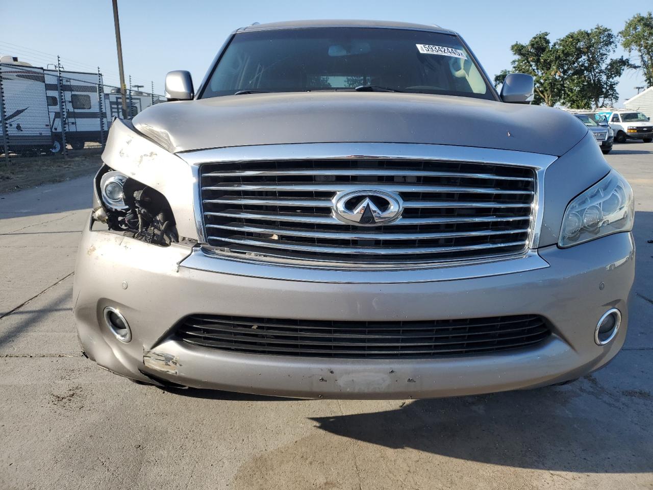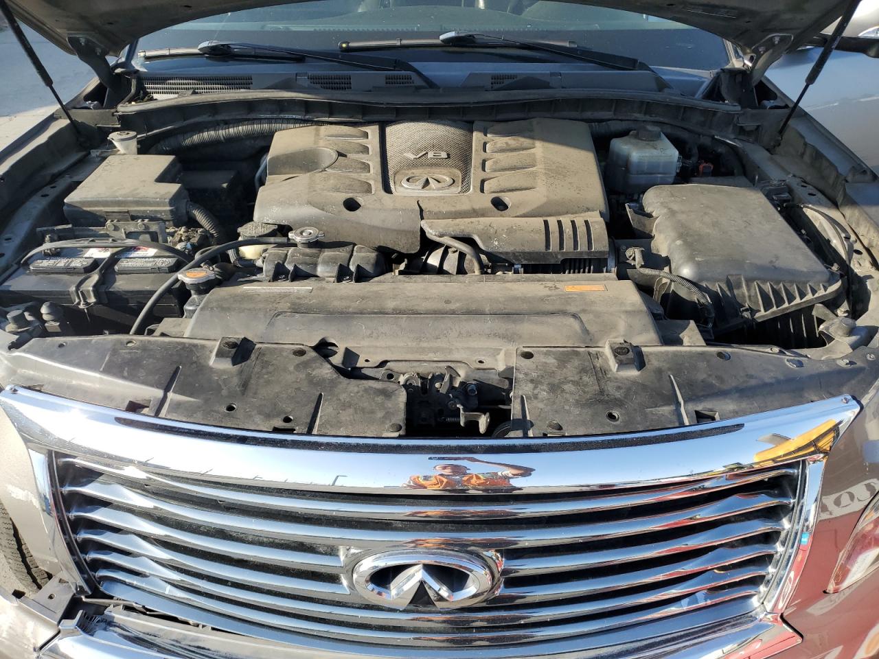 FairINFINITI QX56 2013, gray, with Run & Drive Verified start code. Primary damage: FRONT END, secondary: REAR END. The vehicle shows damage to the front and rear ends. The front end has significant damage, including the bumper, lights, and possibly the hood. The rear end shows visible damage as well. The vehicle's interior appears to have wear and tear. The wheels seem to be in decent condition, but the overall state is affected by the significant body damage. The airbags status is not visible from the images.