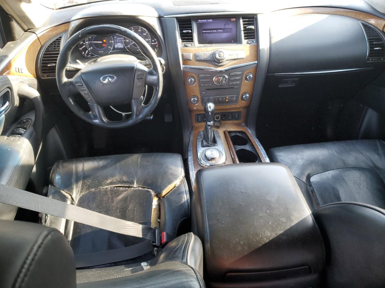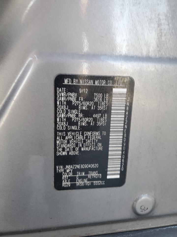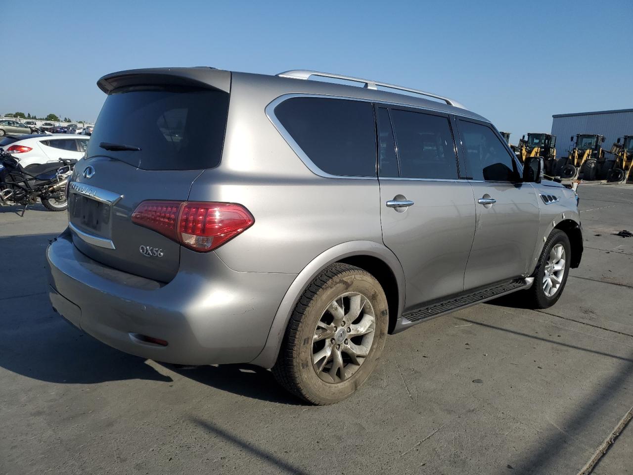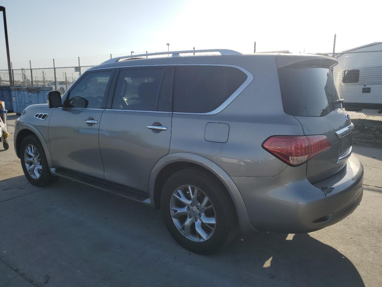 FairINFINITI QX56 2013, gray, with Run & Drive Verified start code. Primary damage: FRONT END, secondary: REAR END. The vehicle shows damage to the front and rear ends. The front end has significant damage, including the bumper, lights, and possibly the hood. The rear end shows visible damage as well. The vehicle's interior appears to have wear and tear. The wheels seem to be in decent condition, but the overall state is affected by the significant body damage. The airbags status is not visible from the images.