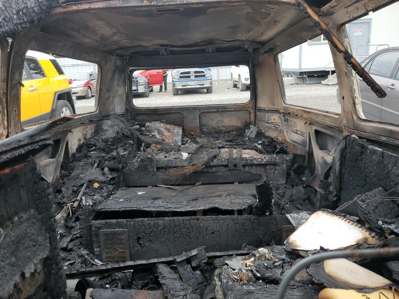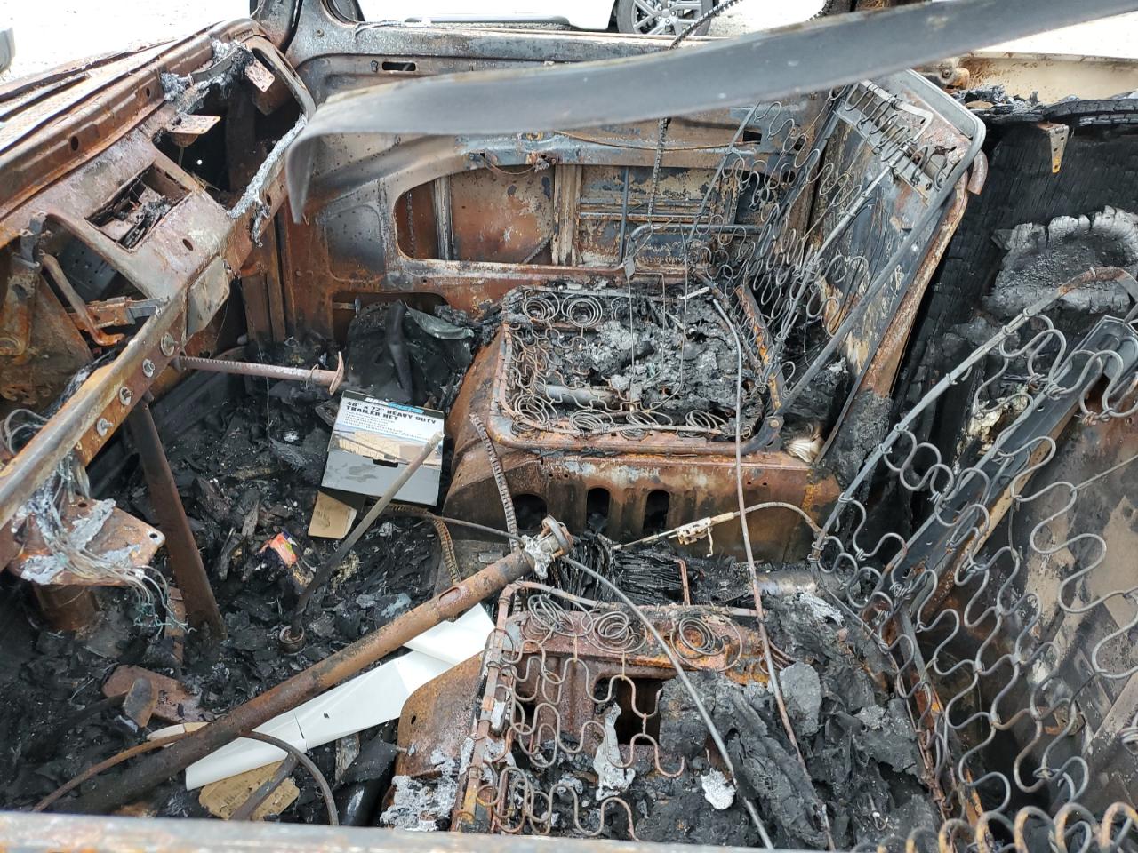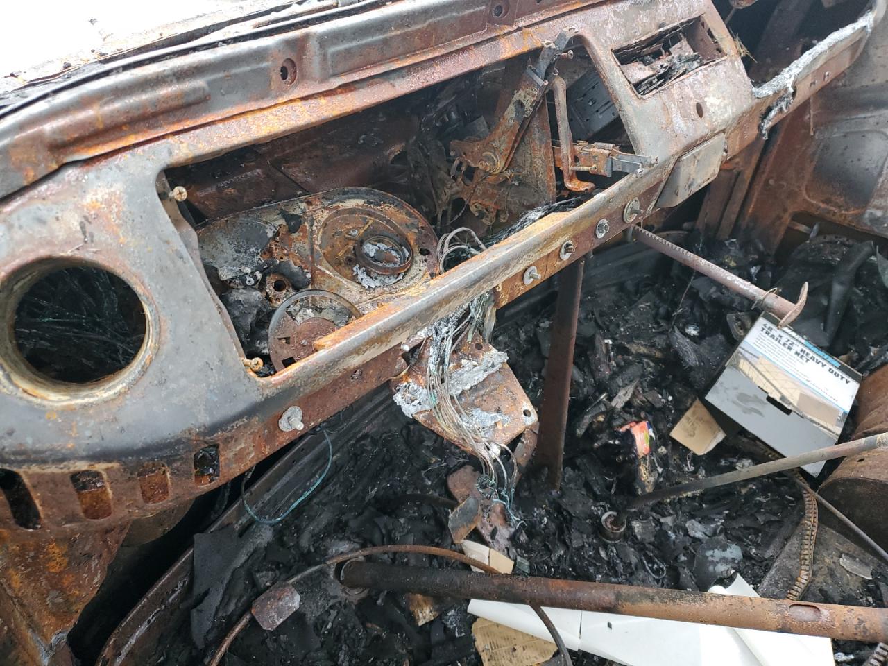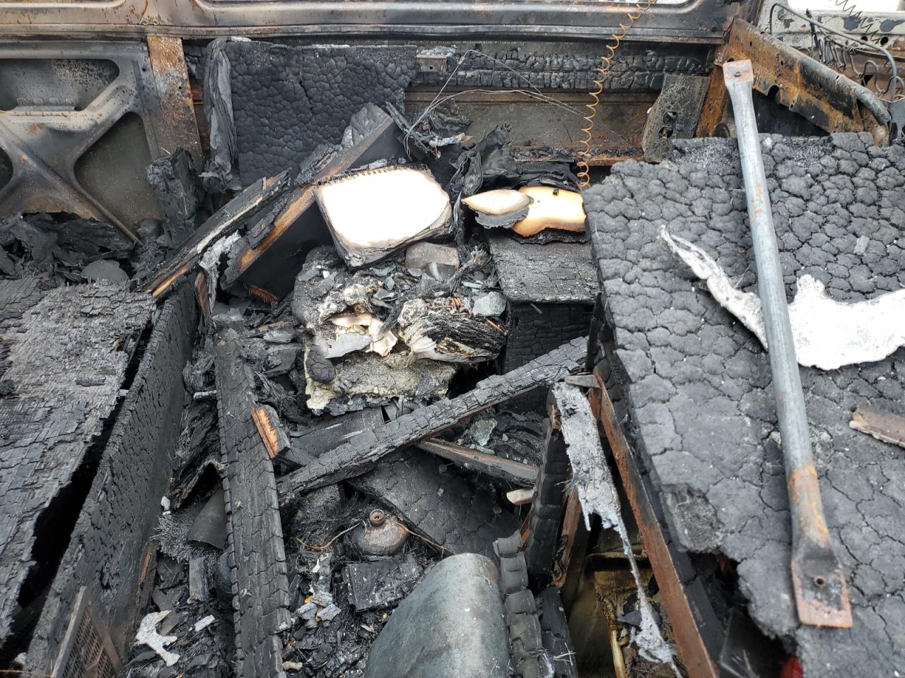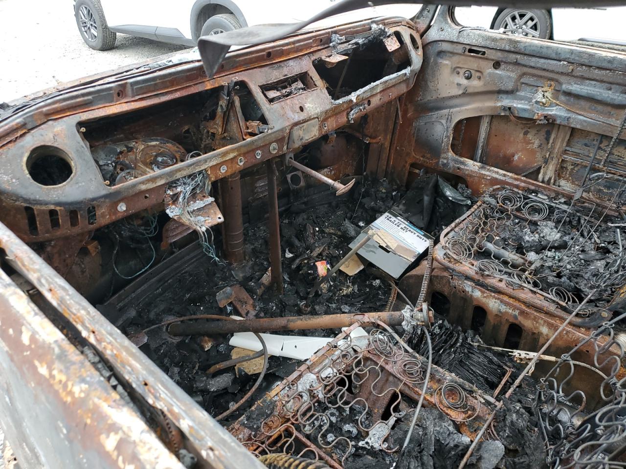 The vehicle has extensive fire damage, affecting both the exterior and interior. The body panels are heavily charred, and the paint is burnt off. The interior is completely destroyed, with melted components and charred upholstery.