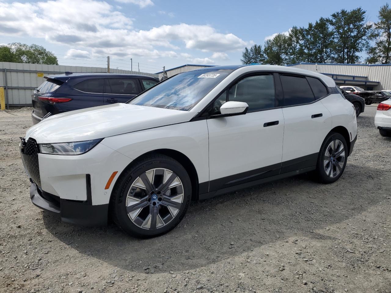 PoorThis is a white BMW iX xDrive50 from 2025. The primary damage is to the front end, with significant undercarriage damage. The car shows extensive damage including the front end crushed, wheels damaged, and significant body panel distortion, likely affecting lights and glasses. The interior has airbags deployed. Overall, the car is in poor condition. Vehicle Damage Category: Body. Summary: Damaged BMW iX, major front-end and undercarriage damage, crushed body panels, deployed airbags, poor condition.