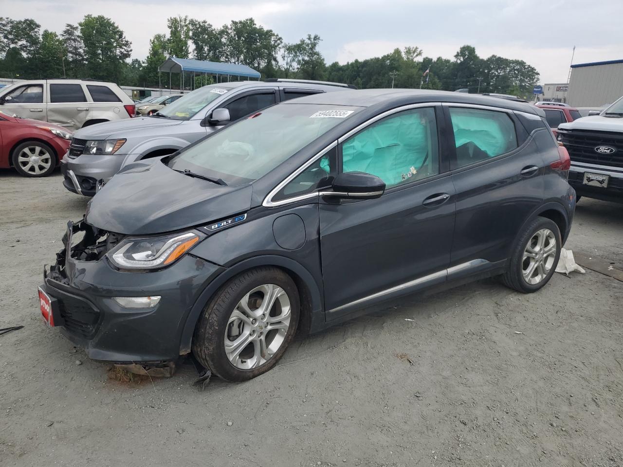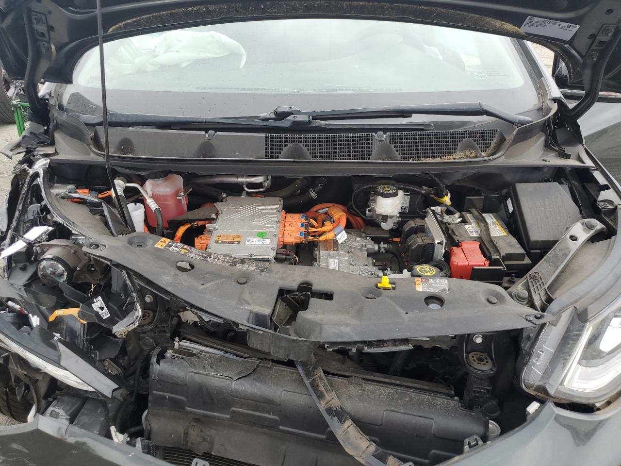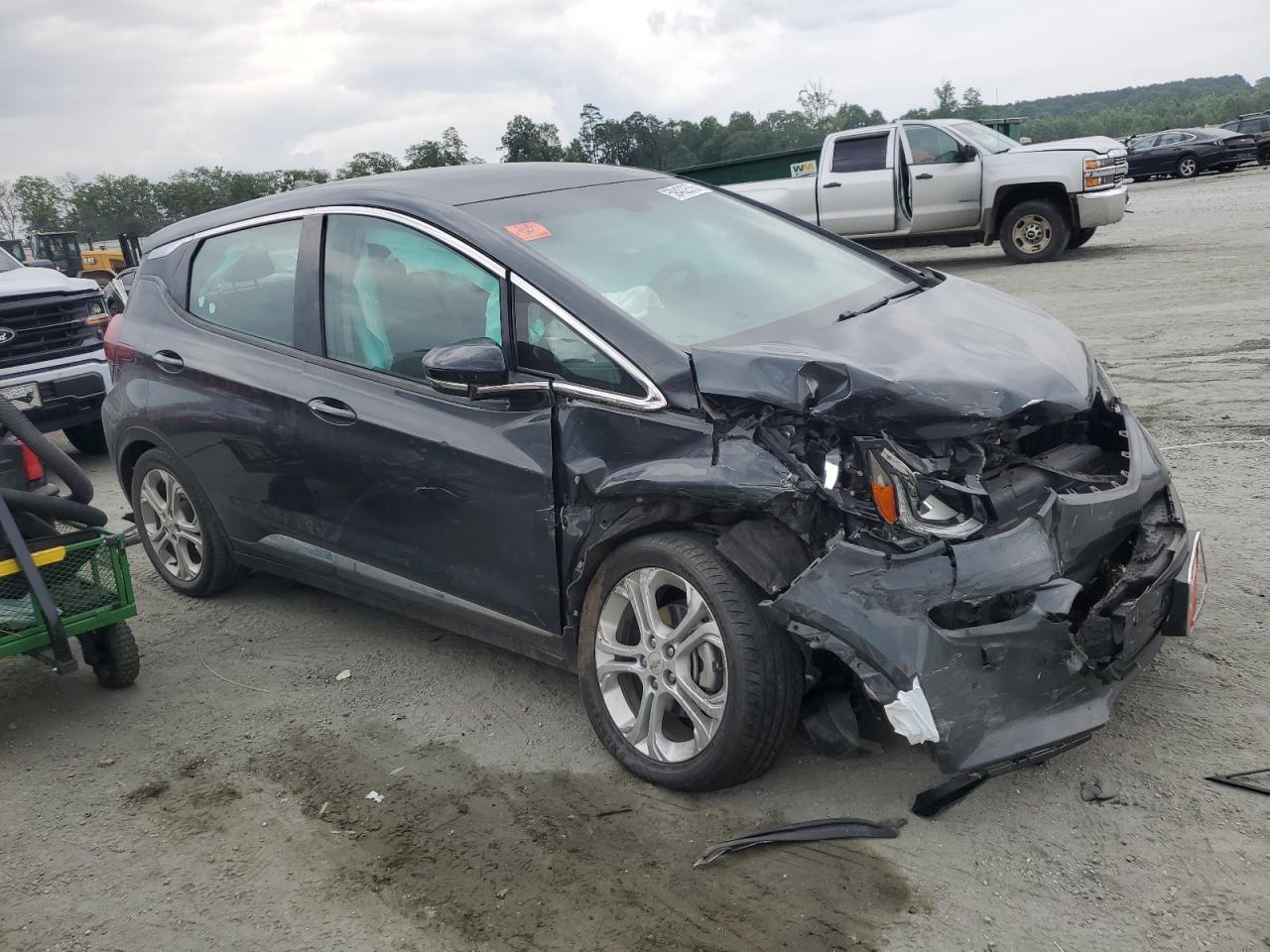FairThe CHEVROLET BOLT EV LT 2020, a gray electric hatchback, shows significant front-end damage in multiple images, indicating a serious collision. The front is extensively damaged with body panels crumpled and structural components compromised. The interior also appears to have suffered damage, possibly due to airbag deployment. The vehicle's wheels, lights, and glasses appear to be in salvageable condition, it can be inspected more carefully. This car likely needs considerable repair, affecting both its exterior and interior.