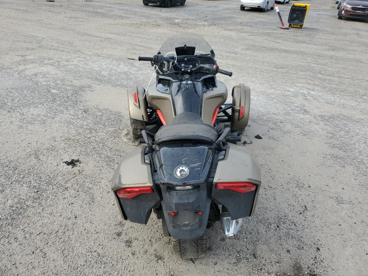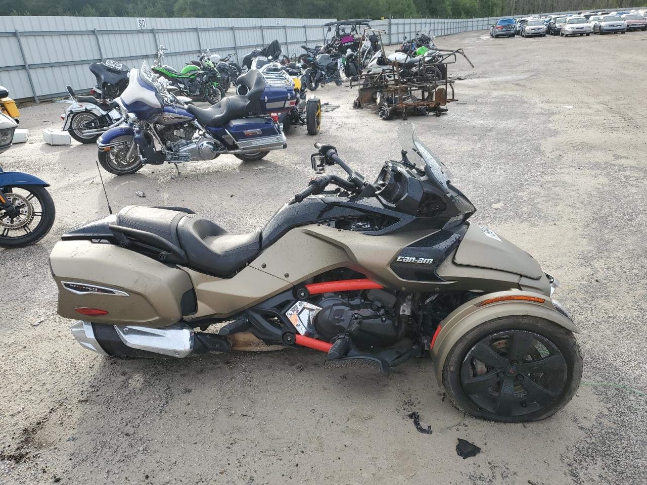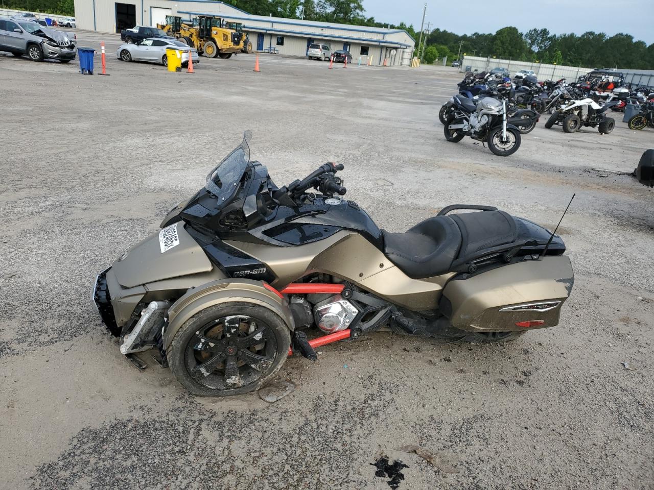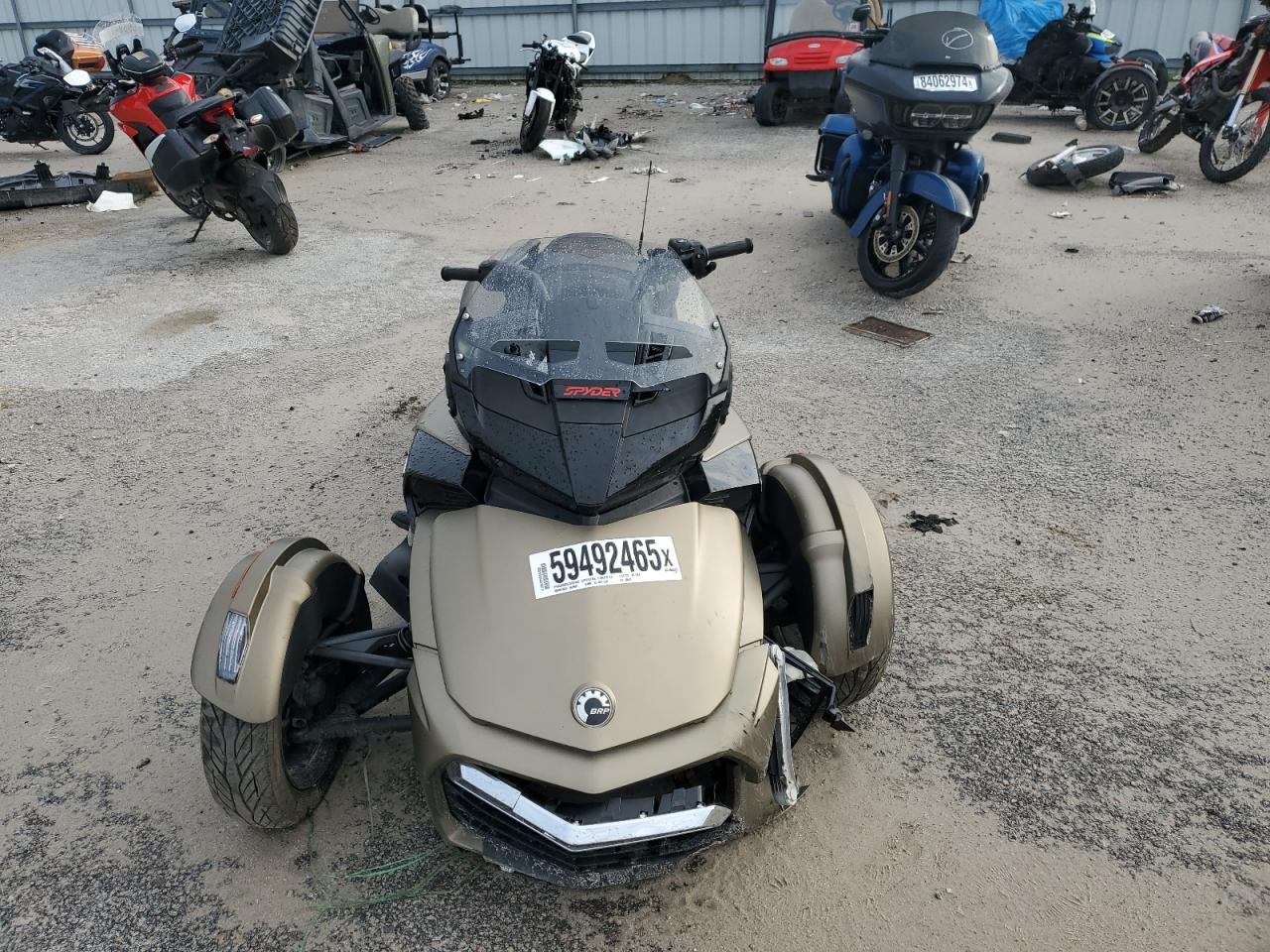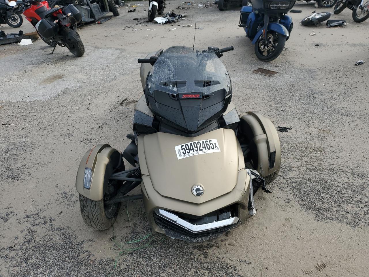 FairThe 2021 CAN-AM SPYDER ROADSTER is shown with significant front-end damage and some undercarriage damage. The gold-colored trike has visible damage to the front body panels, and the wheels show signs of impact. The lights and glasses appear to have damage and the car might not be drivable. It requires considerable repair. Interior condition is good. Airbags are not visible, but a thorough inspection is recommended. Overall damage is moderate, and it requires repair.