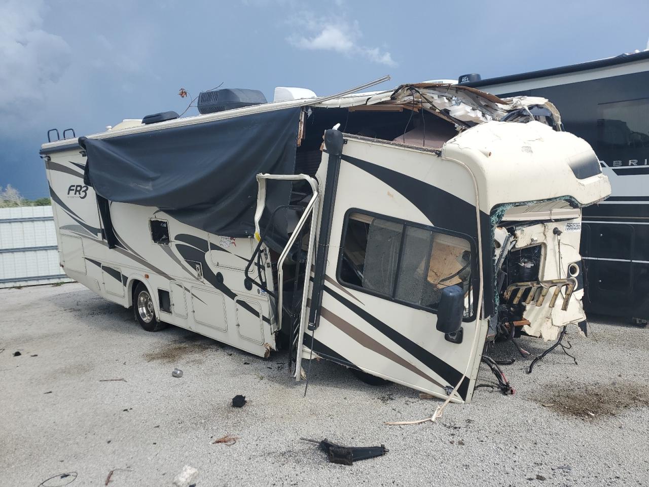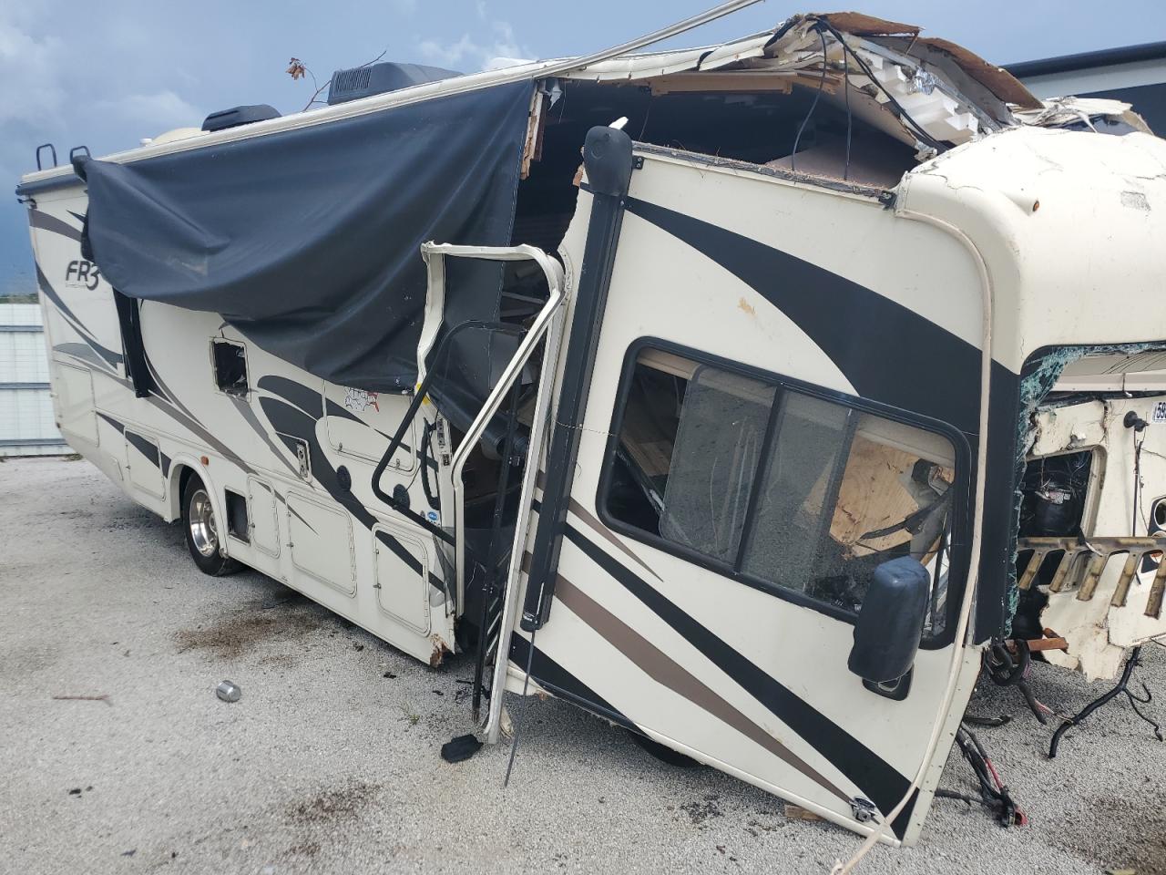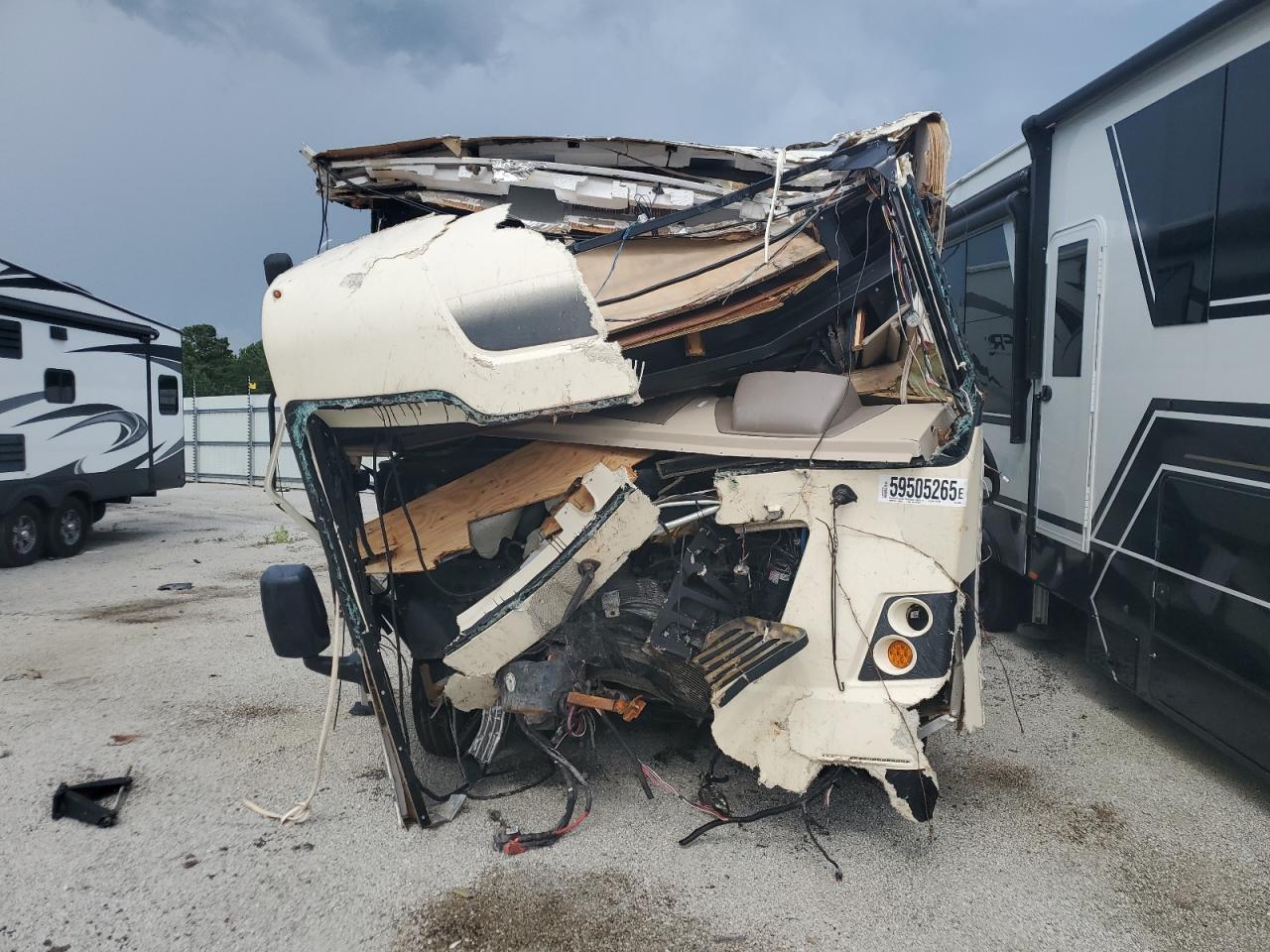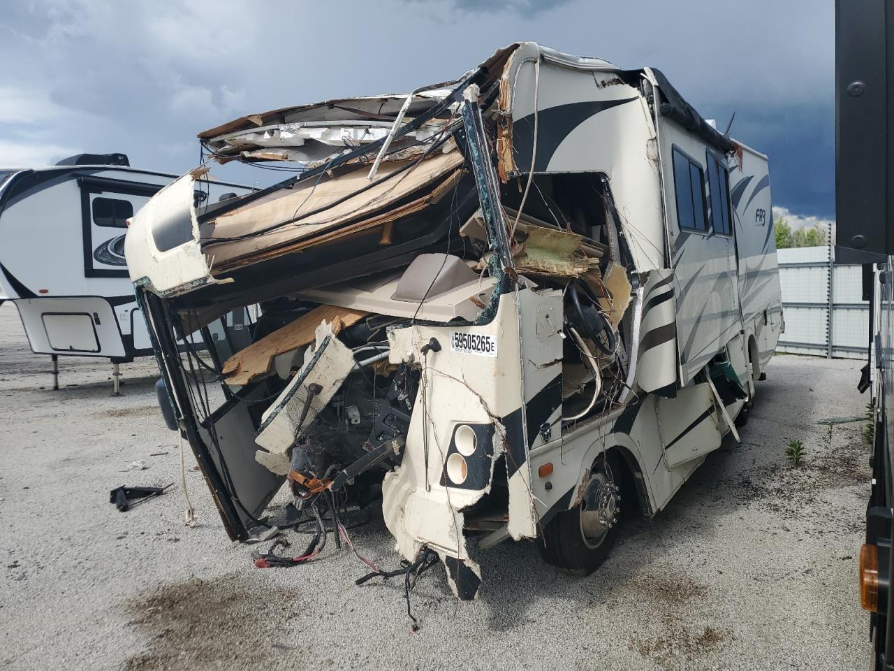 Severe front-end and side damage to a FORD F53 RV. The front end is completely crushed, and the roof is partially caved in. The side has significant damage. The wheels are present, but the vehicle is likely not drivable. Interior damage is evident, and the airbag condition is unknown.