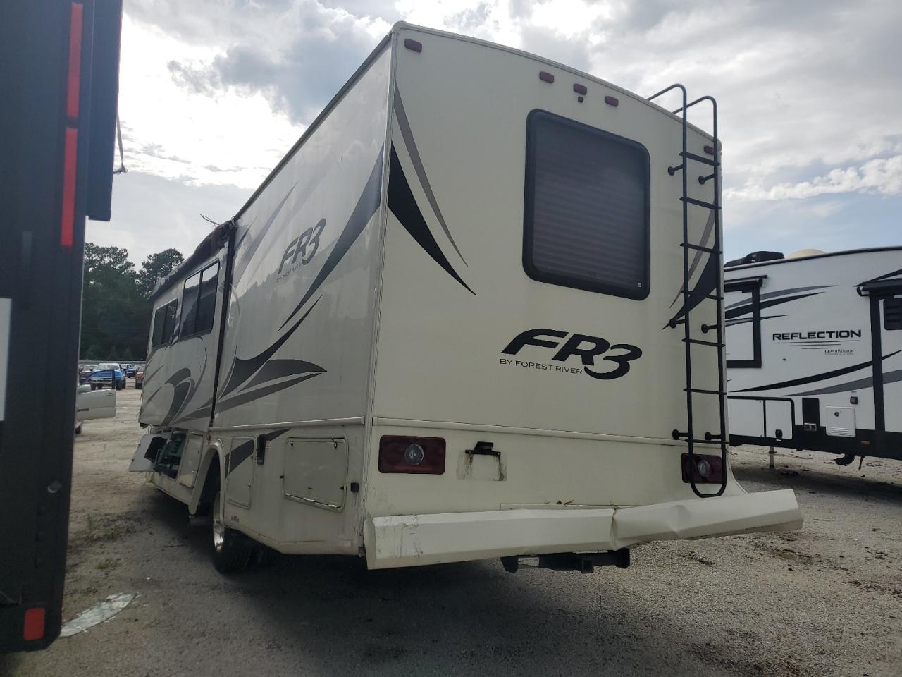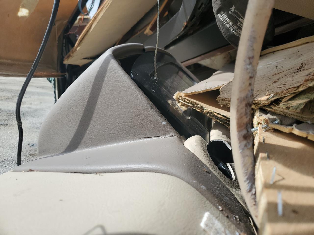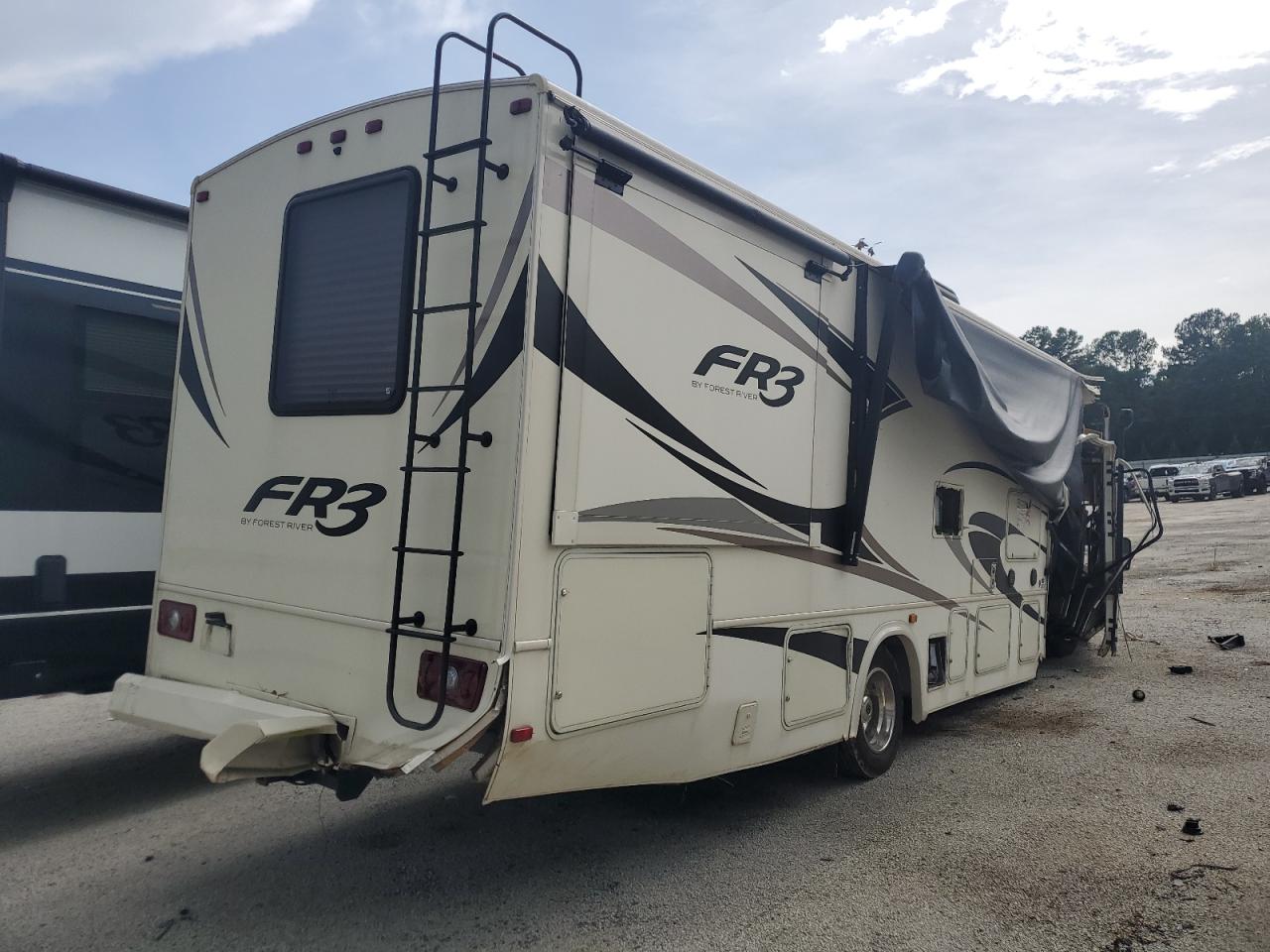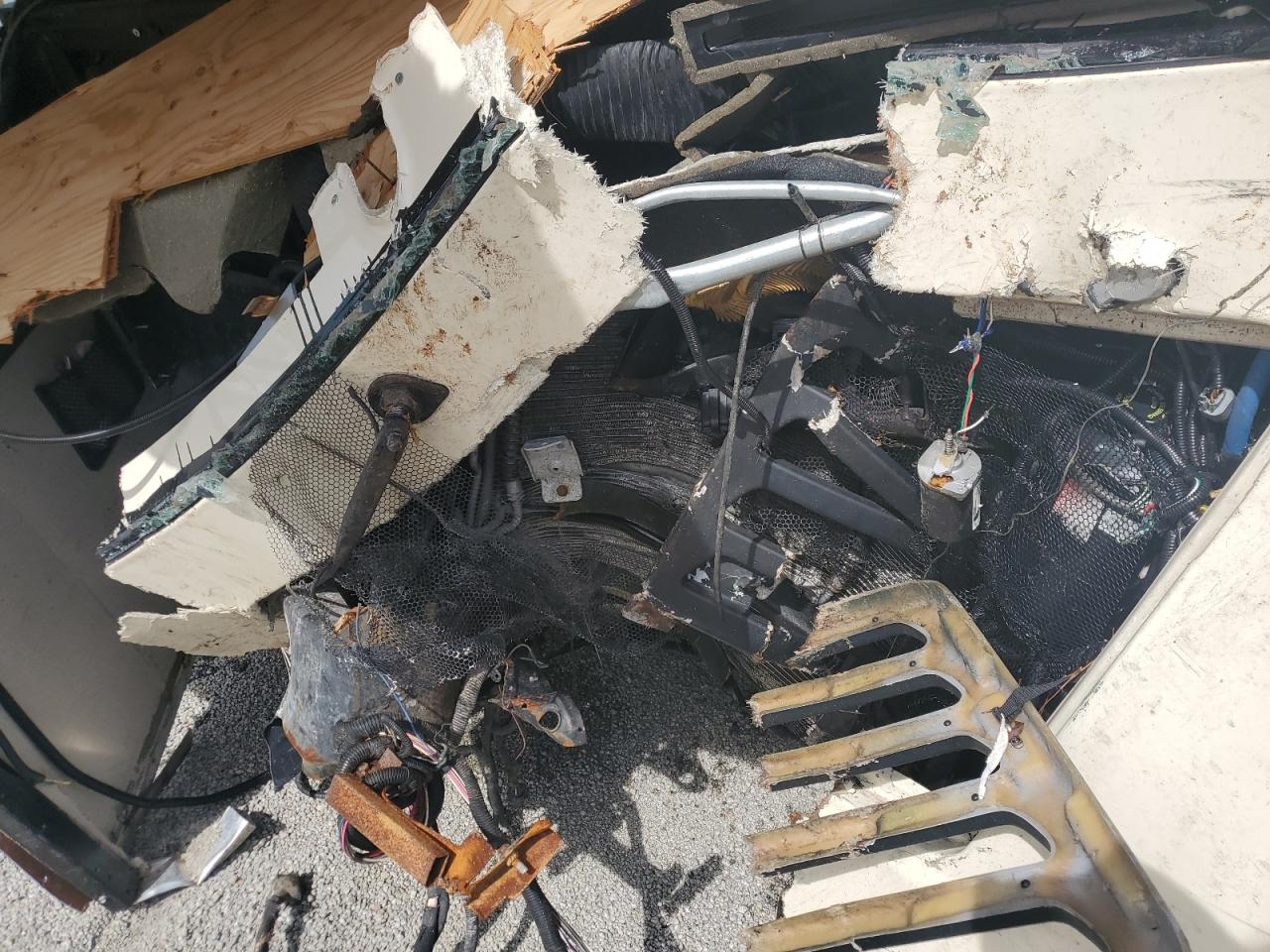 Severe front-end and side damage to a FORD F53 RV. The front end is completely crushed, and the roof is partially caved in. The side has significant damage. The wheels are present, but the vehicle is likely not drivable. Interior damage is evident, and the airbag condition is unknown.