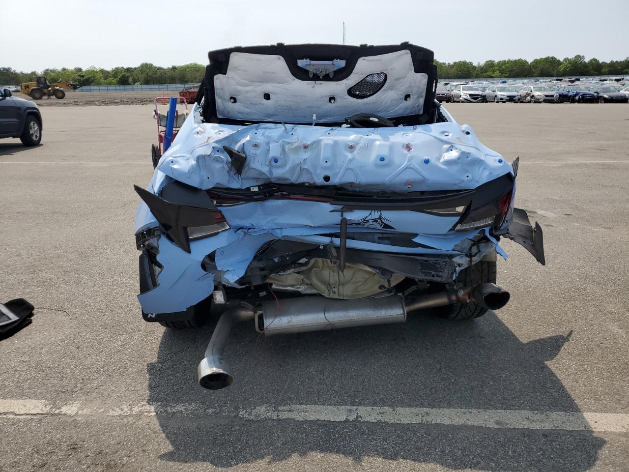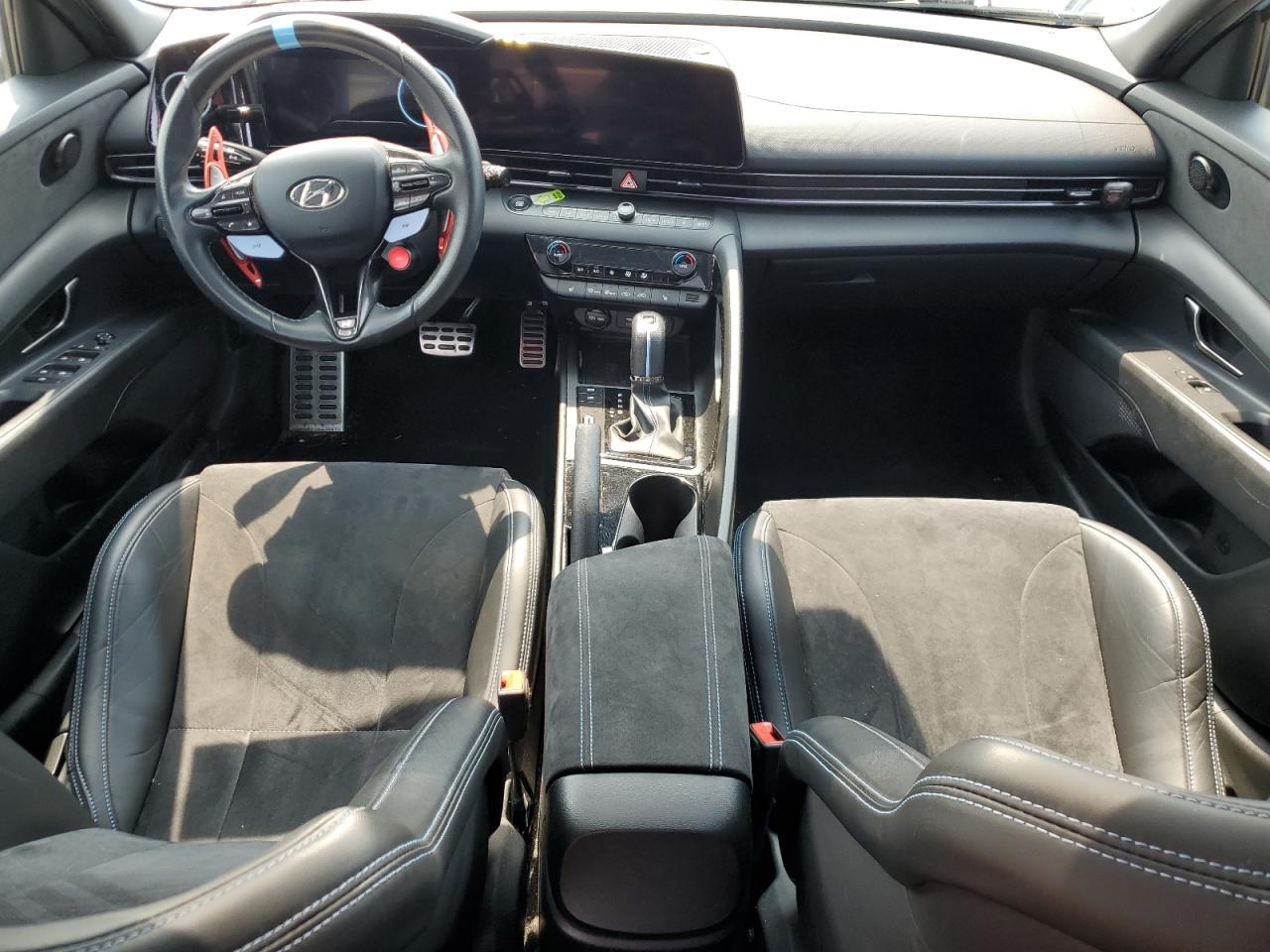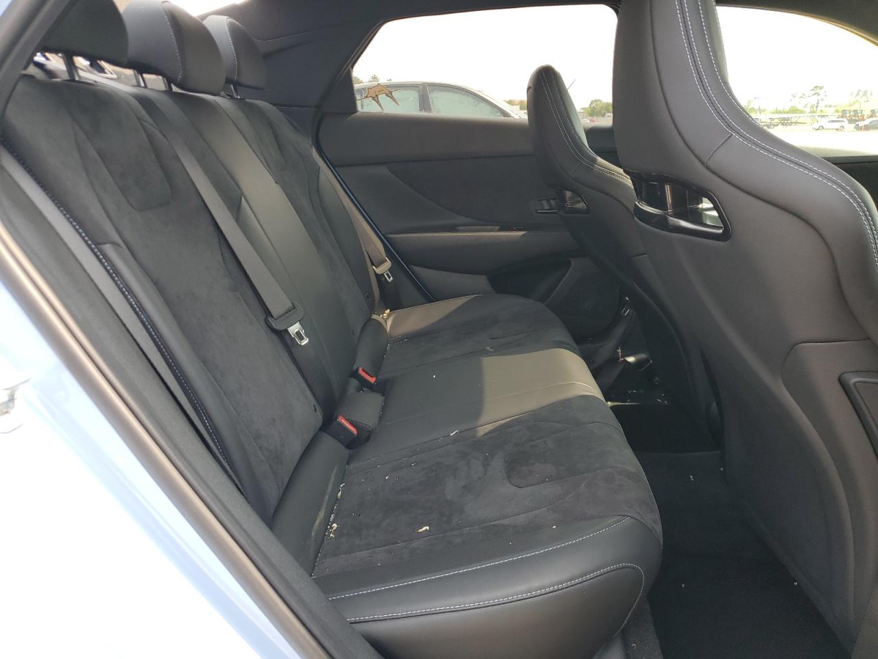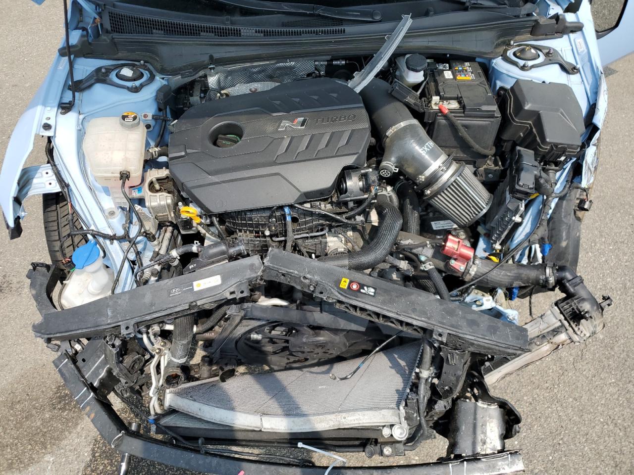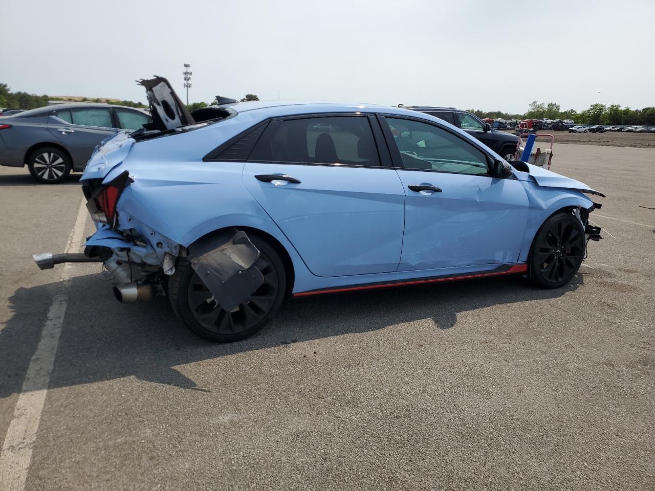 PoorThis is a 2022 HYUNDAI ELANTRA N. The vehicle has sustained significant damage to both the front and rear ends. The car is light blue with black wheels. The interior appears to have some wear and tear but is in better condition than the exterior.
