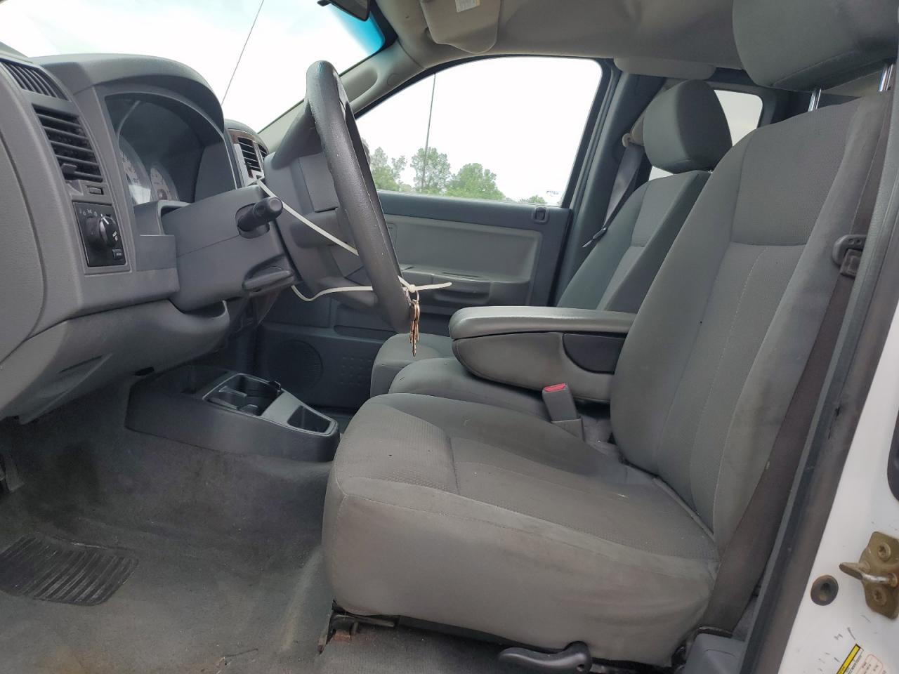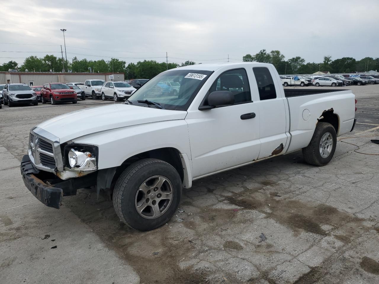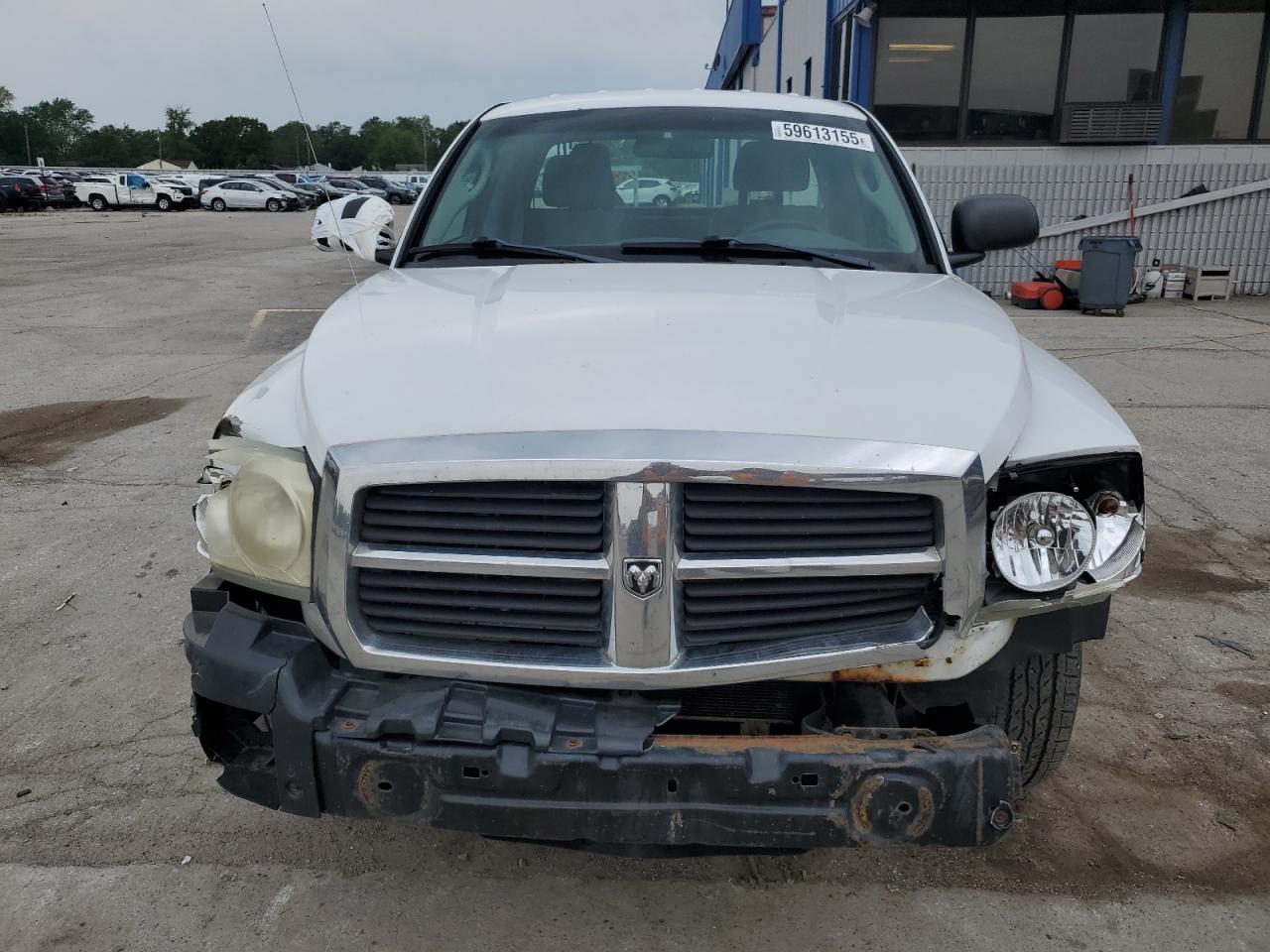 Fair2005 DODGE DAKOTA SLT. This white pickup truck exhibits significant front-end and side damage, indicating a Body vehicle damage category. Despite the cosmetic issues, the interior appears to be in relatively good condition. The vehicle is listed as Run & Drive Verified.