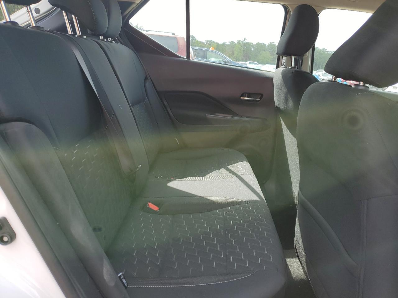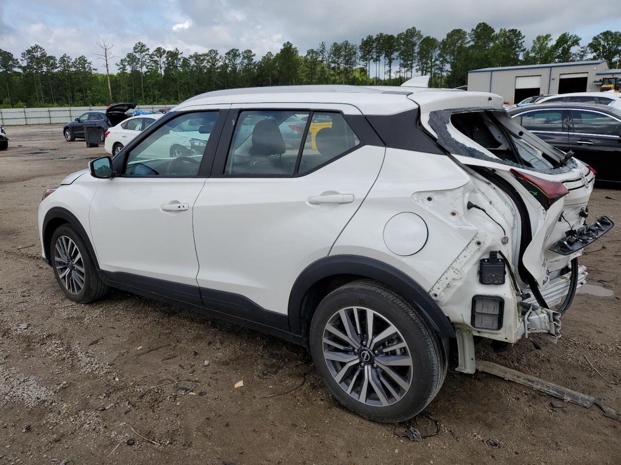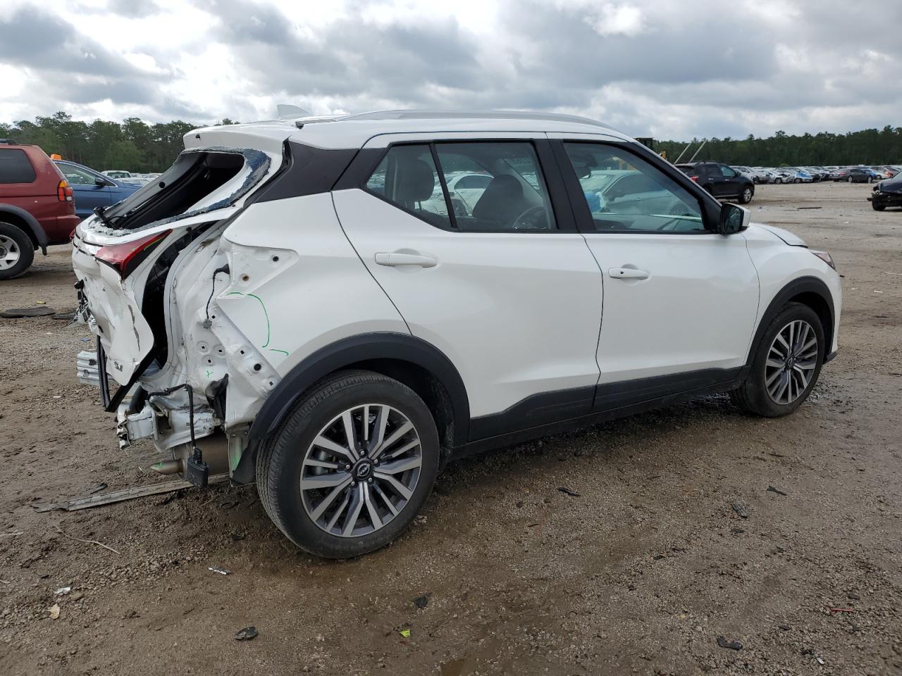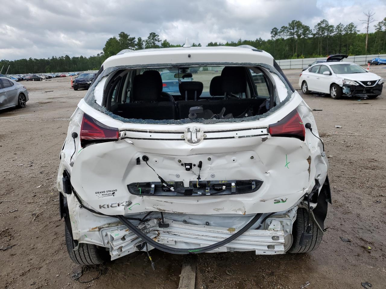 FairThe white 2023 Nissan Kicks SV has sustained significant rear-end damage. The vehicle's exterior shows substantial damage to the rear, including body panel deformation. The interior appears to be in relatively good condition with normal wear and tear. The vehicle is noted as 'Run & Drive Verified'.