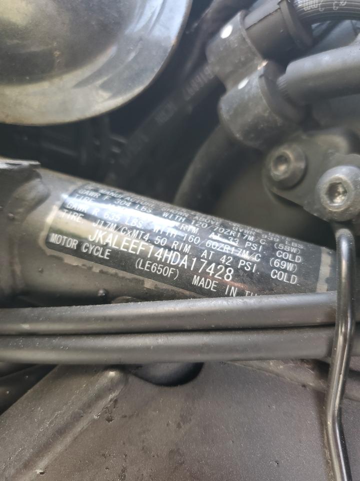 GoodThe KAWASAKI KLE650 F 2017, black in color, exhibits front-end damage, categorized as Body damage with the start code Run & Drive Verified. The vehicle appears to be drivable despite the damage. Interior damage isn't noted.