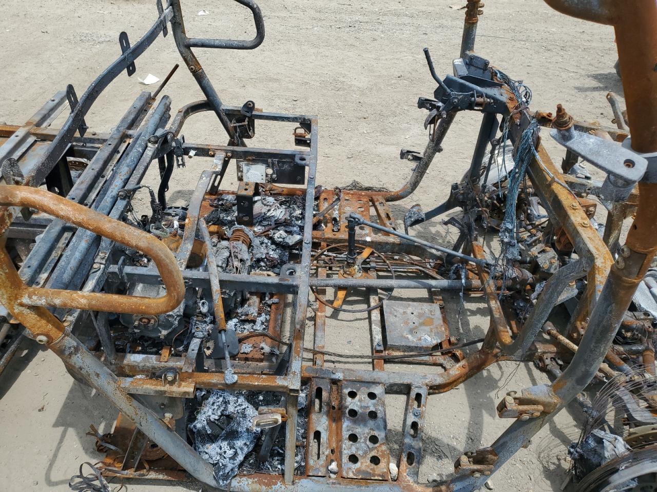 Burn damage across entire vehicle, with no remaining exterior panels, lights or glass, or interior parts. The airbags are not visible.