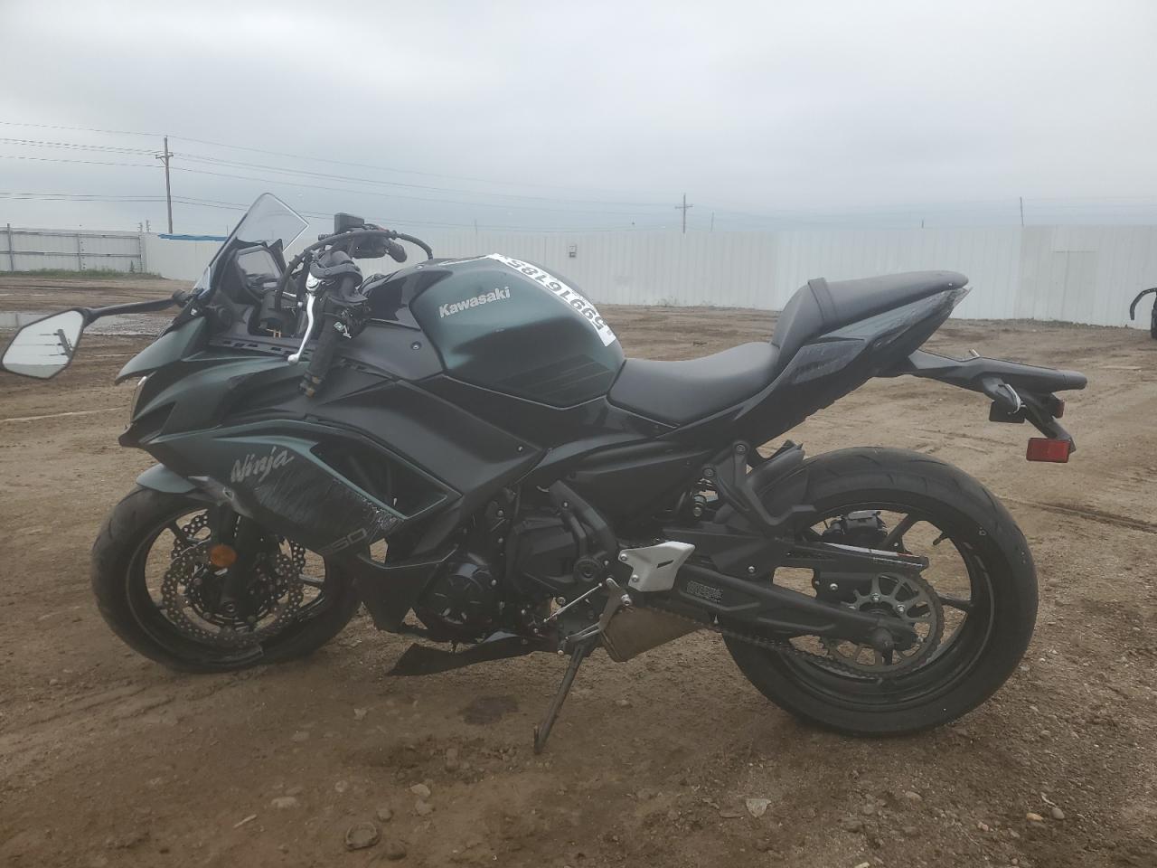 FairThis is a green KAWASAKI EX650 P 2025 motorcycle. The motorcycle has damage all over the body, with no other secondary damage. The paint is green. The motorcycle is drivable. The lights and glasses appear to be in good condition. The interior condition is good, with no apparent airbag deployment. The motorcycle requires some repair but is drivable. The wheel is fine.