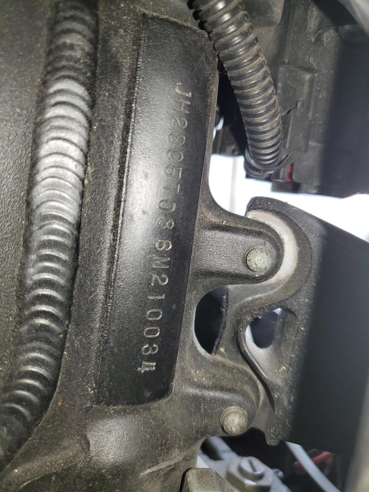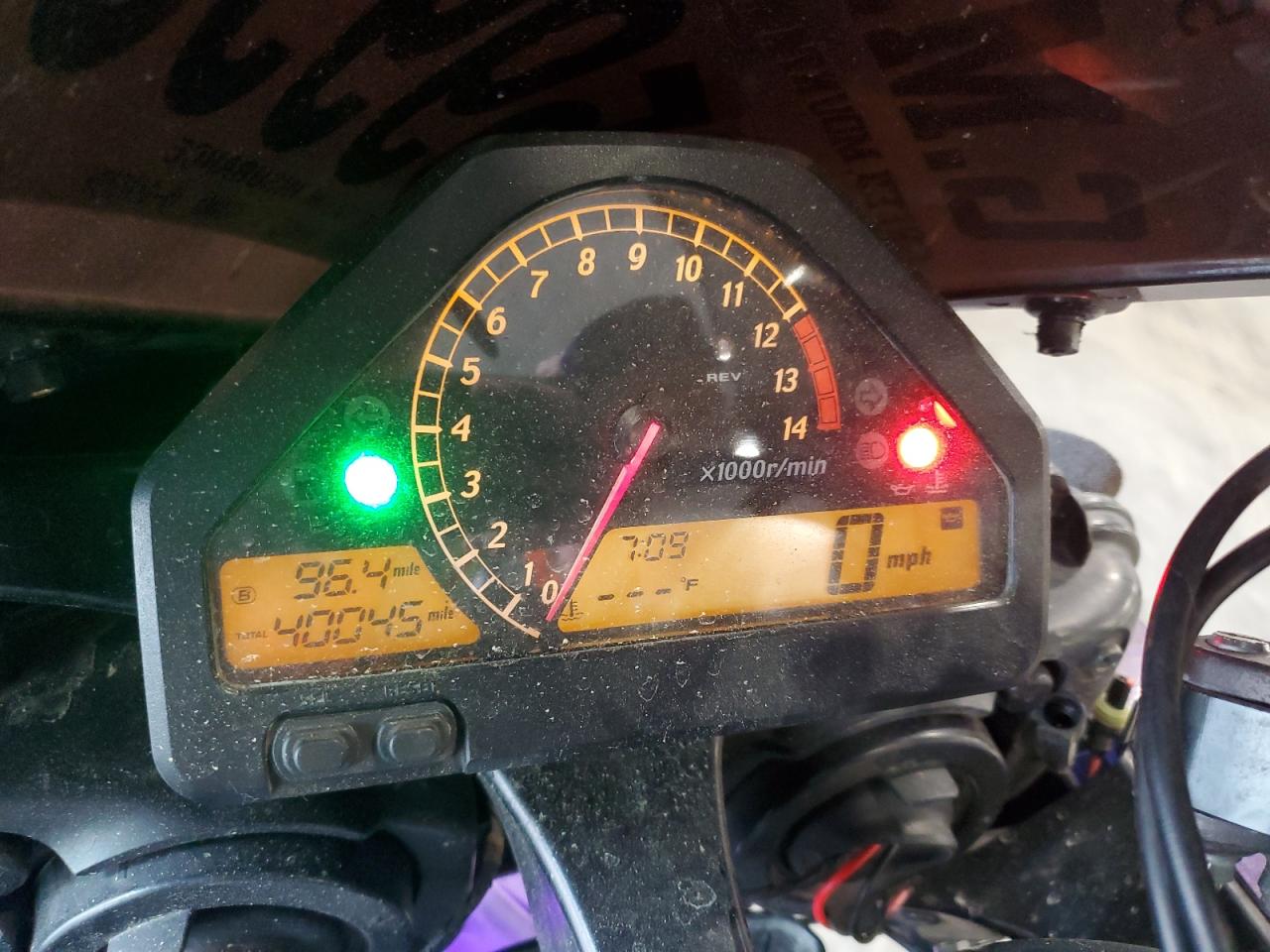 The front end of the motorcycle shows substantial damage, with visible impacts to the fairings, headlight area, and possibly the frame. The side has scratches and dents. The wheels appear to be dirty, and the windshield has some scratches. Overall, the motorcycle exhibits signs of wear and tear, with a visible damage pattern.