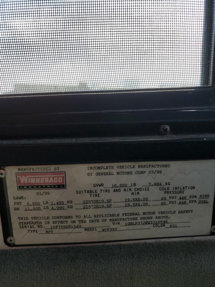 FairThis is a 1998 CHEVROLET P30 RV. The primary damage is to the TOP/ROOF. It starts, indicating the vehicle starts. The exterior is two-tone. The interior shows signs of wear consistent with its age and mileage. Overall, the vehicle needs some work.