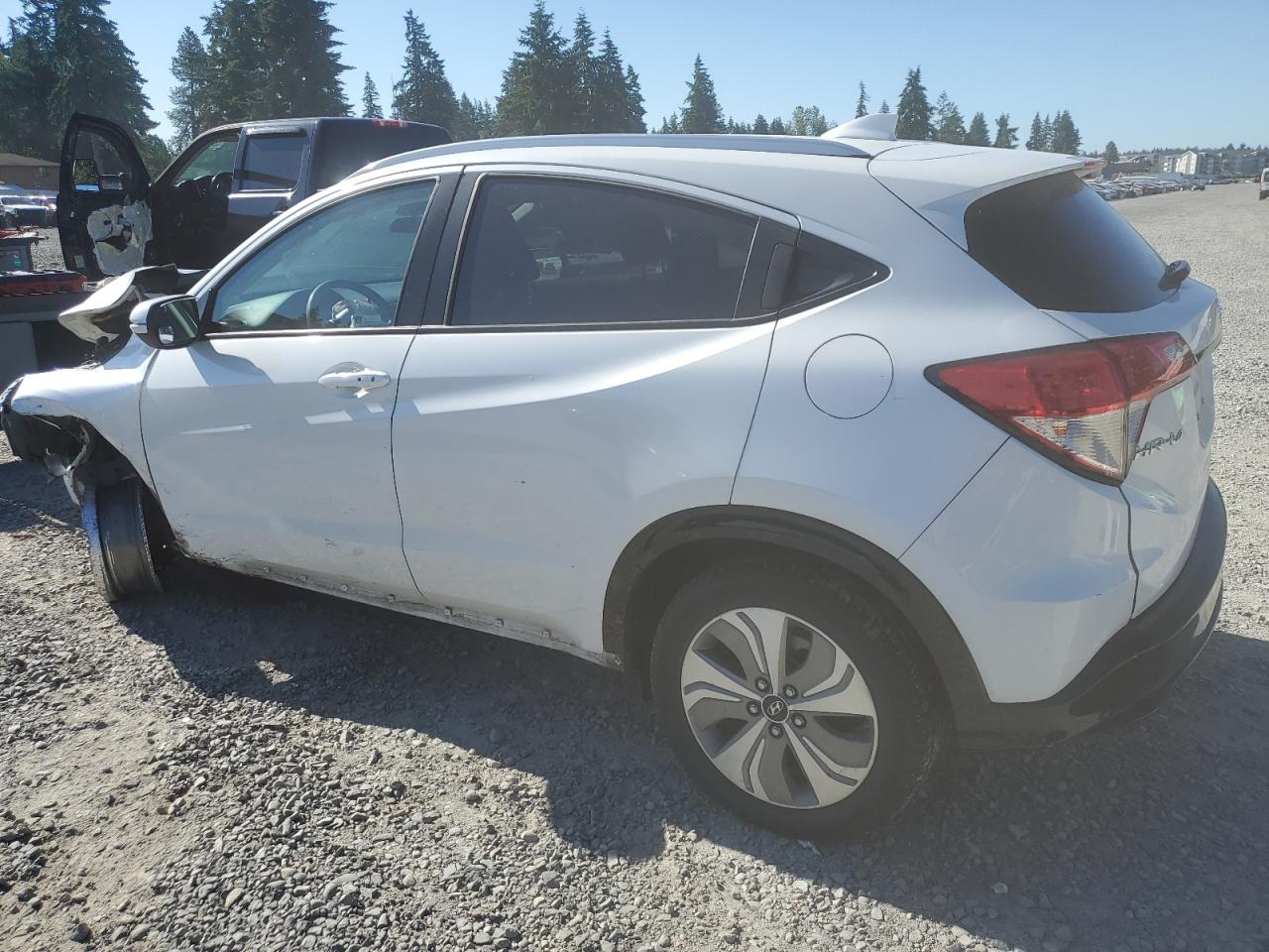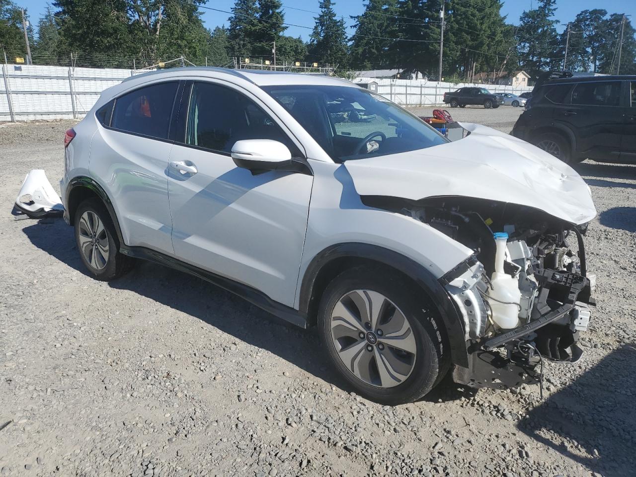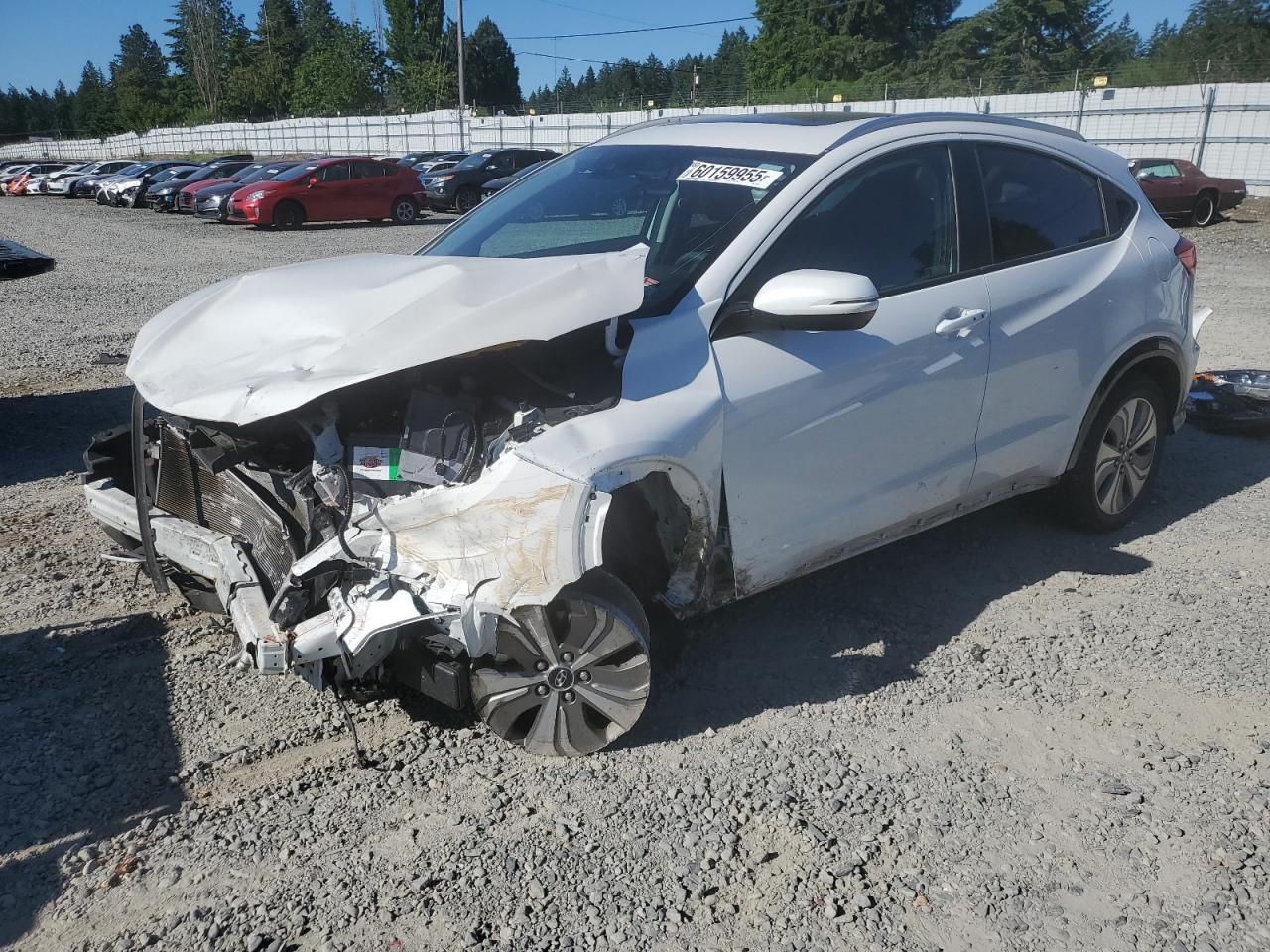 FairThe 2021 HONDA HR-V EX is a white subcompact SUV. This vehicle has sustained significant damage. The primary damage is to the front end, with secondary damage to the side. The car shows signs of a collision, with body panels and structural components affected. The wheels appear to be intact, but the lights and glasses are likely damaged due to the severity of the front-end impact. The airbags have deployed.