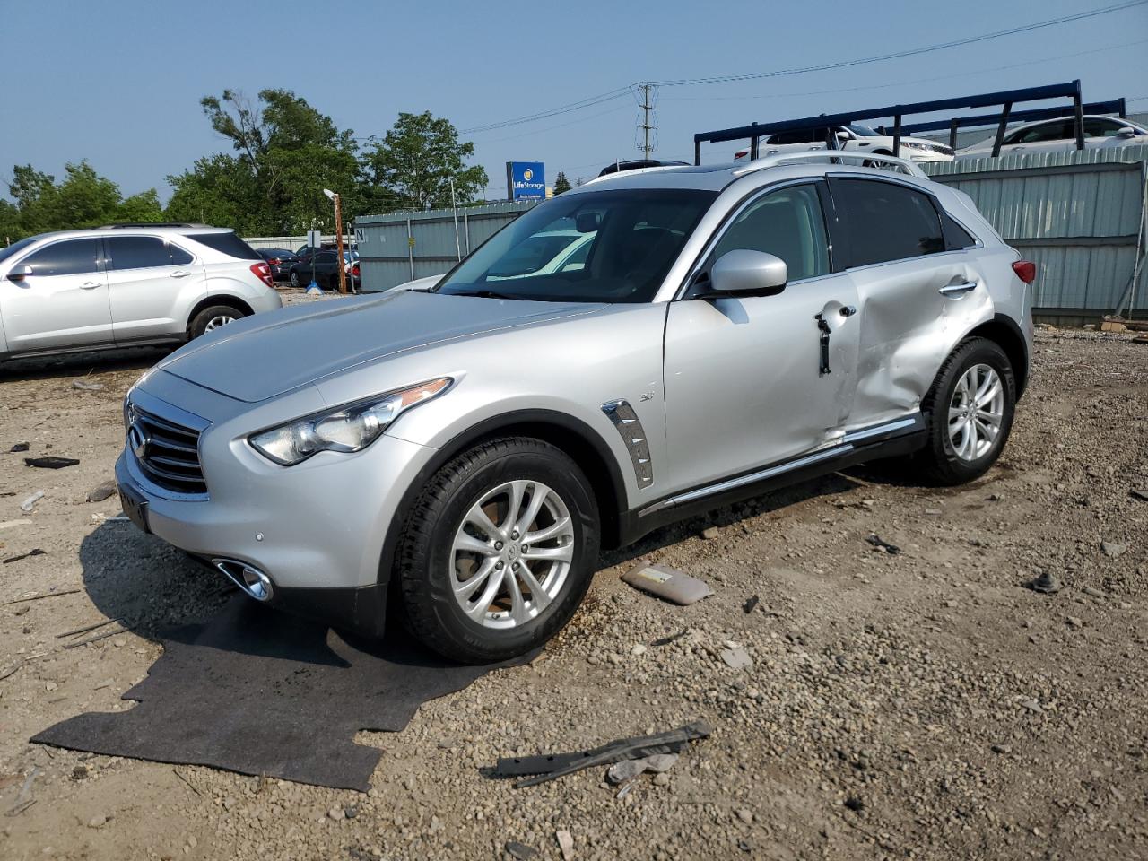 FairThis is a silver 2014 INFINITI QX70. The primary damage is to the side, with secondary damage to the rear end. The vehicle's start code is 'Run & Drive Verified'. The vehicle's exterior condition is rated as 'Fair' due to the body damage. The interior condition is 'Good'. The overall state is 'Fair'. The wheels, lights, and glasses appear to be in good condition, although the images do not provide enough information to fully assess their condition.