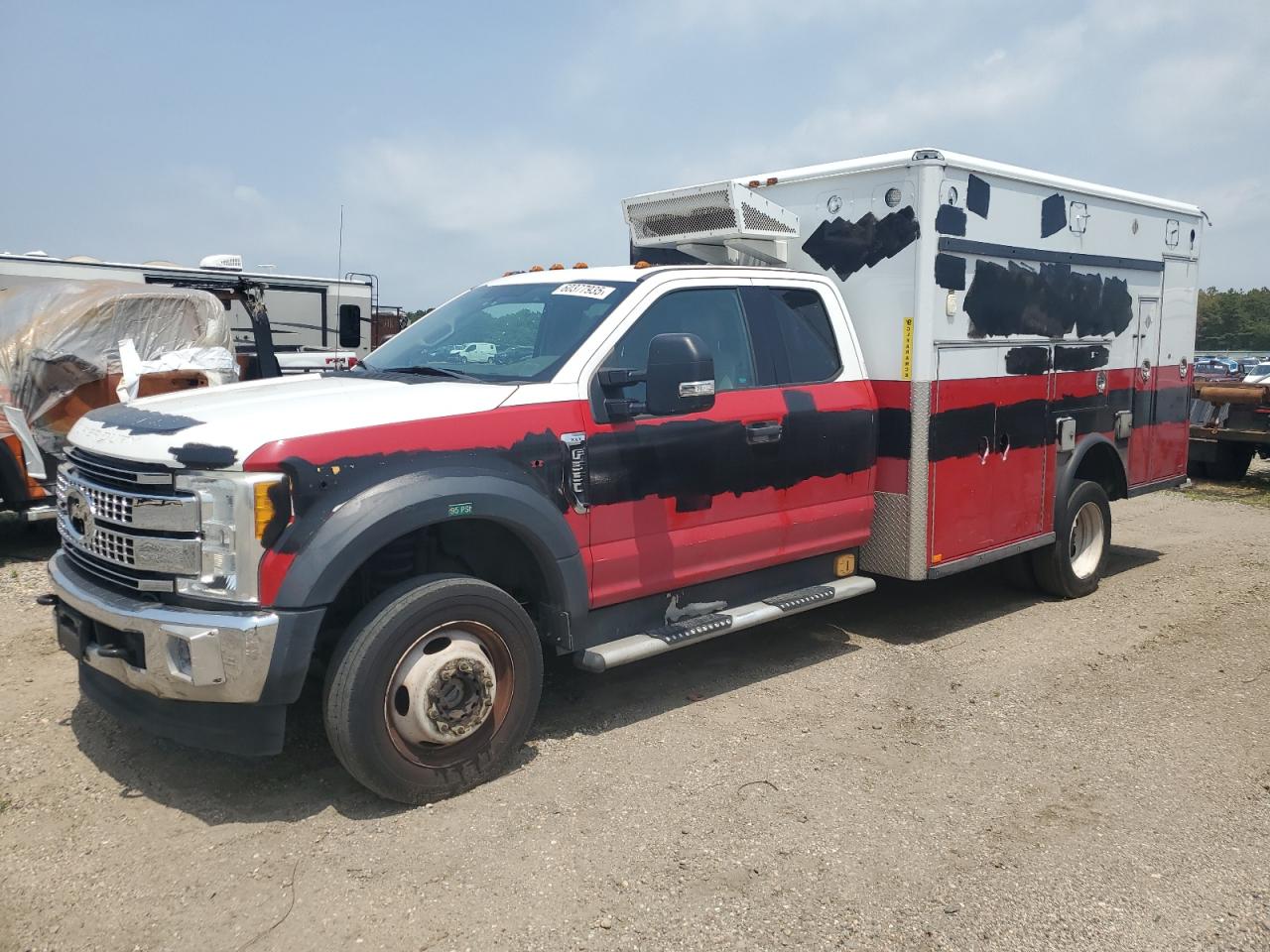 FairThis is a FORD F550 SUPER 2017. It is red and has a Run & Drive Verified start code. The primary damage is MINOR DENT/SCRATCHES, and there is no secondary damage. The vehicle's condition suggests it is drivable, but may require some repairs due to the body damage. The interior appears to be in good condition, showing only minor wear and tear. The car itself is a heavy-duty truck with a specialized body, likely used for emergency services. The lights and glasses appear to be intact, but the body panels show signs of damage.