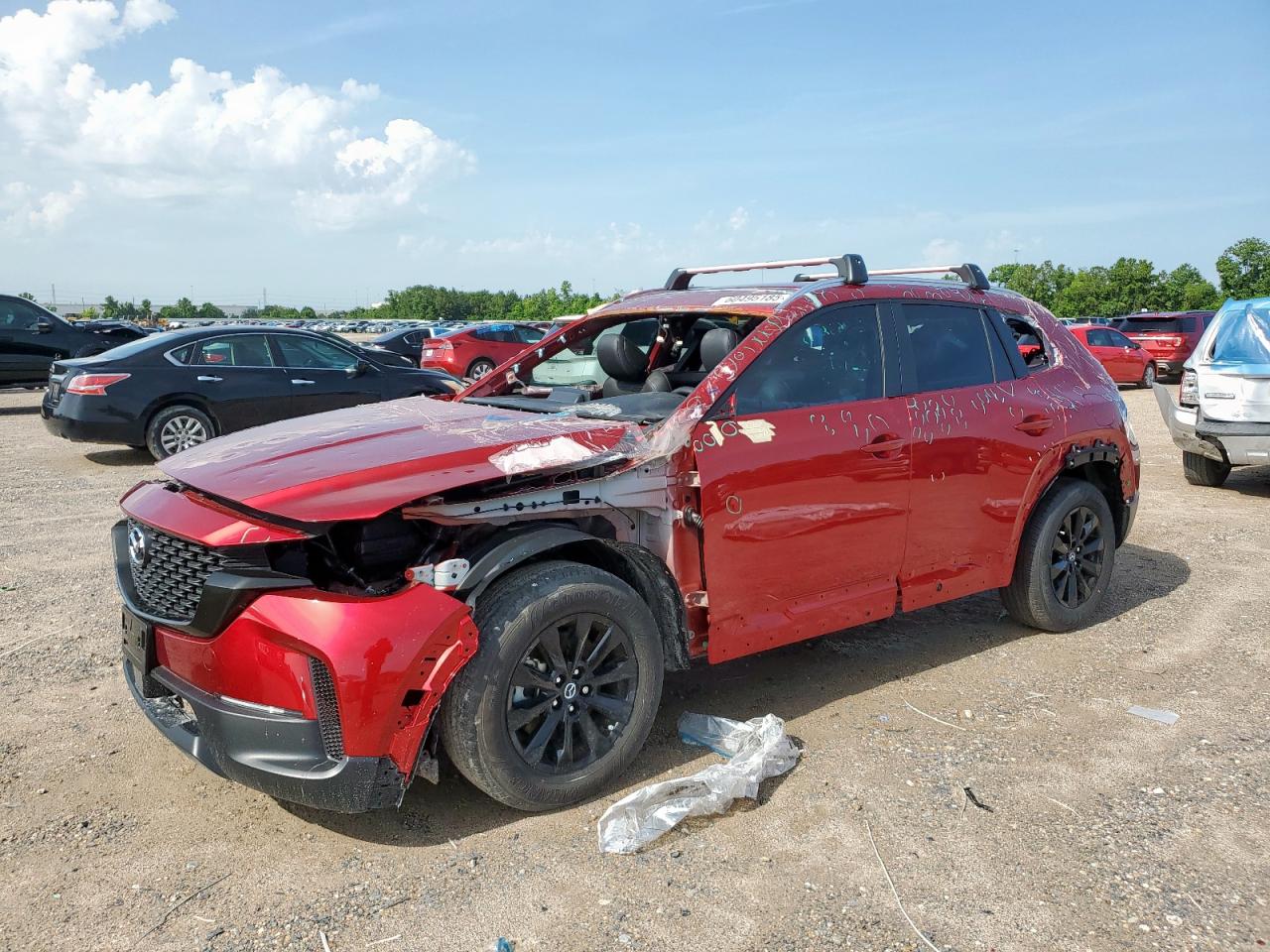 FairThe 2025 MAZDA CX-50 SELE is visibly damaged. The primary damage is from HAIL, affecting body panels extensively. The red exterior shows significant damage with the roof and other parts being severely affected. The wheels appear to be intact, but the glasses are broken and missing in many places. The interior has visible damage to panels, and possible airbag deployment.