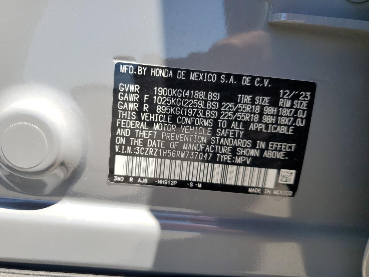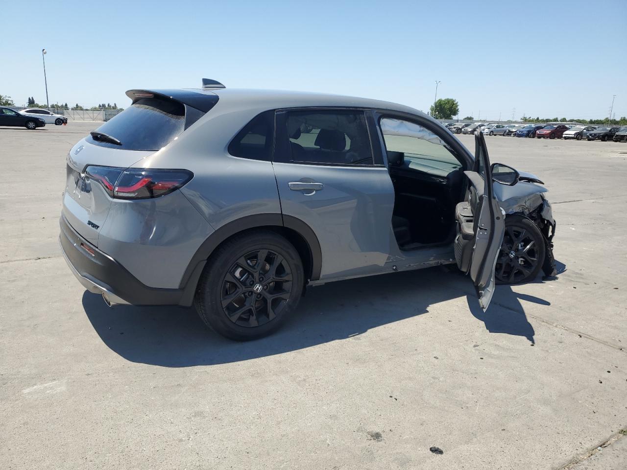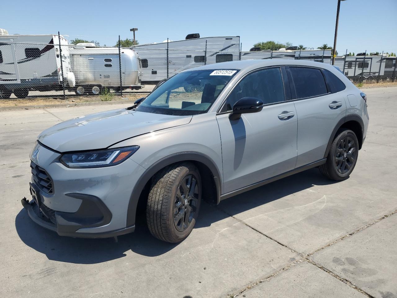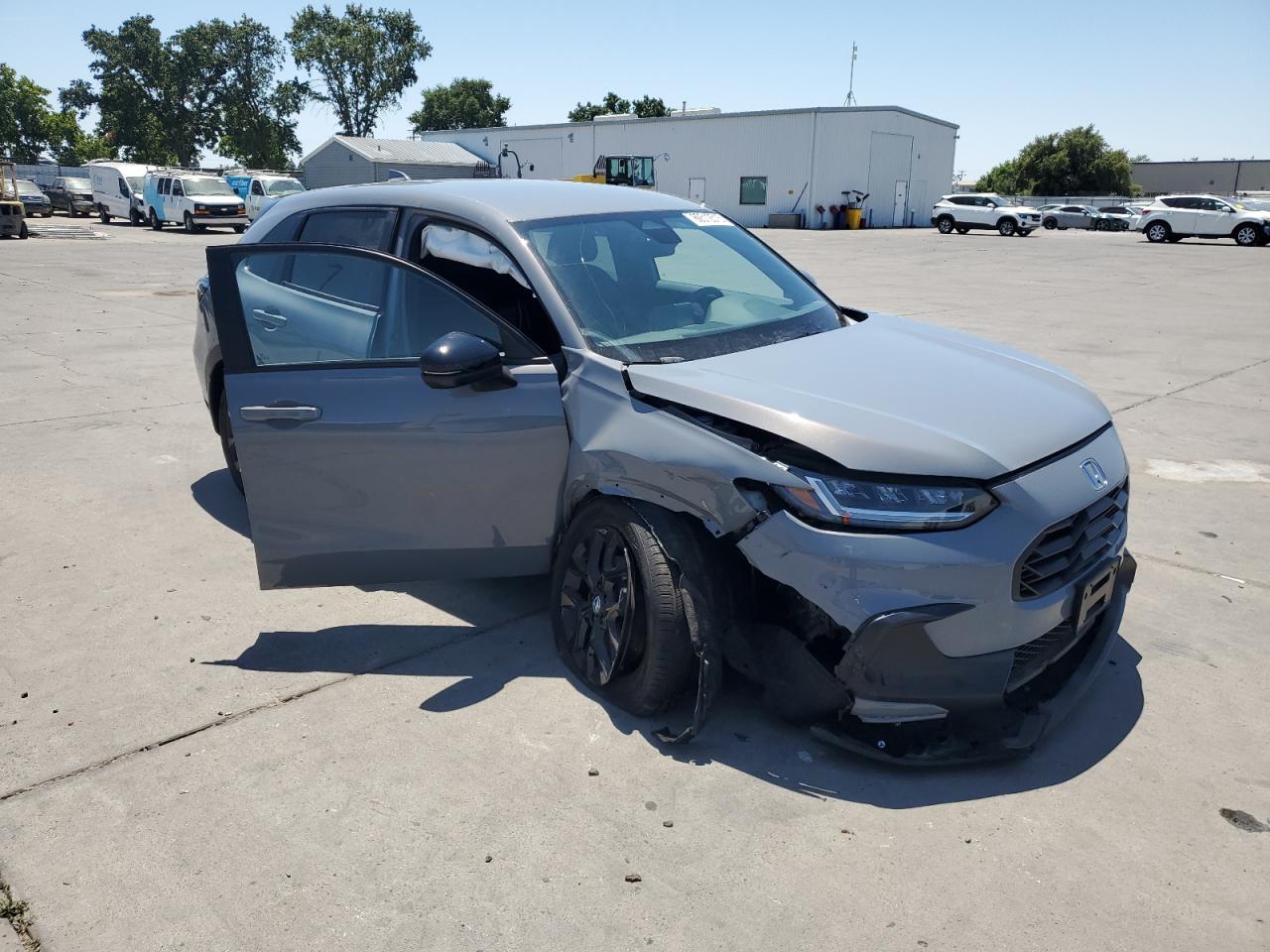 FairThis is a 2024 Honda HR-V Sport in gray. The vehicle has sustained significant front-end damage, affecting the body panels, lights, and potentially the undercarriage. The vehicle starts and shows signs of impact damage, indicating possible mechanical issues. The airbags have deployed. The interior has damage as well.