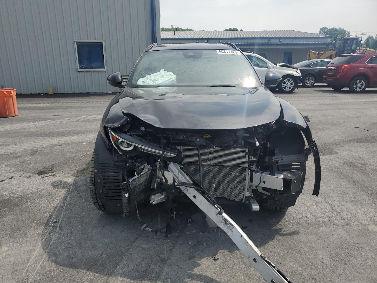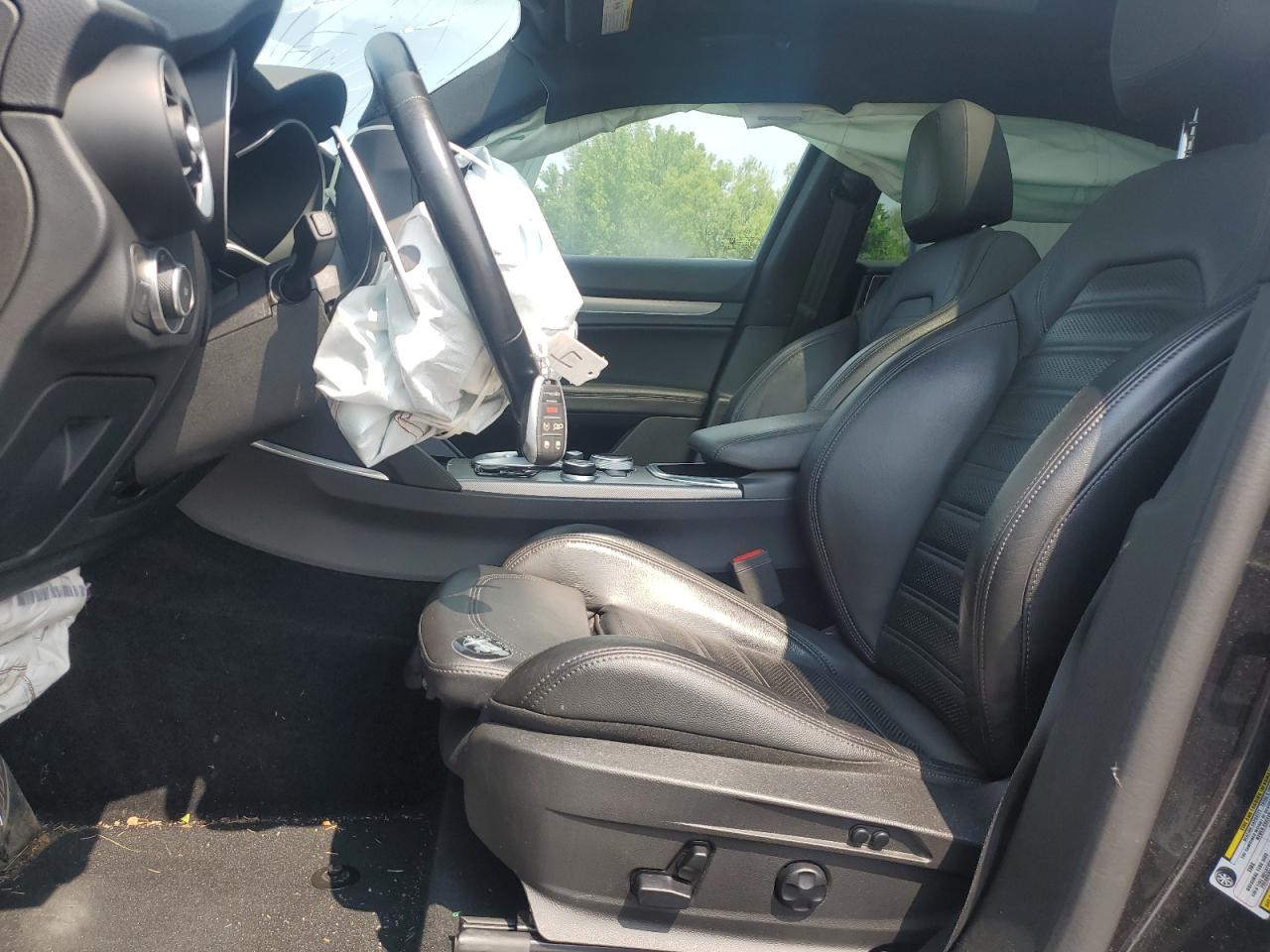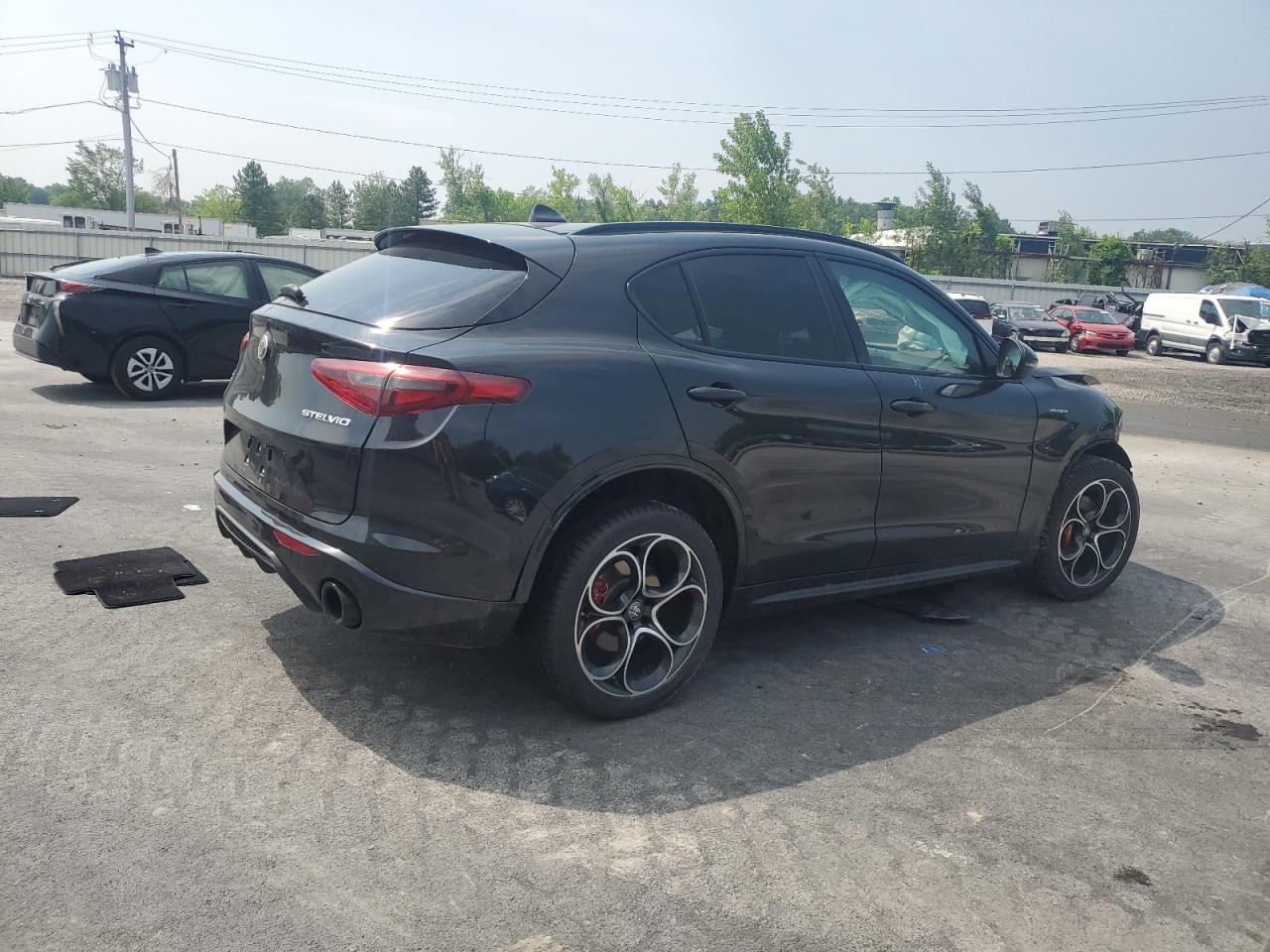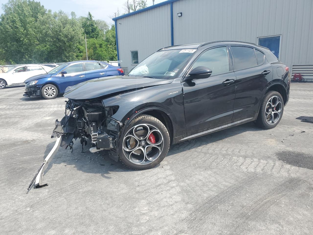 FairAlfa Romeo Stelvio TI 2022, black color, showing significant front-end damage. The front of the vehicle is severely damaged, with visible impact to the hood, bumper, and potentially structural components. The airbags have deployed. The interior shows signs of impact, with deployed airbags and potential damage to the dashboard and seats. The wheels appear to be intact, but the overall condition suggests the vehicle requires considerable repair. The vehicle is not drivable.