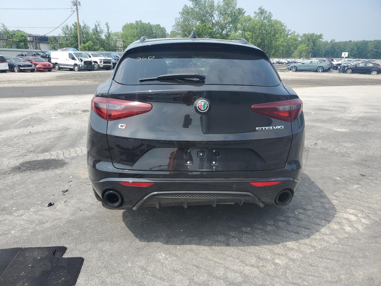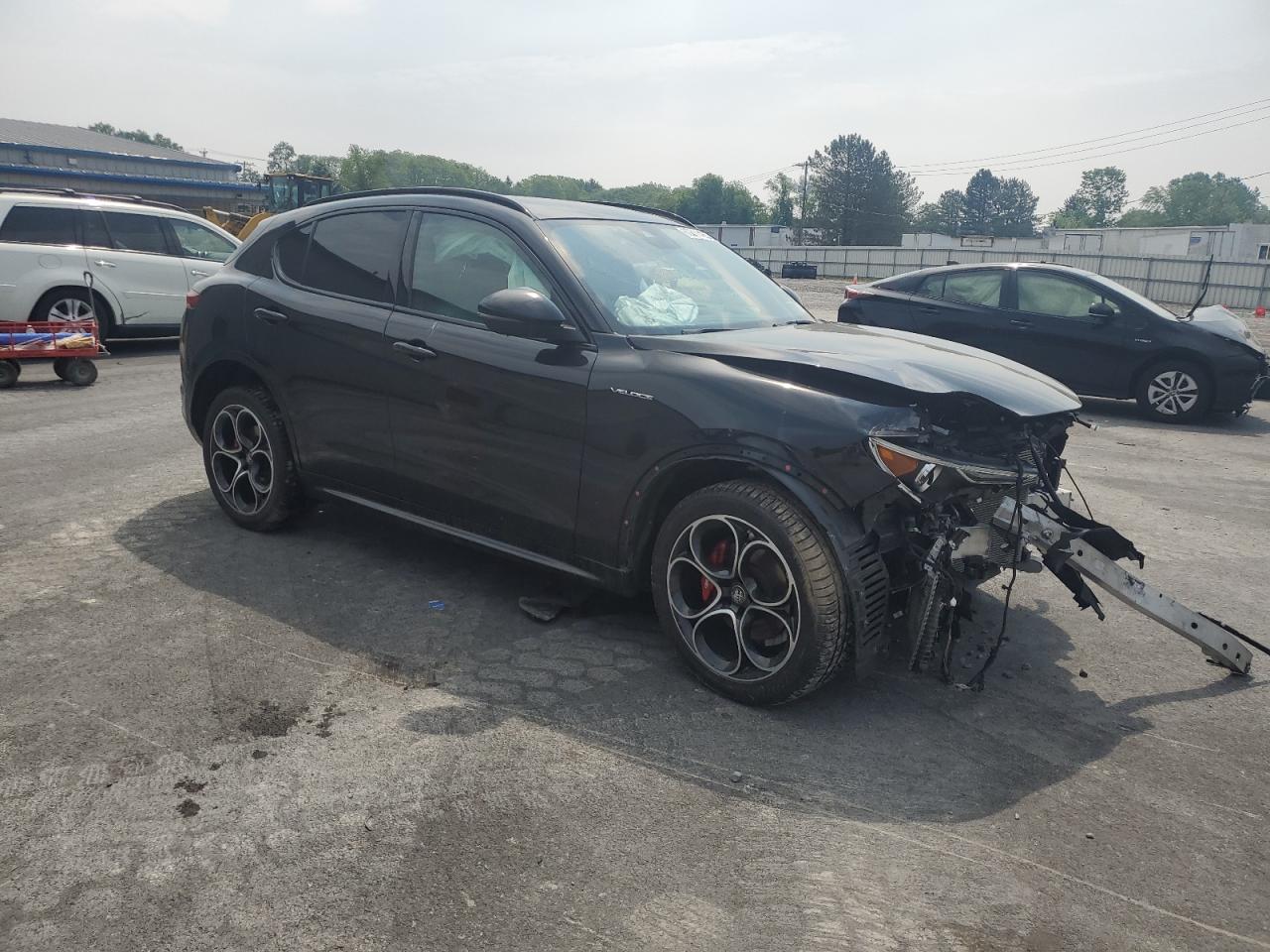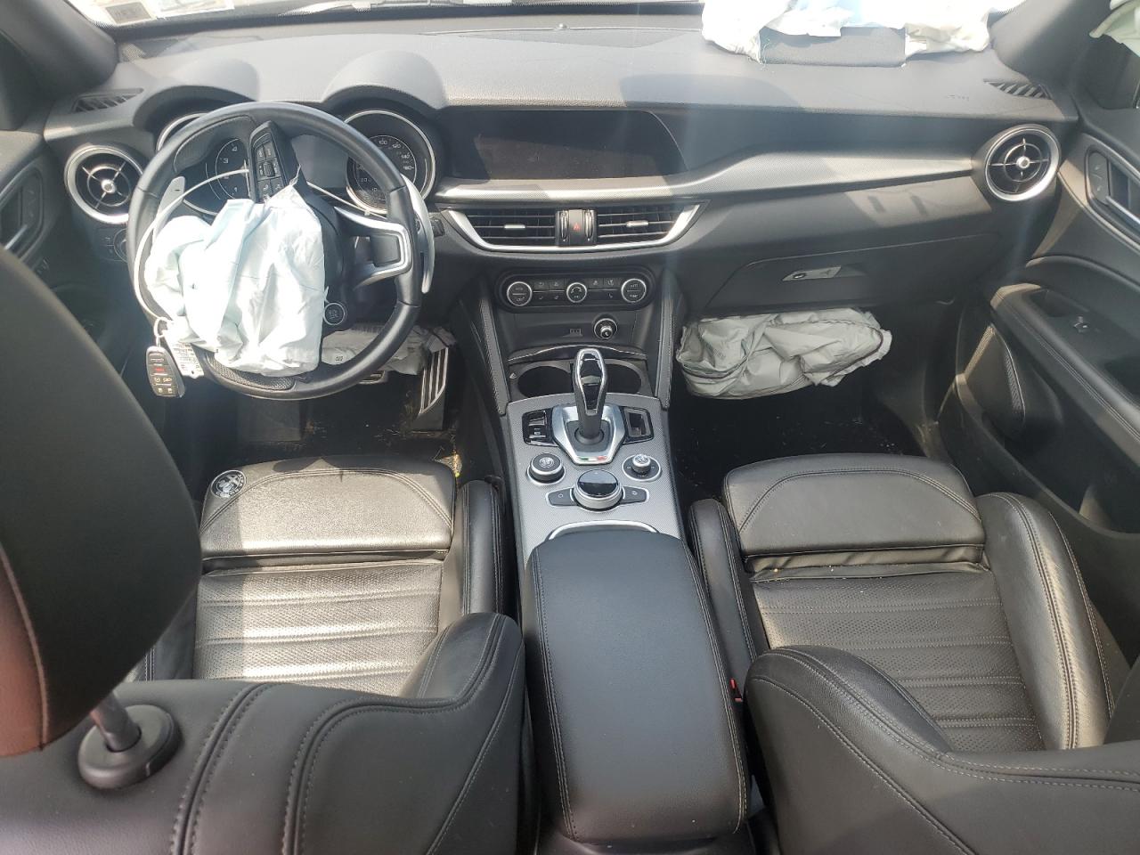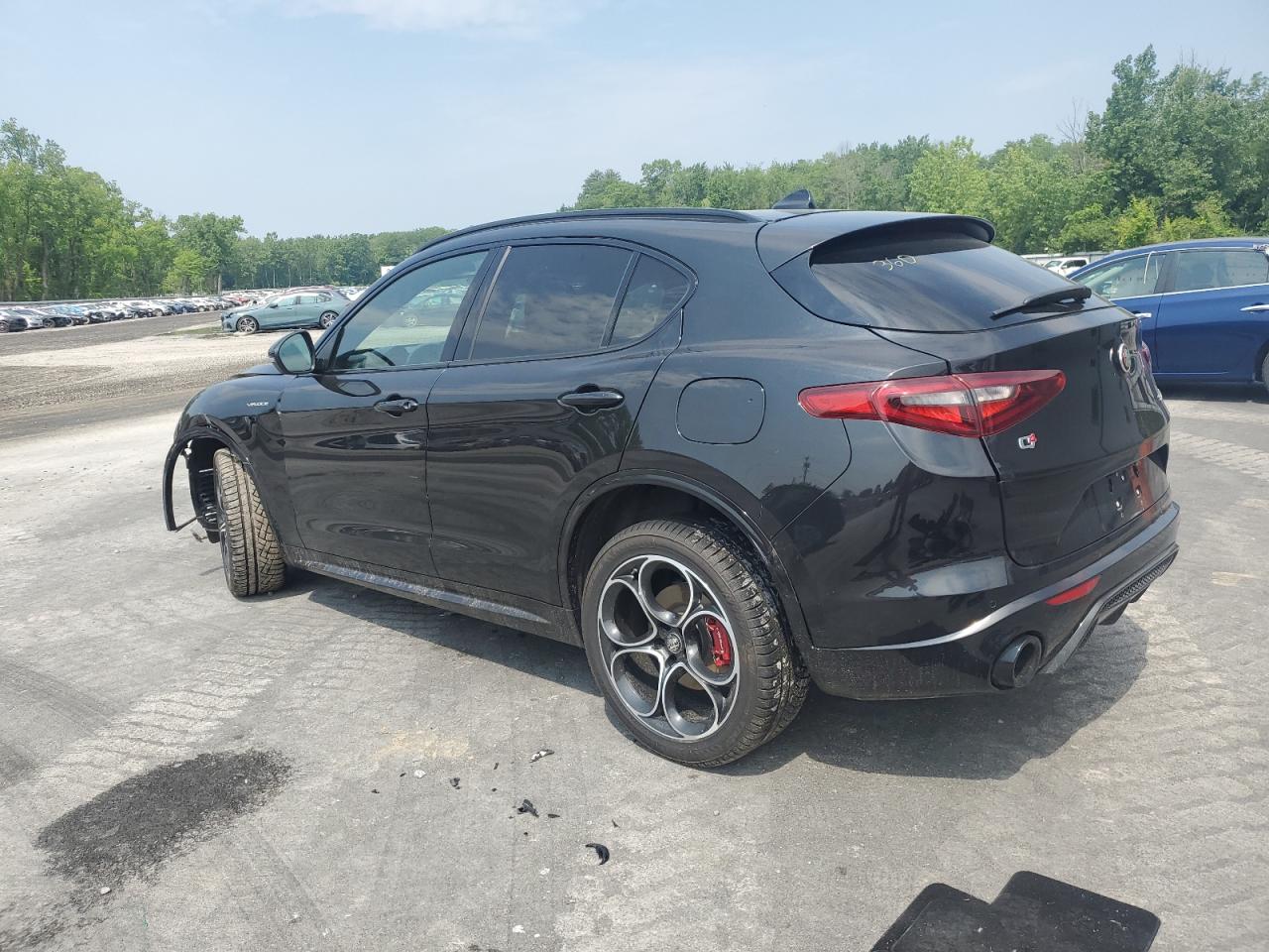 FairAlfa Romeo Stelvio TI 2022, black color, showing significant front-end damage. The front of the vehicle is severely damaged, with visible impact to the hood, bumper, and potentially structural components. The airbags have deployed. The interior shows signs of impact, with deployed airbags and potential damage to the dashboard and seats. The wheels appear to be intact, but the overall condition suggests the vehicle requires considerable repair. The vehicle is not drivable.