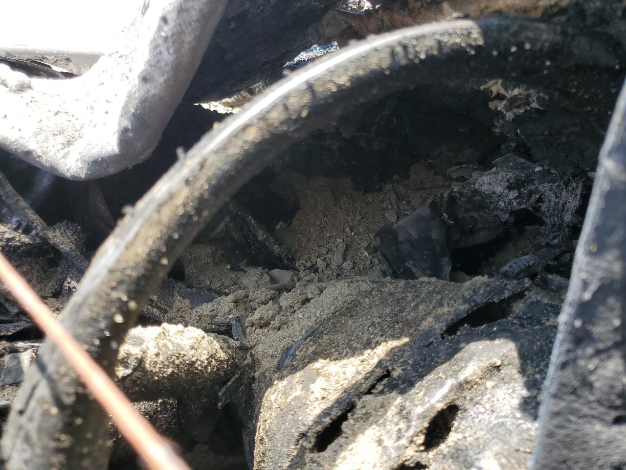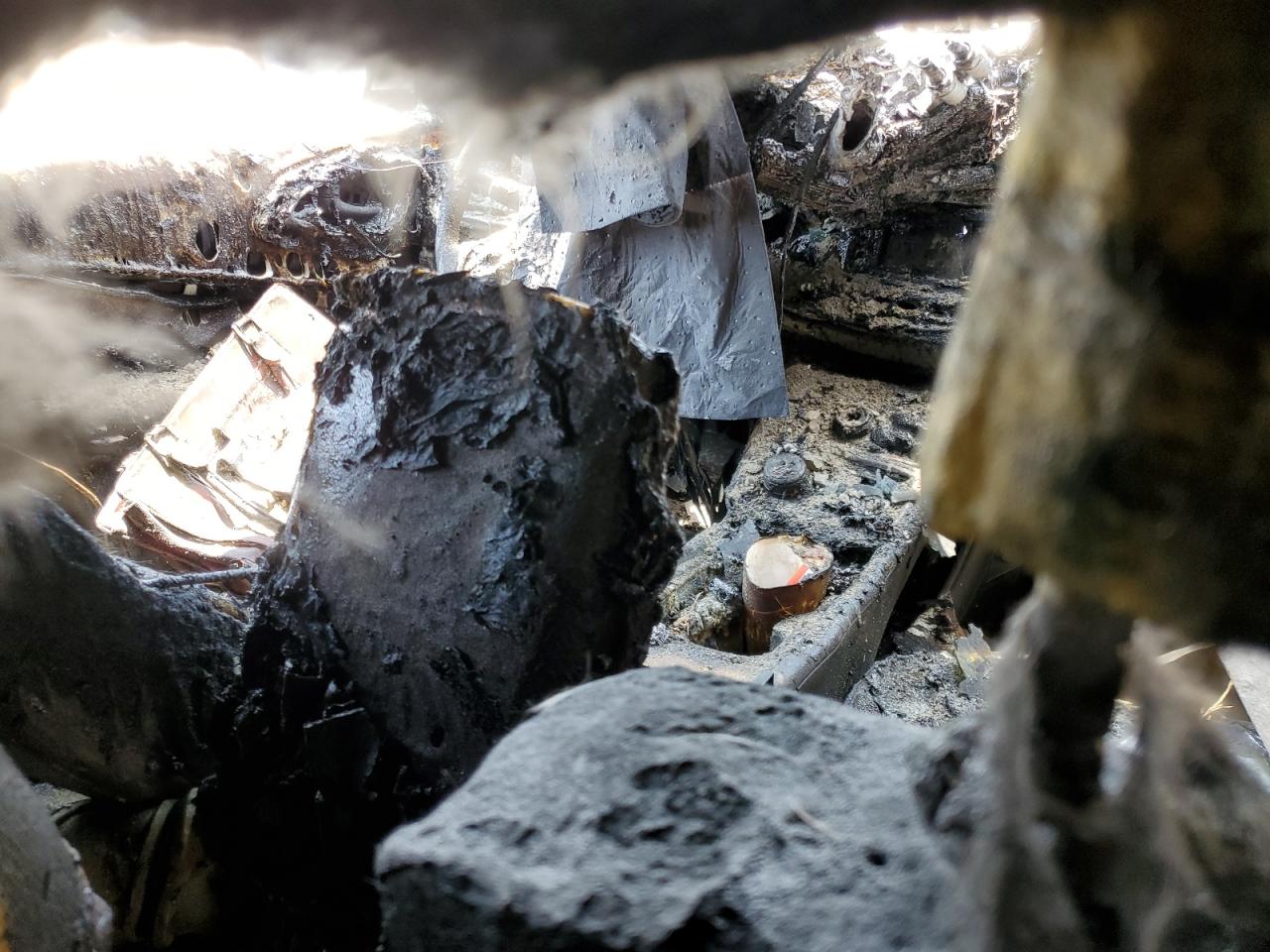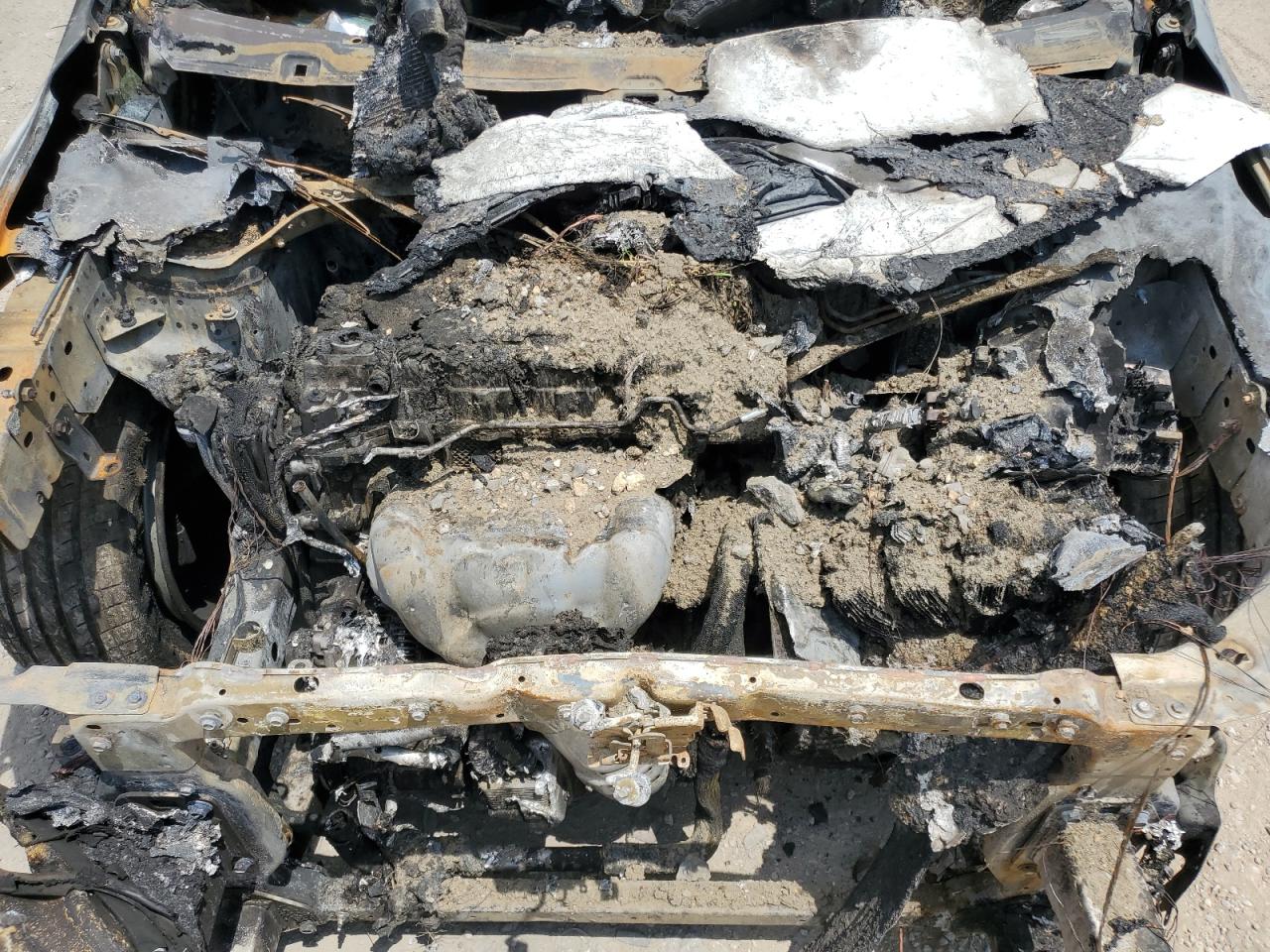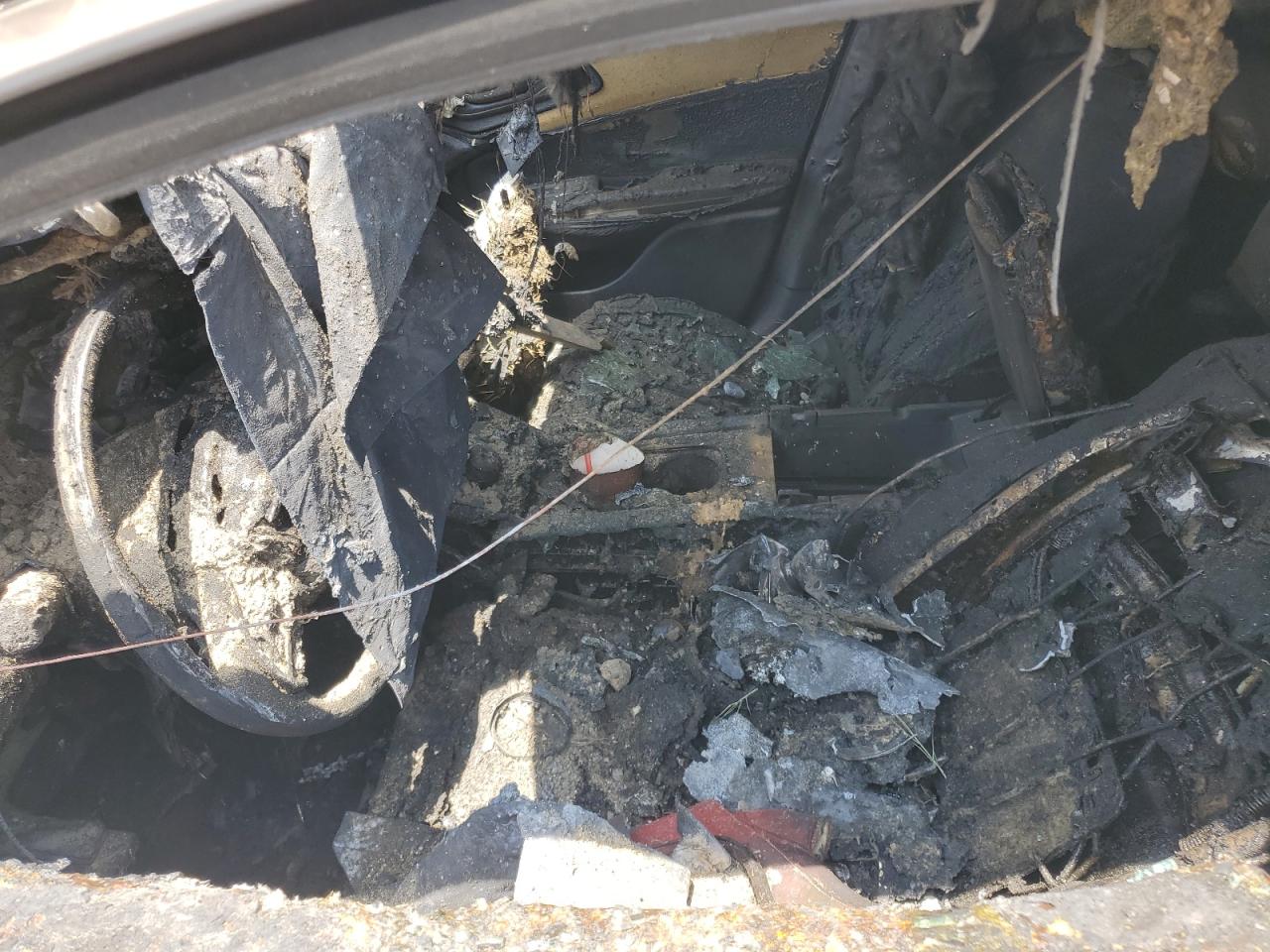 The vehicle's engine and interior have significant fire damage, affecting body panels and structural integrity.