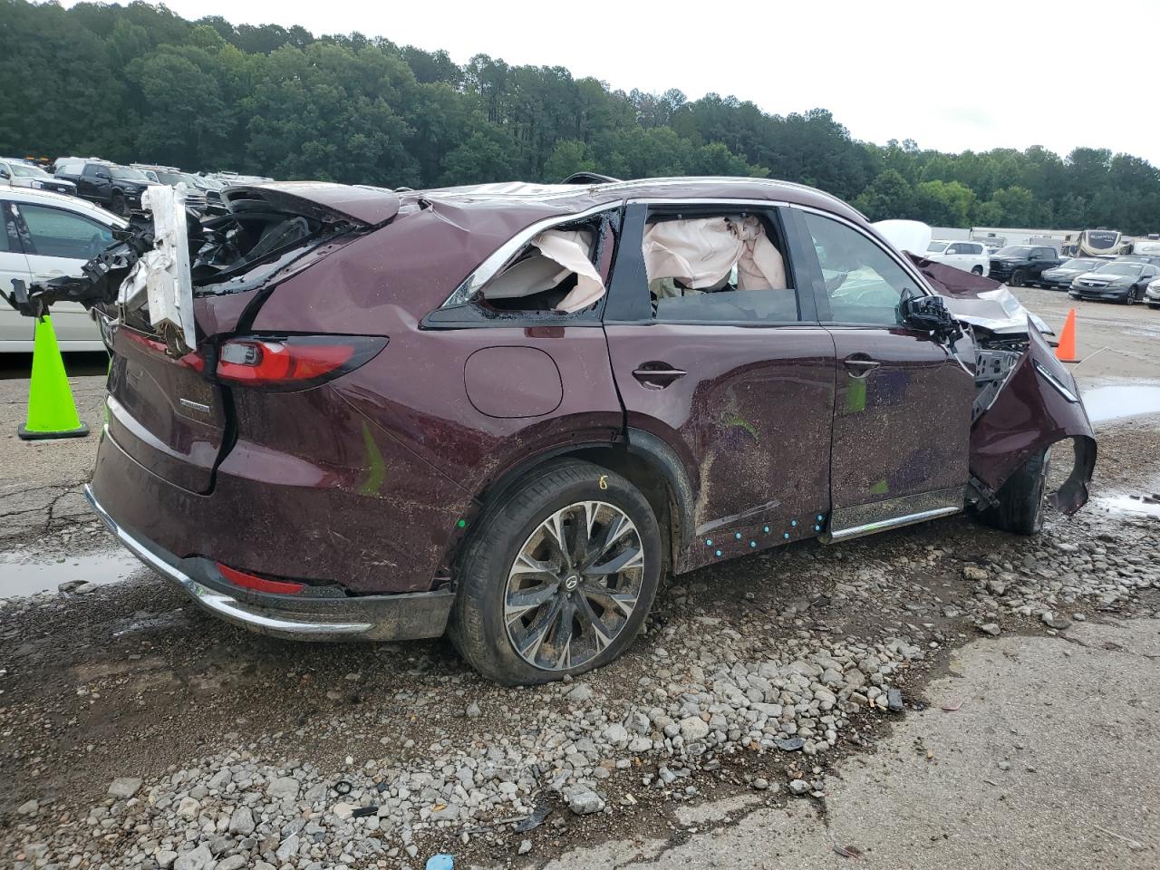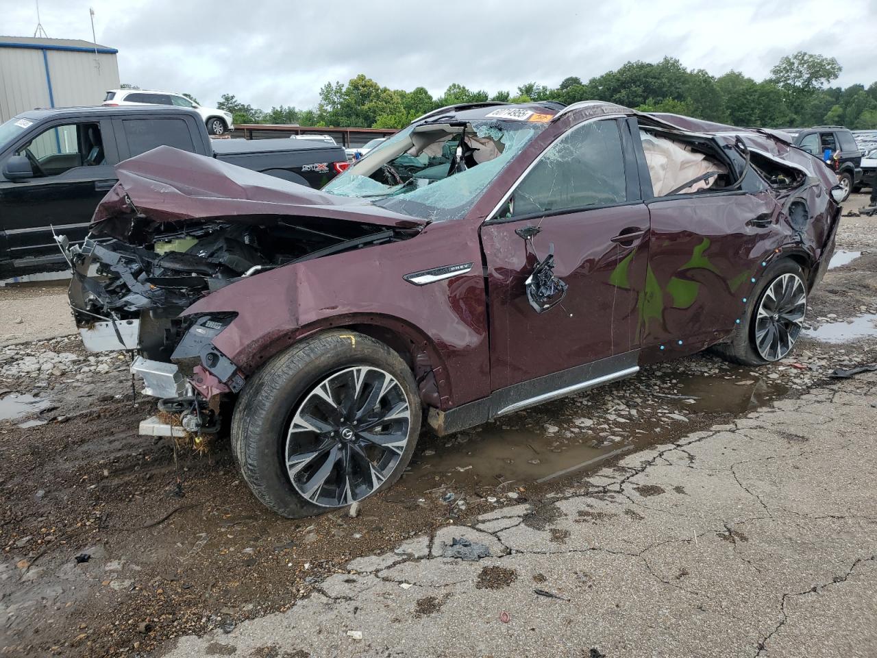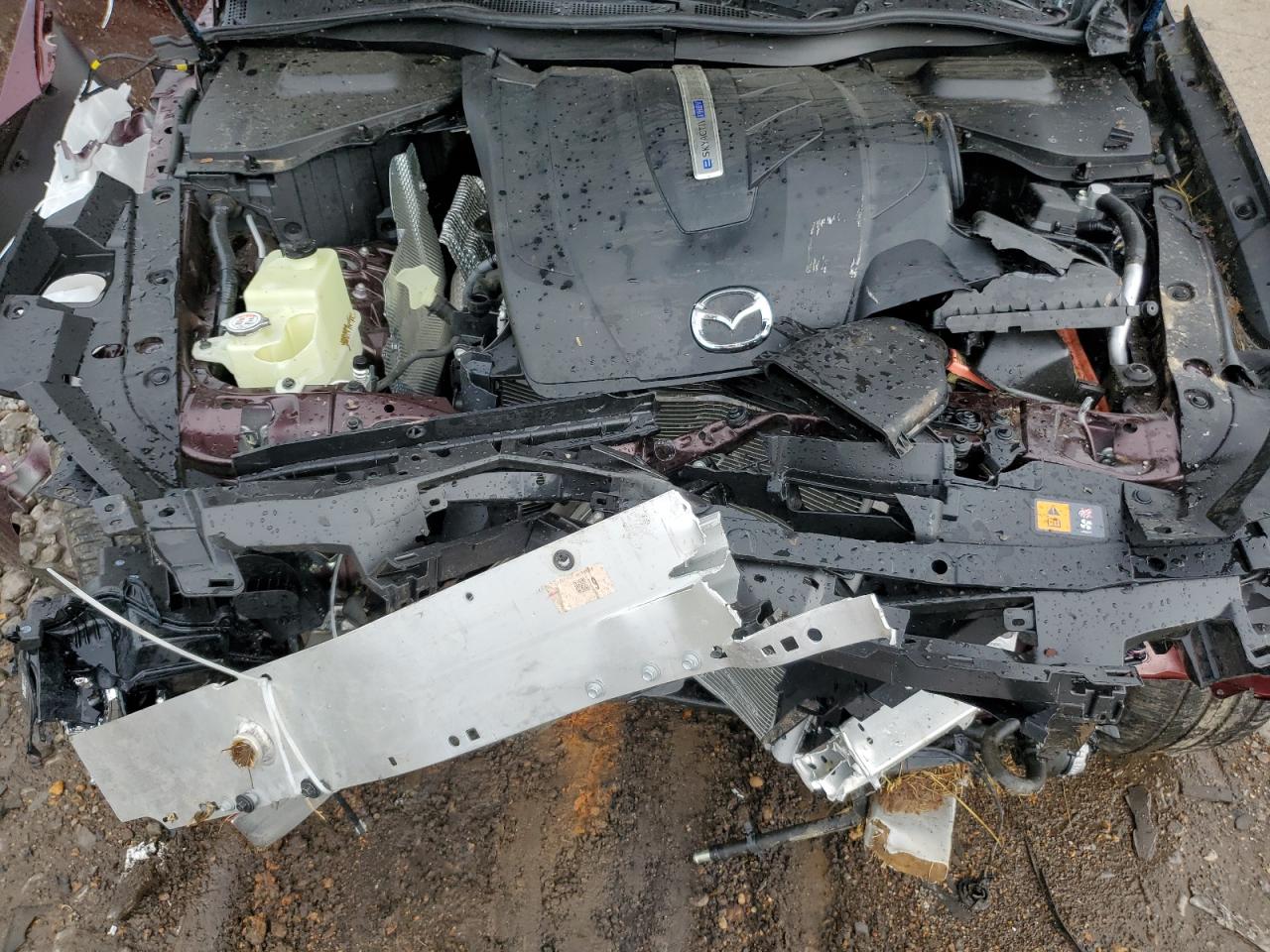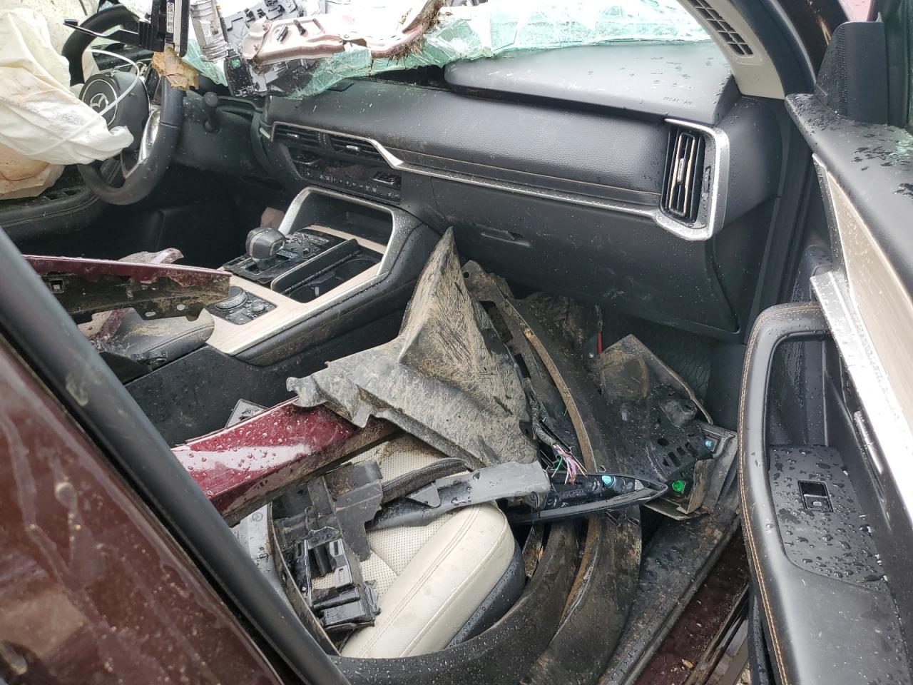 PoorThe 2024 MAZDA CX-90 PREM in burgundy exhibits extensive damage, indicating a severe accident. The vehicle's body panels are heavily compromised, suggesting a "Body" damage category. Both the exterior and interior conditions are rated as "Poor", reflecting the extensive damage.