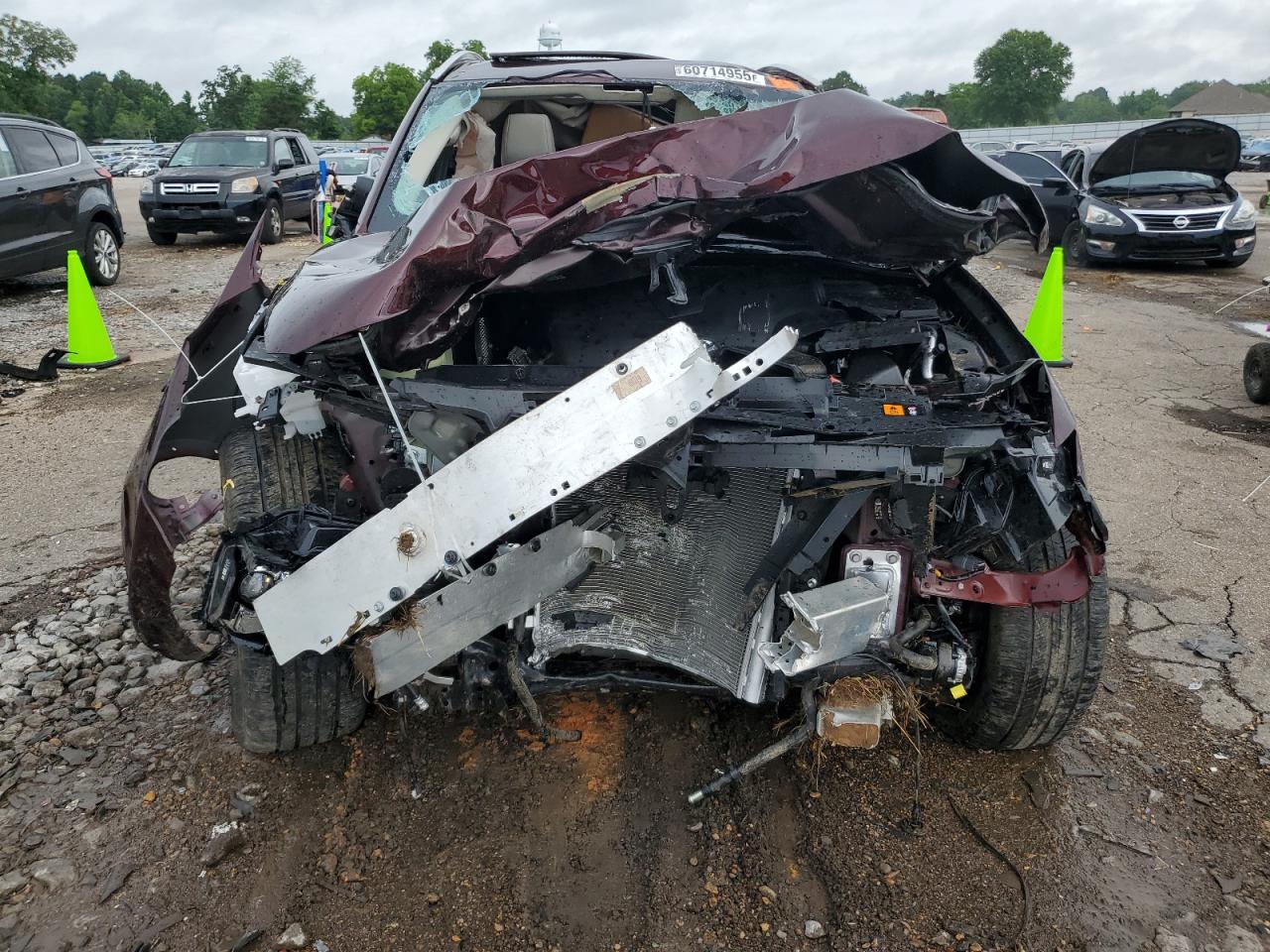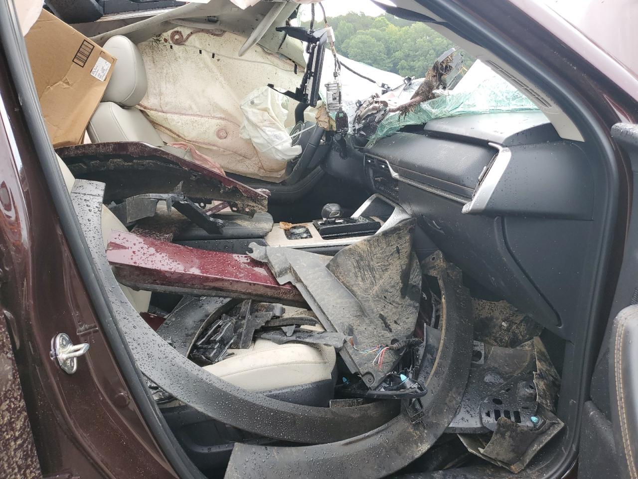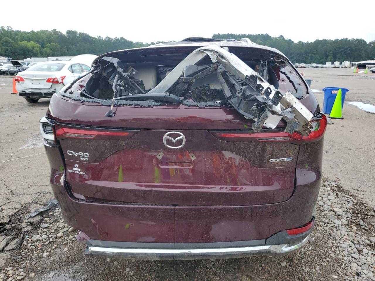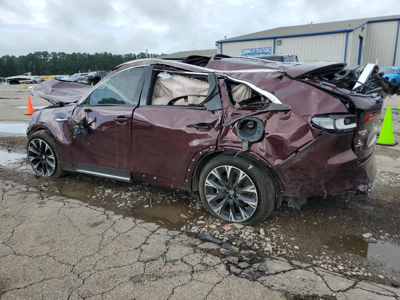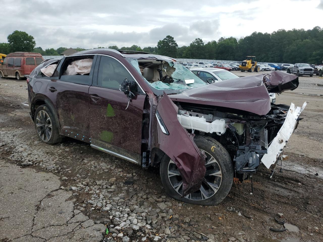 PoorThe 2024 MAZDA CX-90 PREM in burgundy exhibits extensive damage, indicating a severe accident. The vehicle's body panels are heavily compromised, suggesting a "Body" damage category. Both the exterior and interior conditions are rated as "Poor", reflecting the extensive damage.