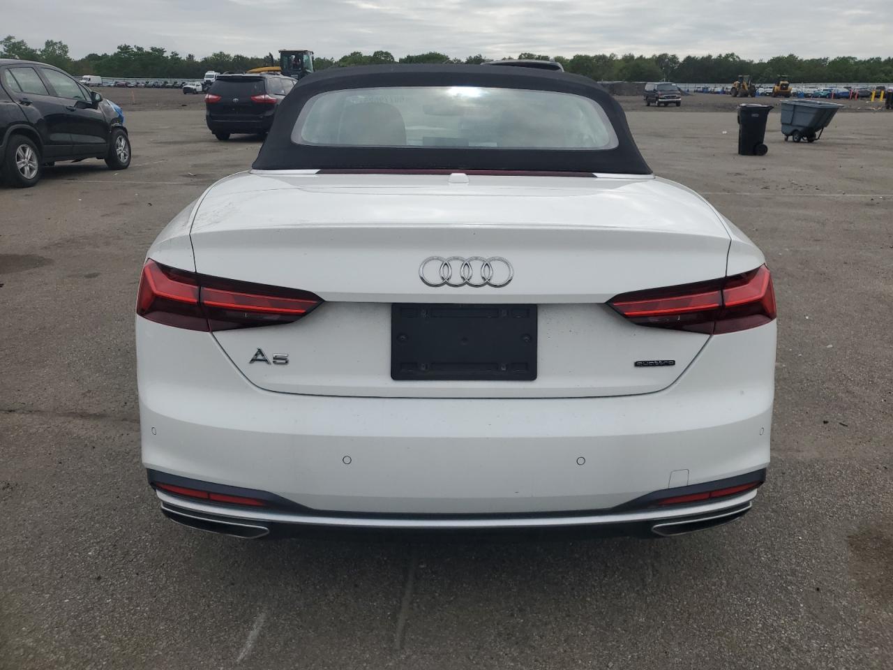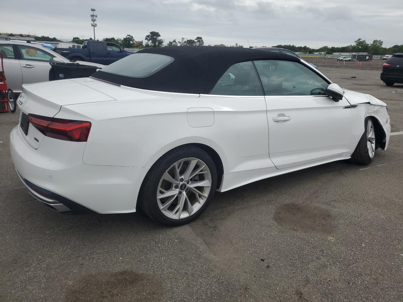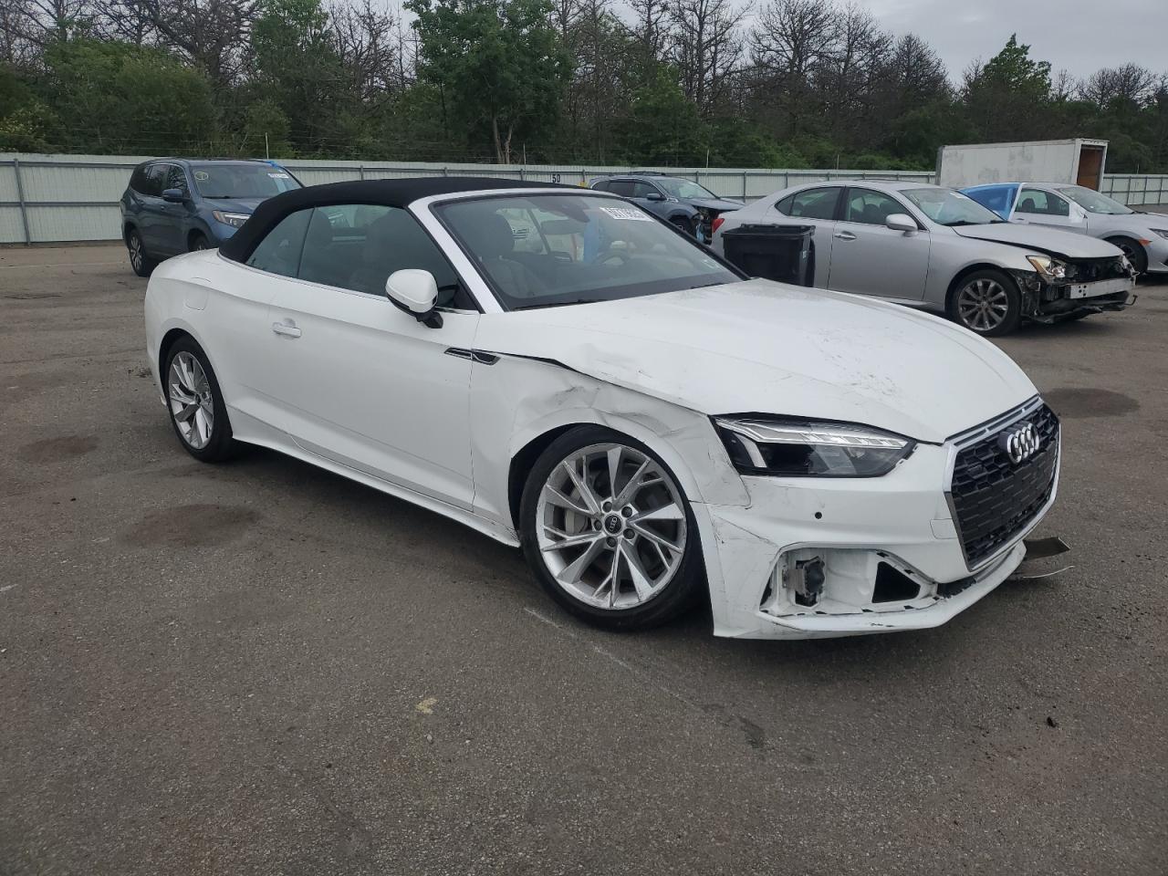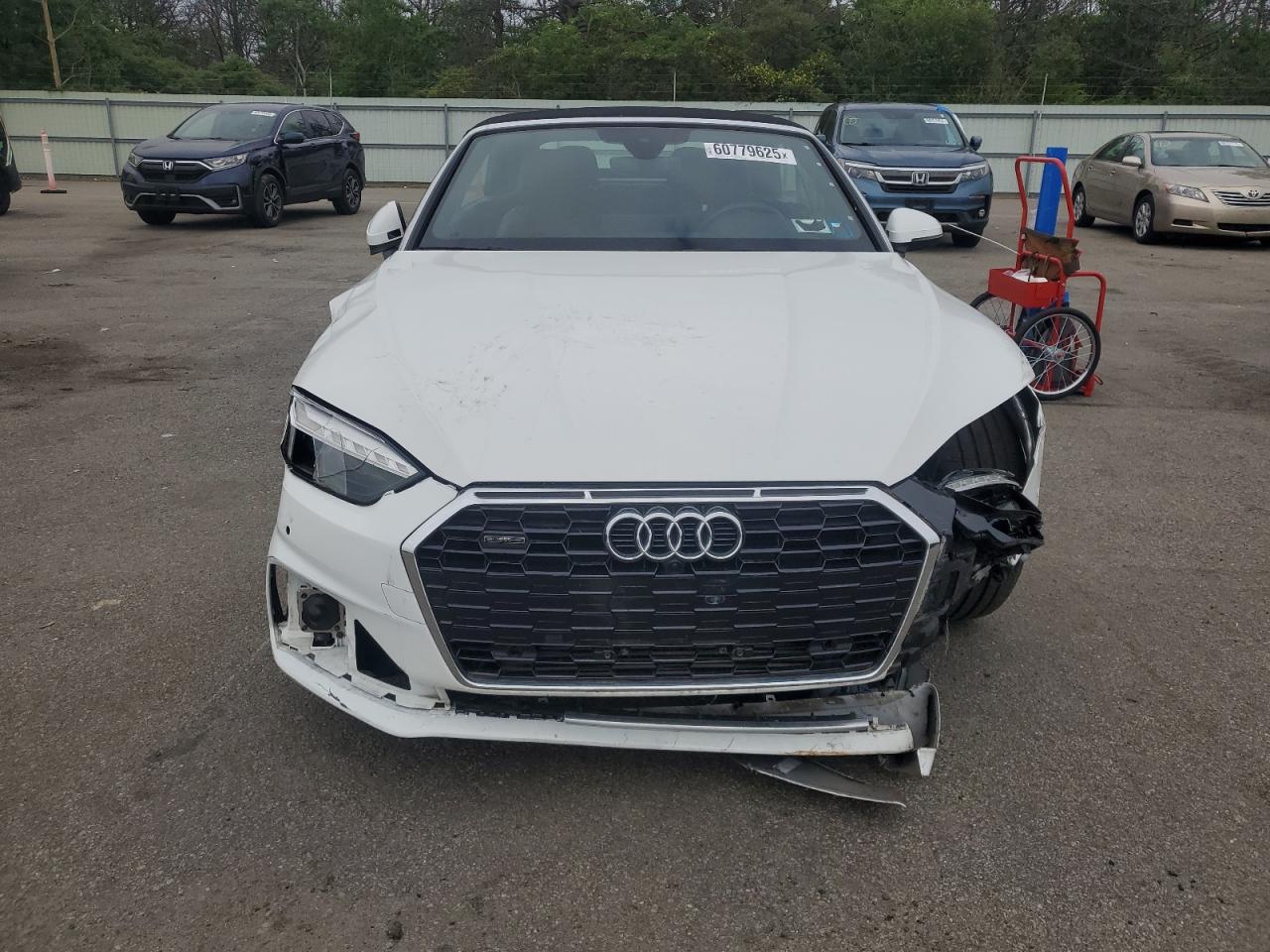 FairThis is a damaged 2021 Audi A5 Premium convertible. It has significant front-end and side damage, with a white exterior and a black convertible top. The interior features brown leather seats and wood trim. The car is listed as Run & Drive Verified.