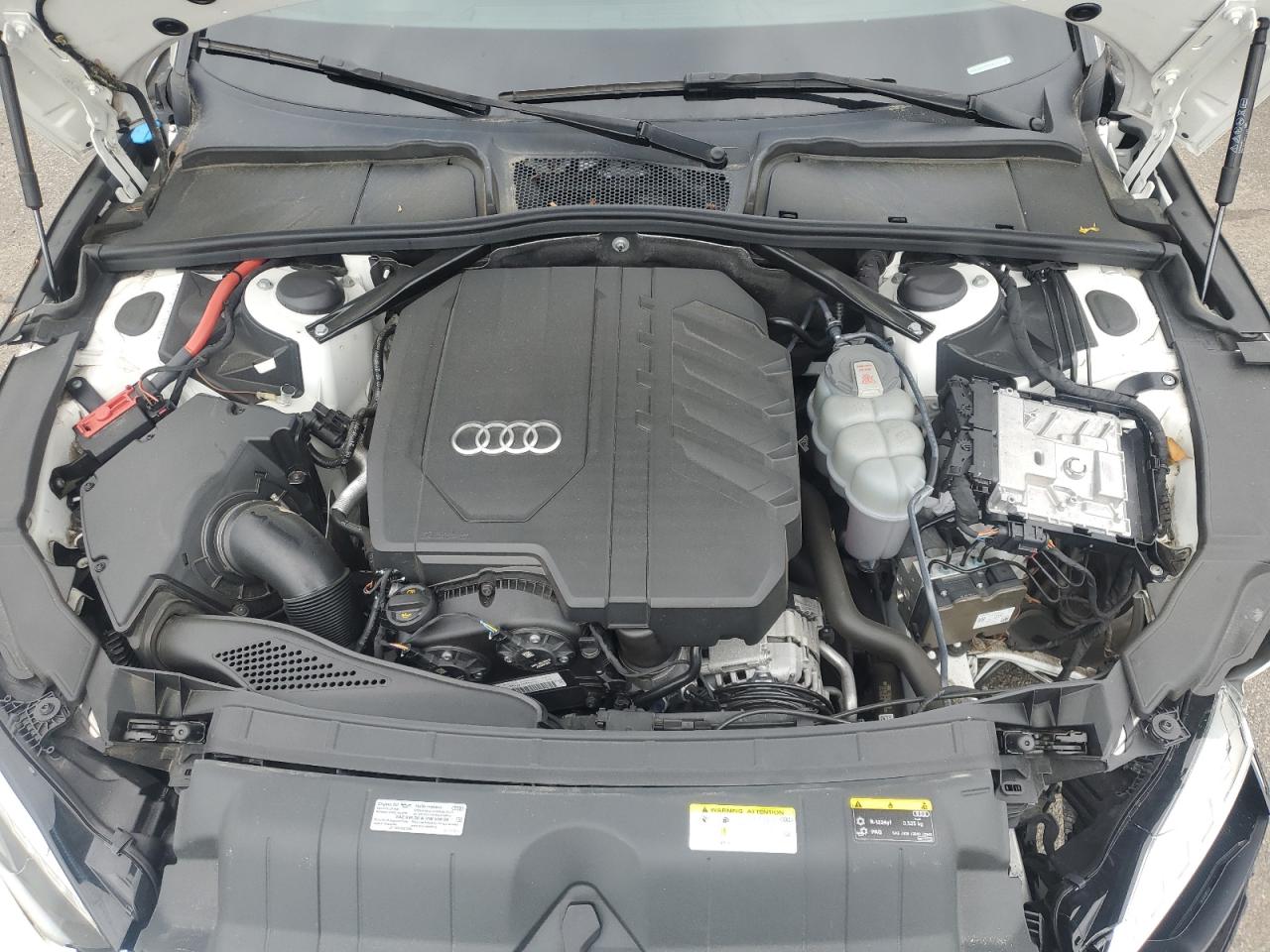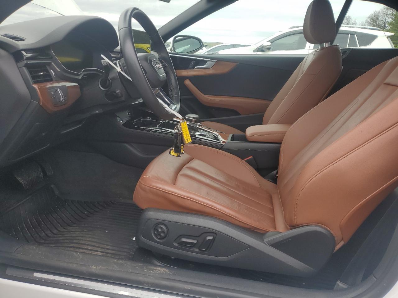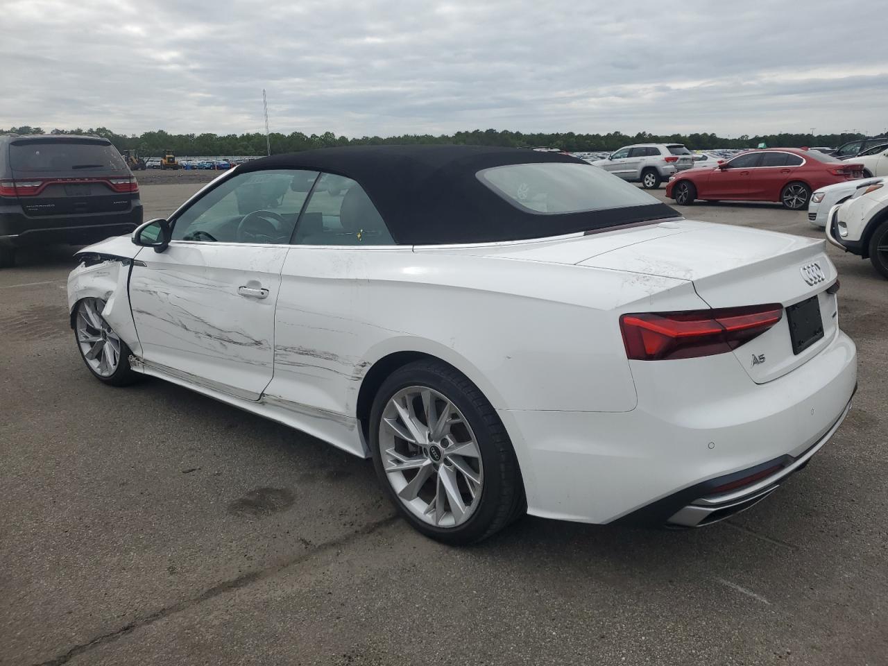 FairThis is a damaged 2021 Audi A5 Premium convertible. It has significant front-end and side damage, with a white exterior and a black convertible top. The interior features brown leather seats and wood trim. The car is listed as Run & Drive Verified.