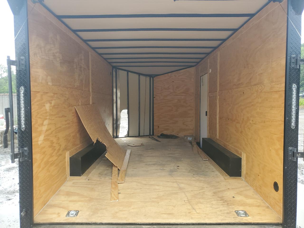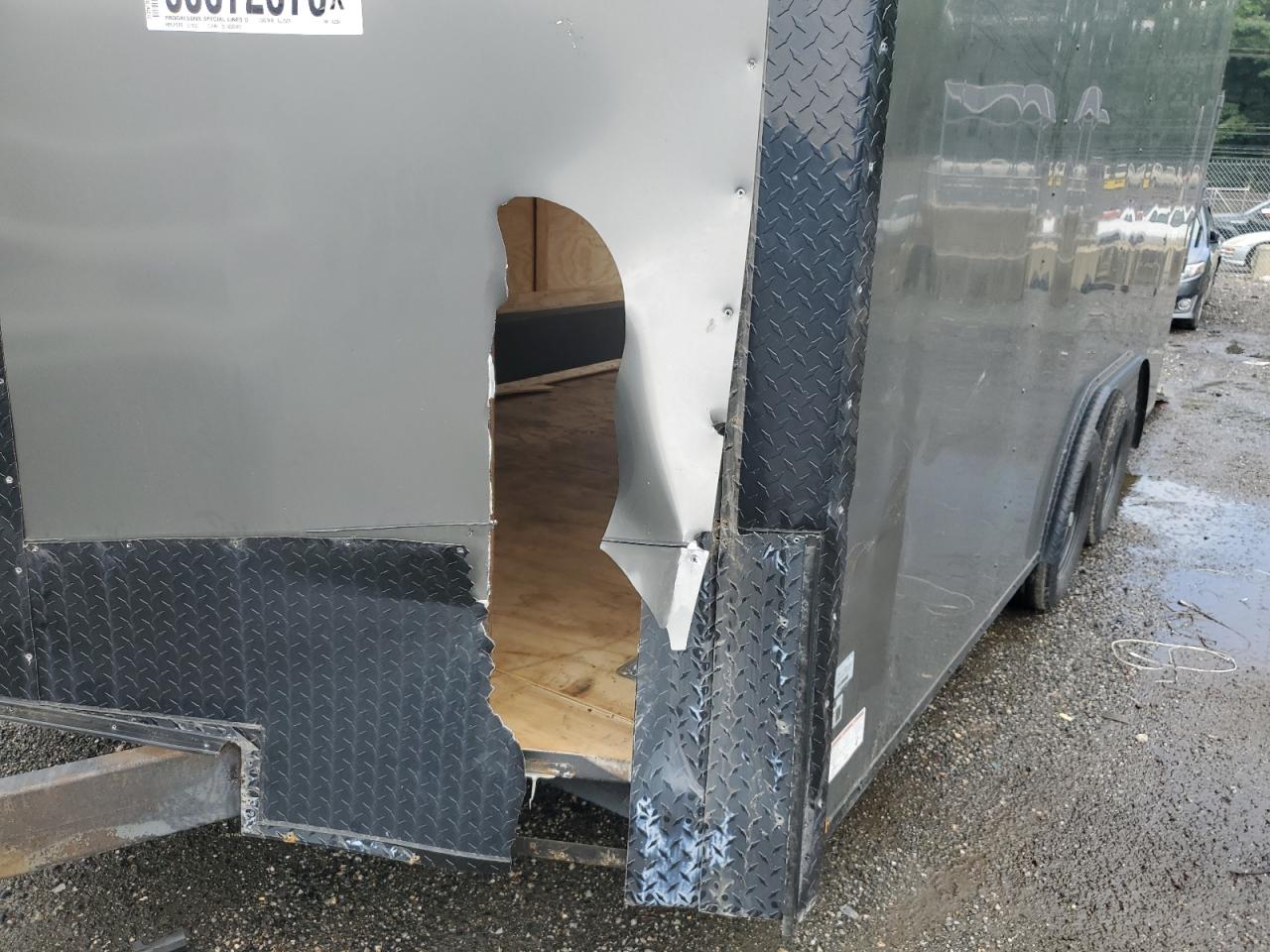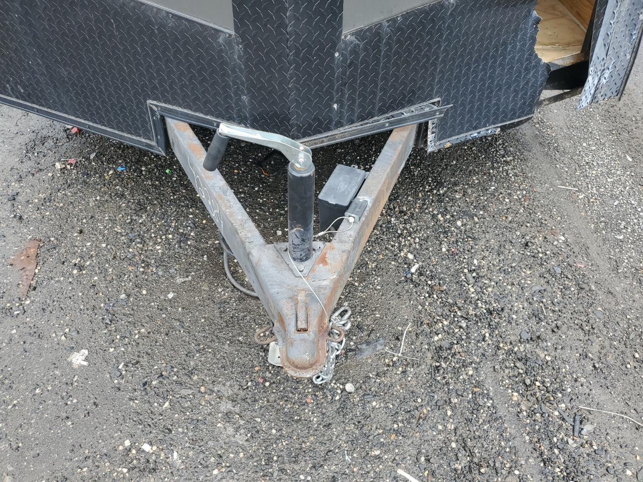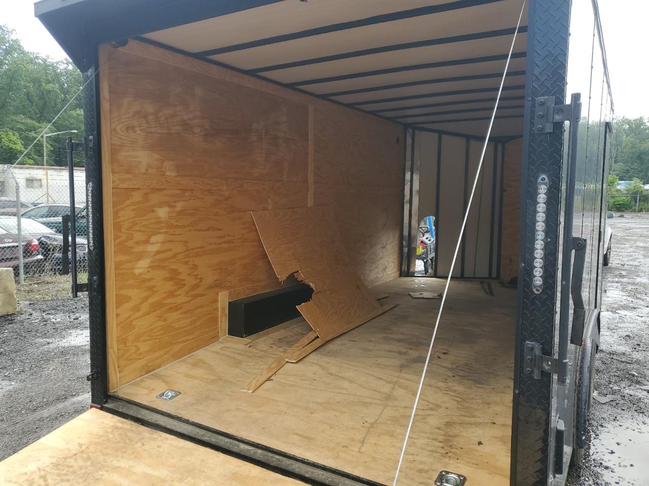 The trailer sustained considerable damage to the front end, with a visible hole. There are also minor dents and scratches across the body. The interior appears to be in good condition.