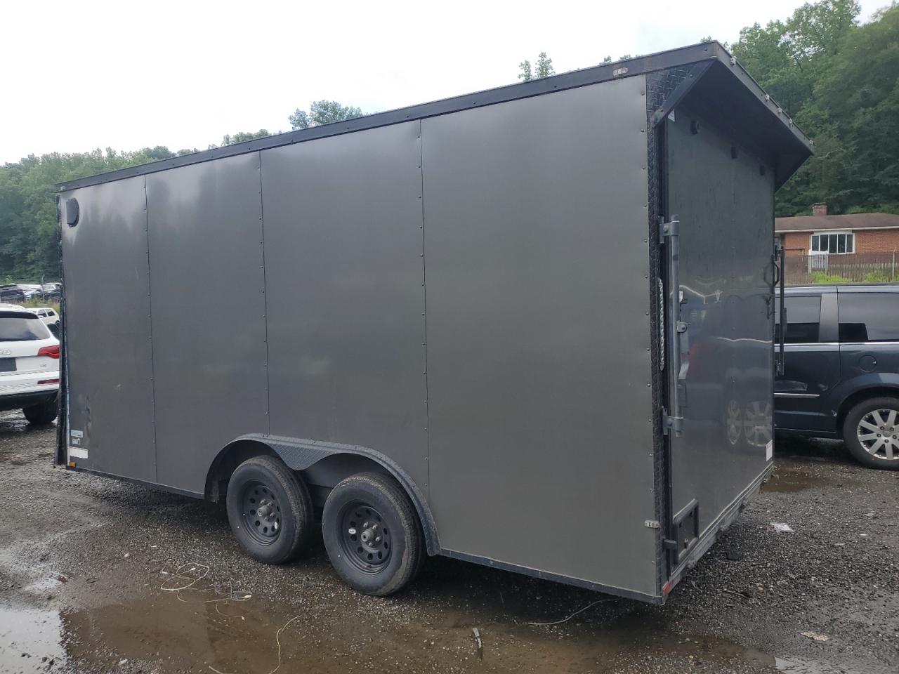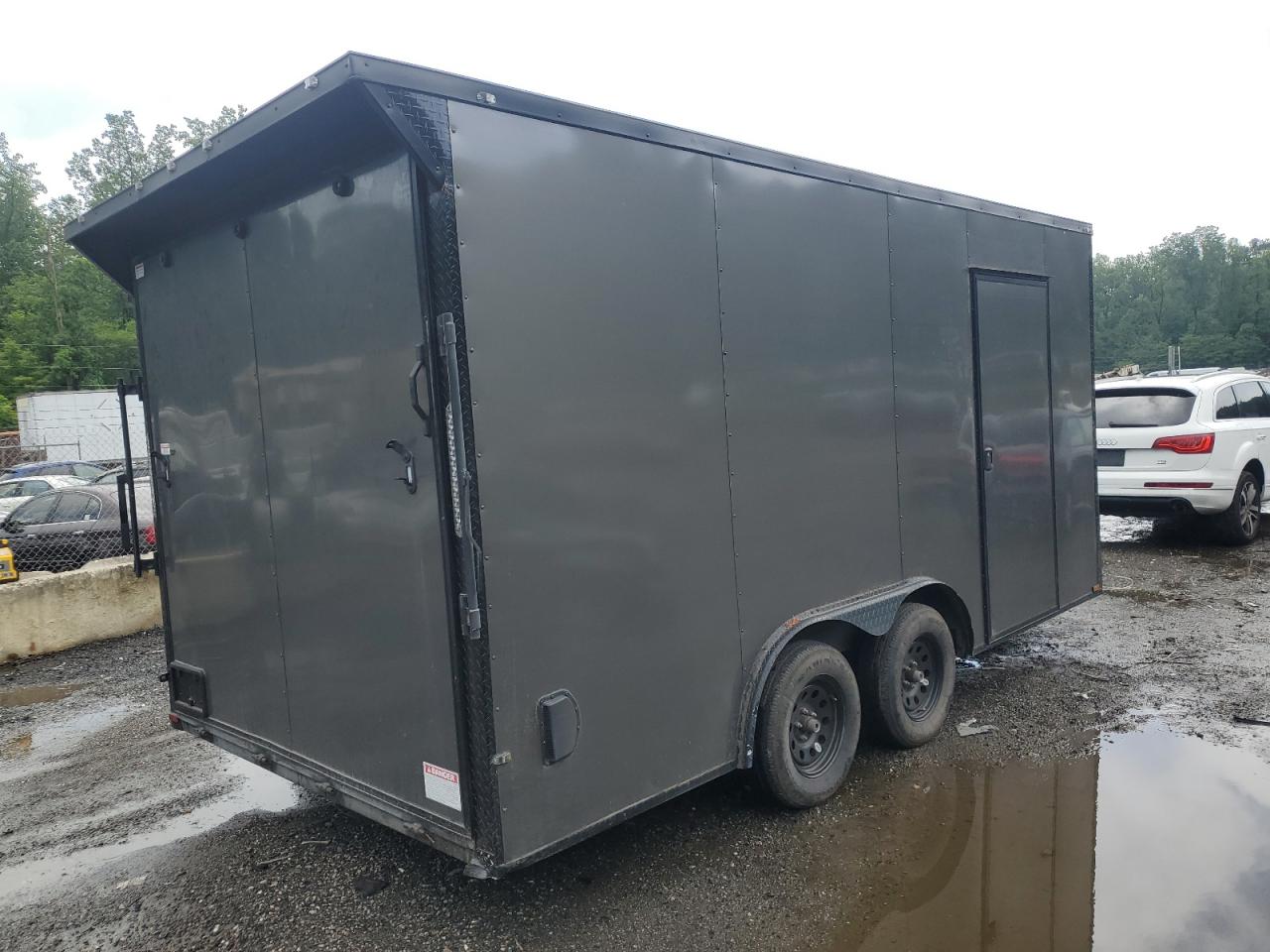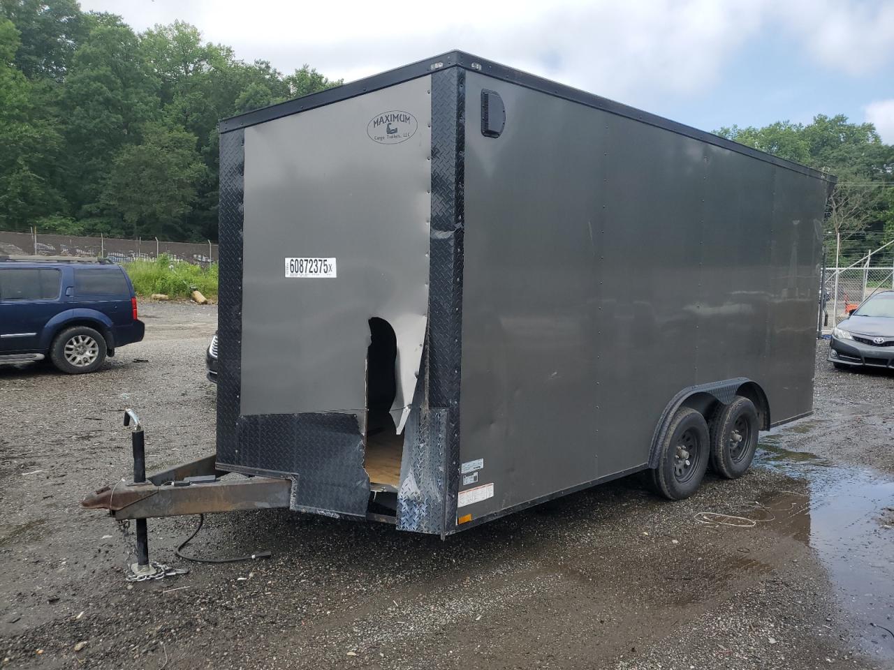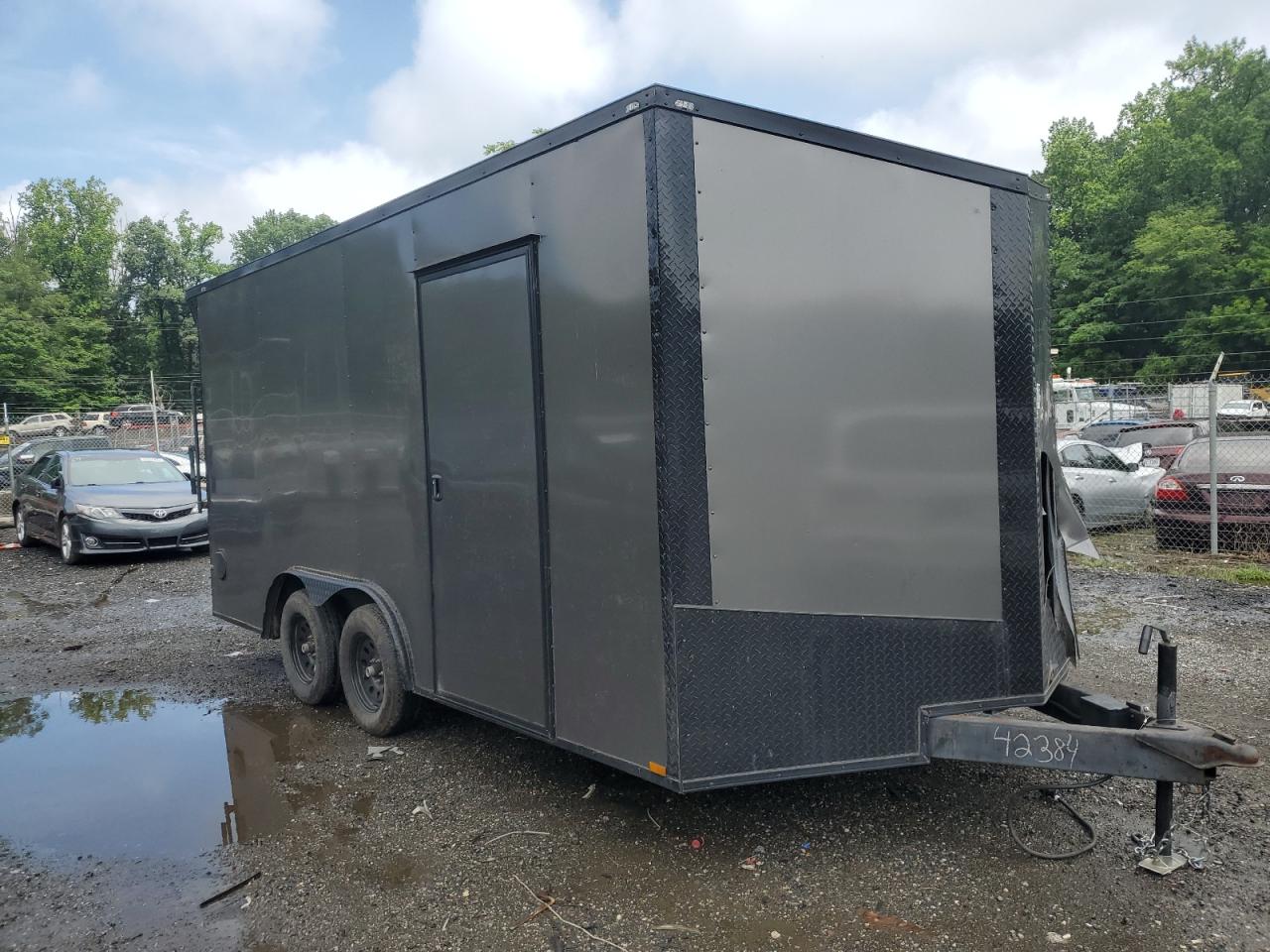 The trailer sustained considerable damage to the front end, with a visible hole. There are also minor dents and scratches across the body. The interior appears to be in good condition.