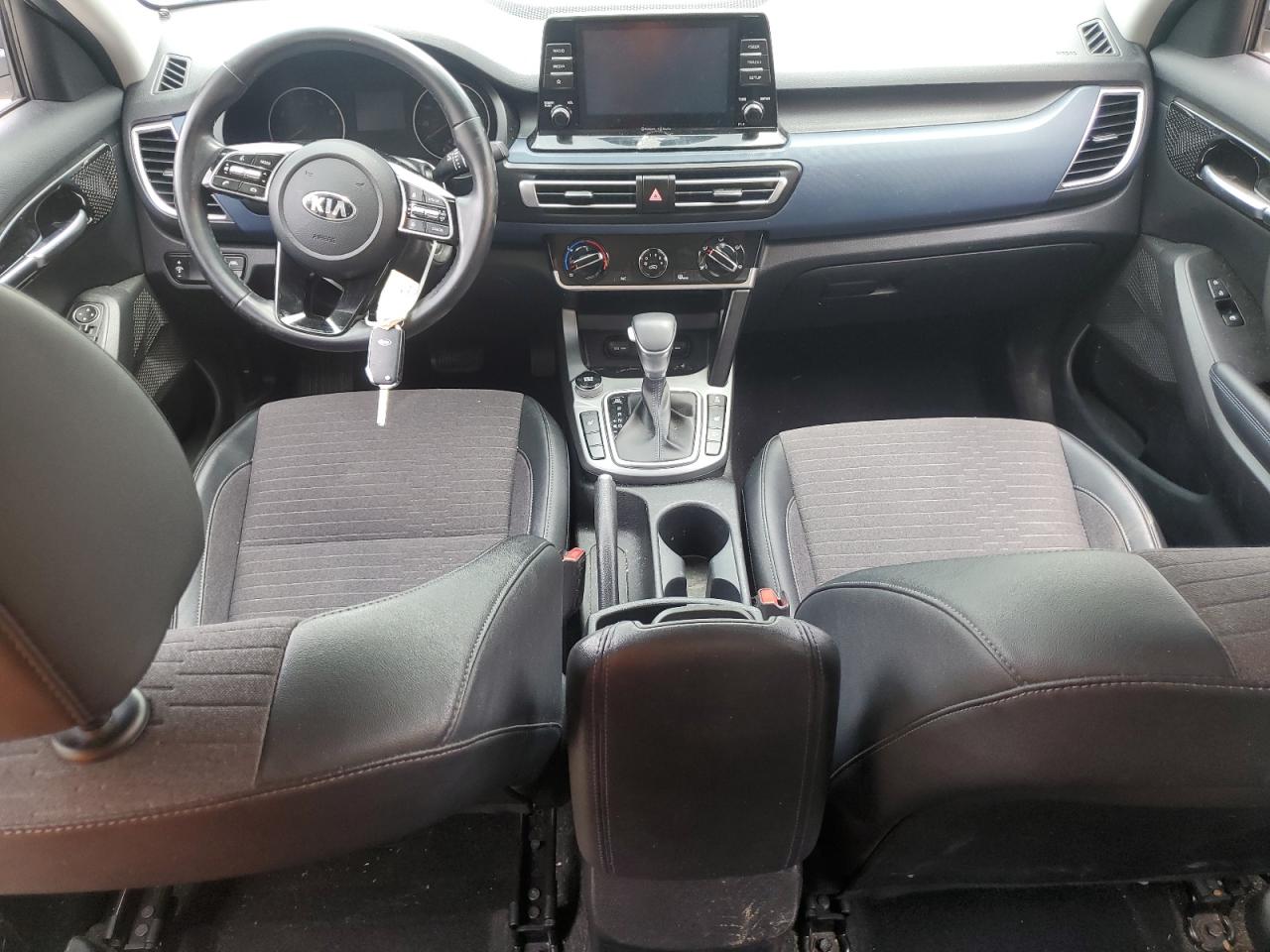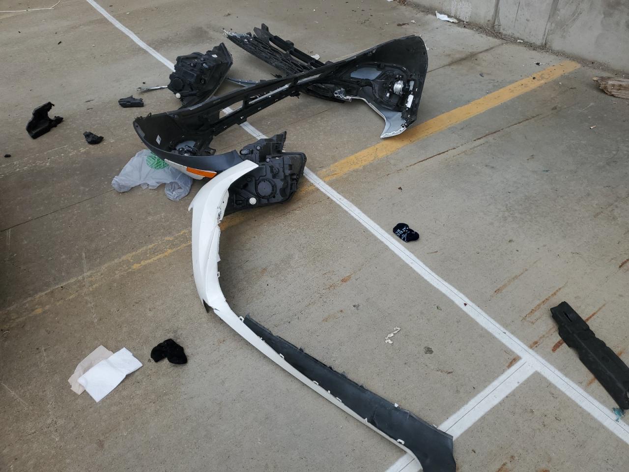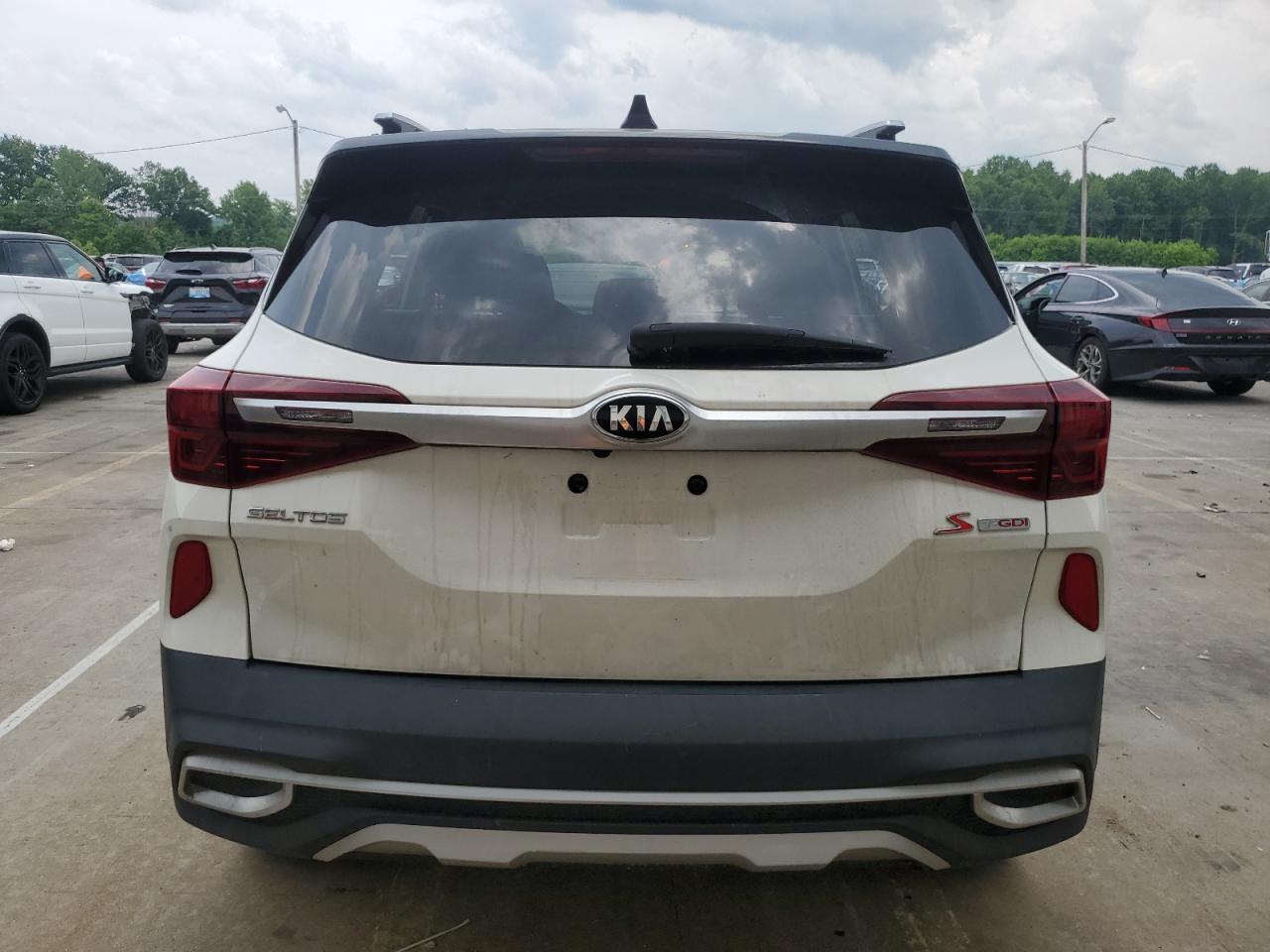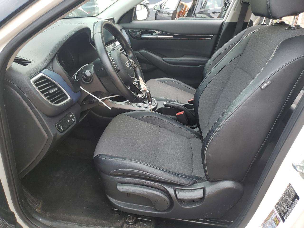 FairThis is a white 2021 KIA SELTOS S. The primary damage is to the front end, with significant damage to the front bumper, hood, and possibly the front fenders. The headlights and front grill are missing. The car appears to have sustained a frontal collision. The wheels appear to be intact. The interior condition appears to be good with no obvious damage. The dashboard shows a mileage of 53,609.