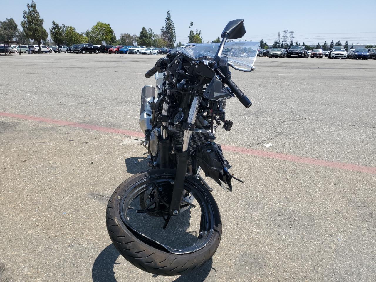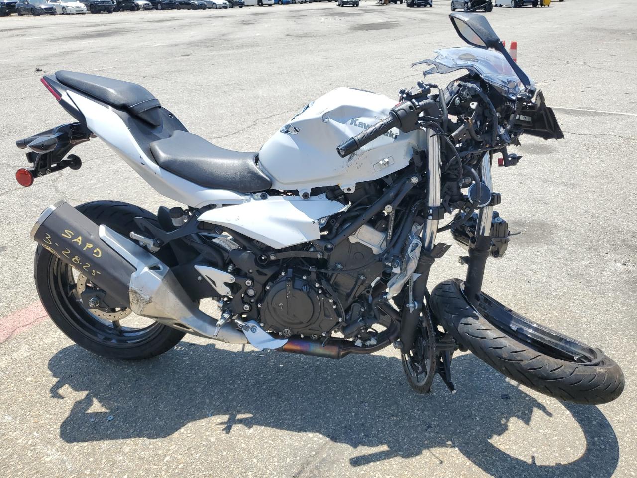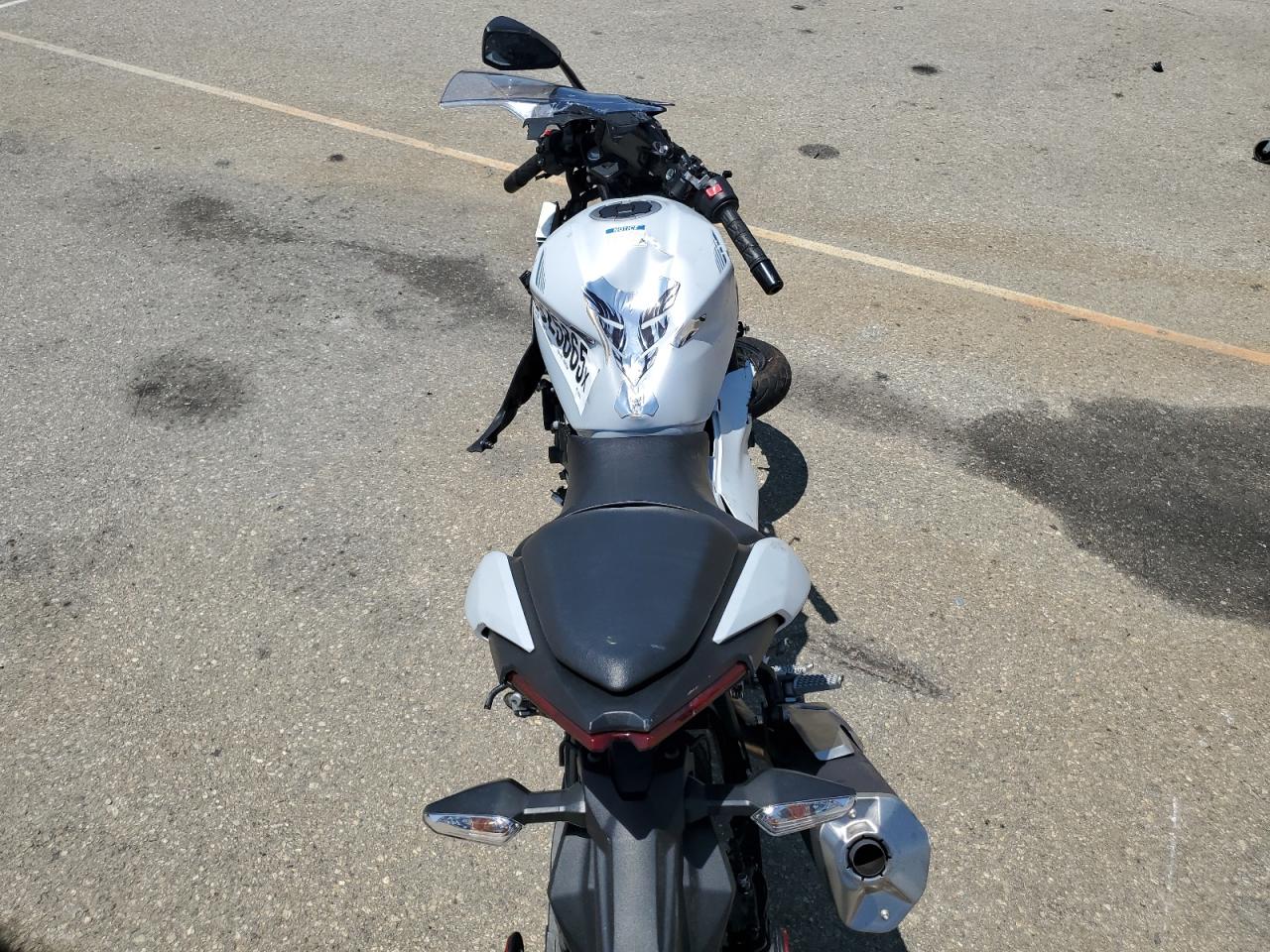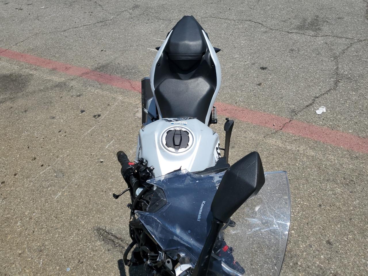 PoorThe Kawasaki EX500 2024, in silver, exhibits significant damage. The front of the motorcycle is heavily damaged, with the front wheel severely compromised and the front fairing and components severely damaged. The body panels show damage consistent with a collision. The rear appears to have less damage.