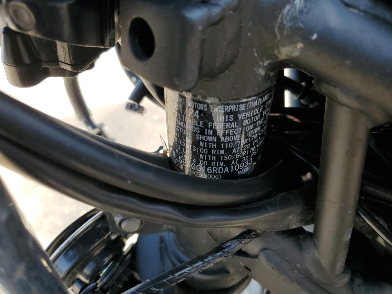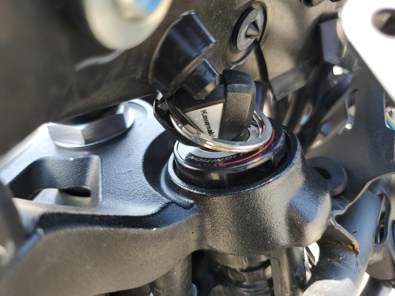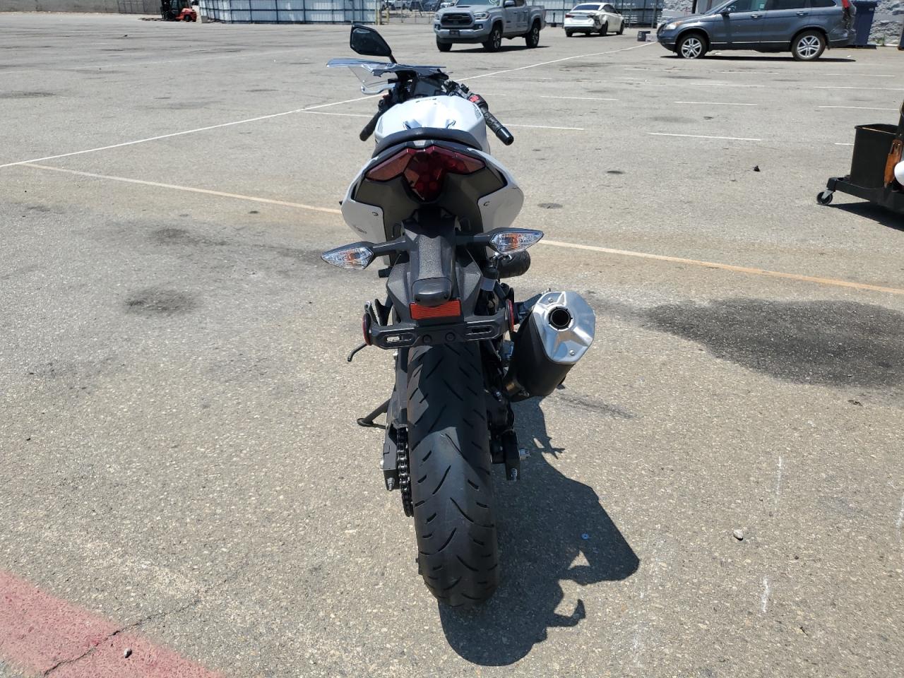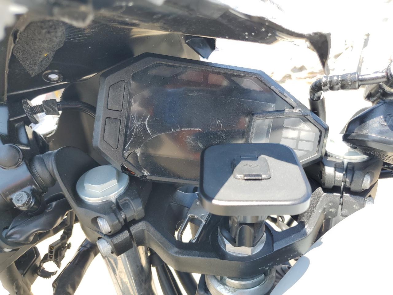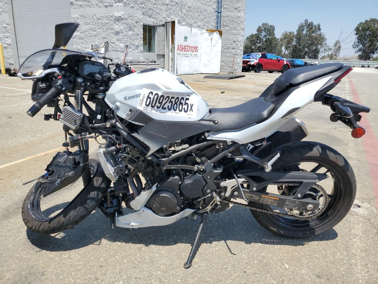 PoorThe Kawasaki EX500 2024, in silver, exhibits significant damage. The front of the motorcycle is heavily damaged, with the front wheel severely compromised and the front fairing and components severely damaged. The body panels show damage consistent with a collision. The rear appears to have less damage.