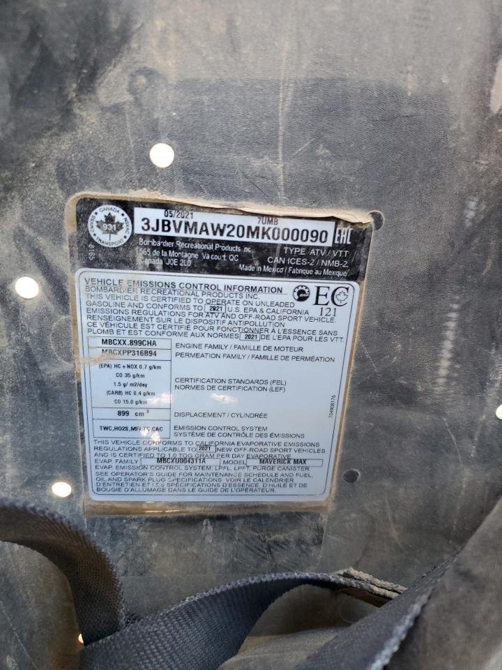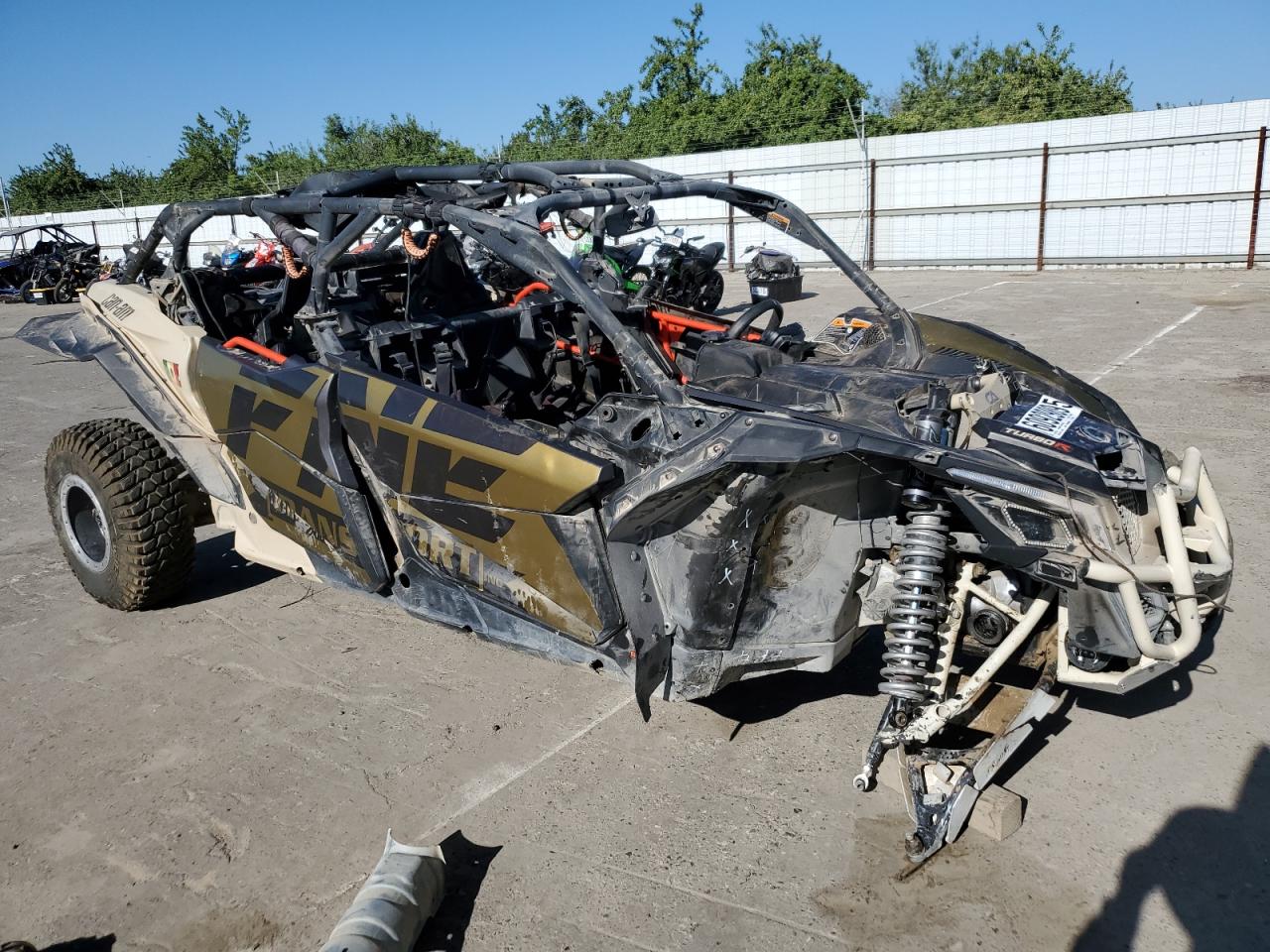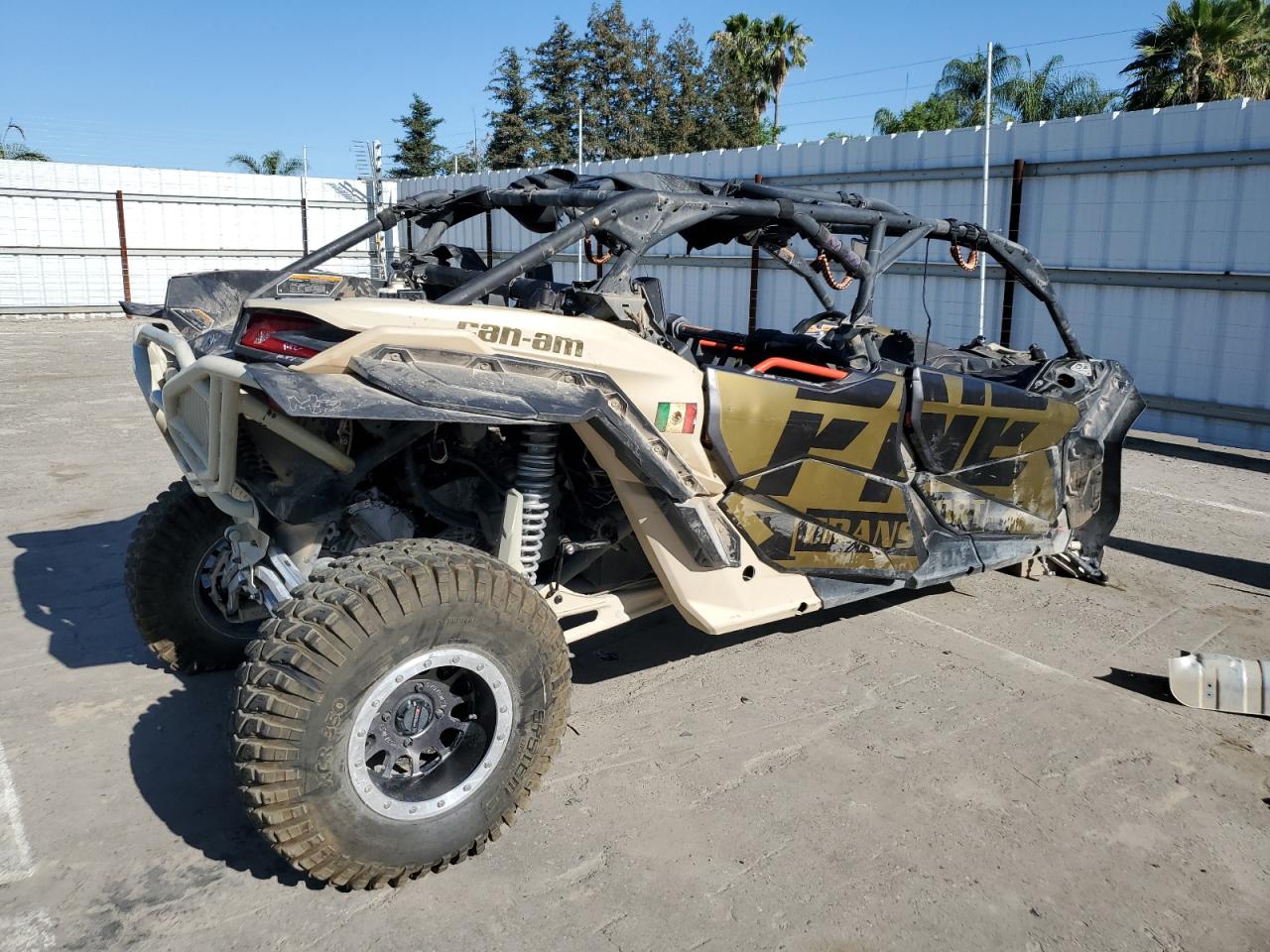 FairThe Can-Am Maverick X3 2021, presents significant damage primarily to its front end. The vehicle's tan body panels show substantial damage, affecting its overall aesthetic and structural integrity. The interior shows damage to seats. The vehicle's wheels appear to be intact, but the front-end damage indicates considerable repair is needed, rendering it not drivable in its current state.