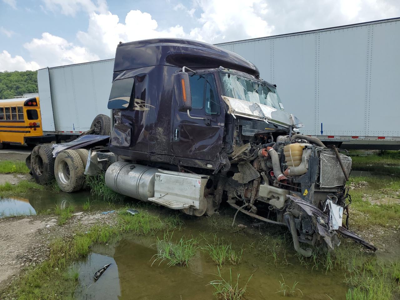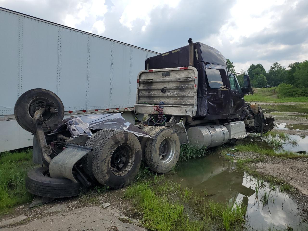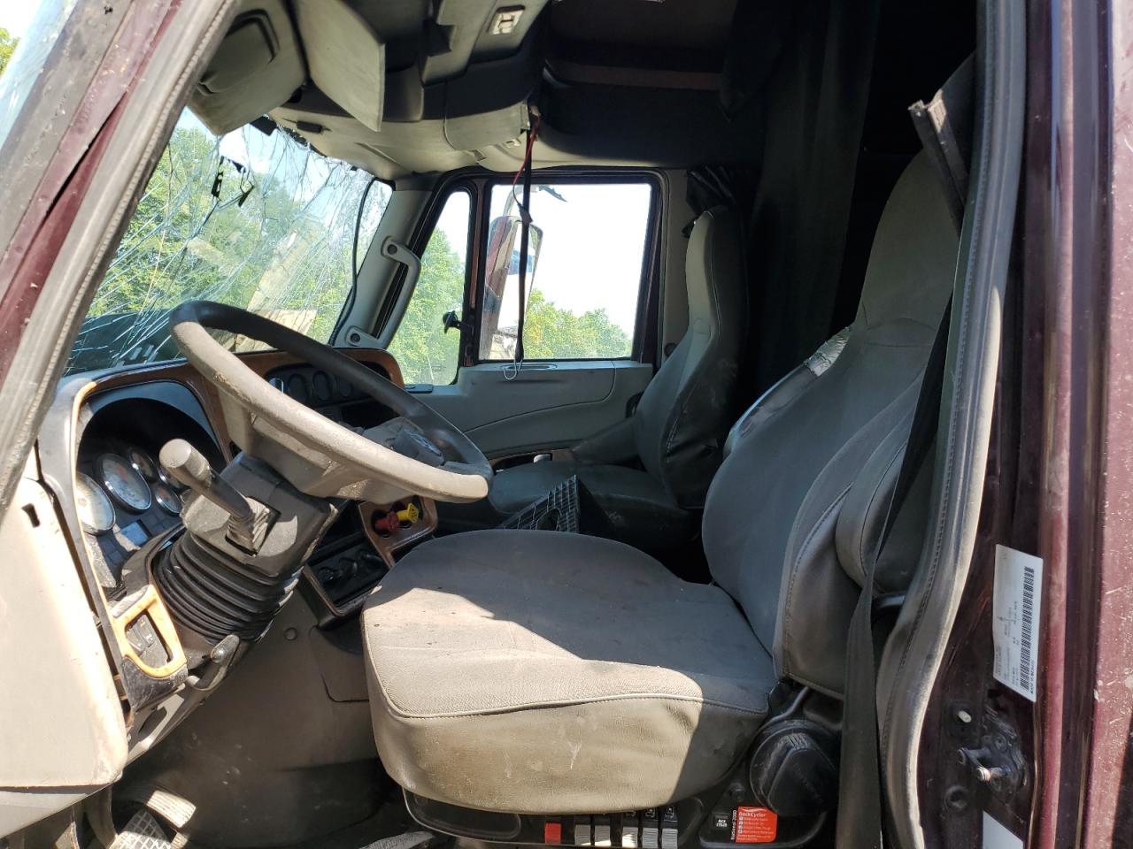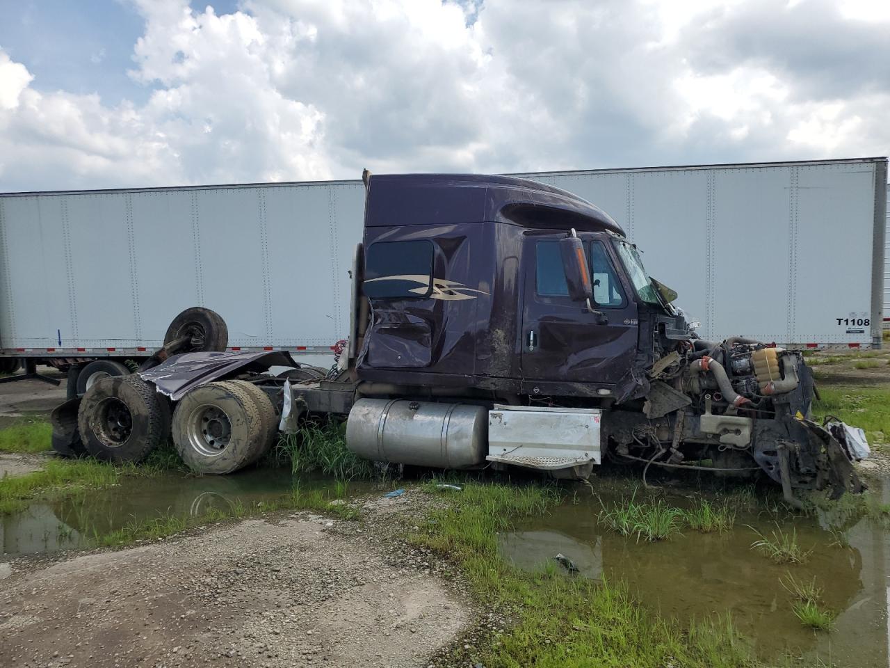 PoorThe INTERNATIONAL PROSTAR 2016 has sustained severe damage. The vehicle's exterior shows extensive damage, including significant deformation of the cab and front end due to an accident. The maroon-colored truck appears to have been involved in a rollover, with the front of the vehicle completely crushed. The wheels are intact but appear to have been affected by the impact. The interior shows damage, including airbags deployed. The dashboard and cabin show wear and tear.