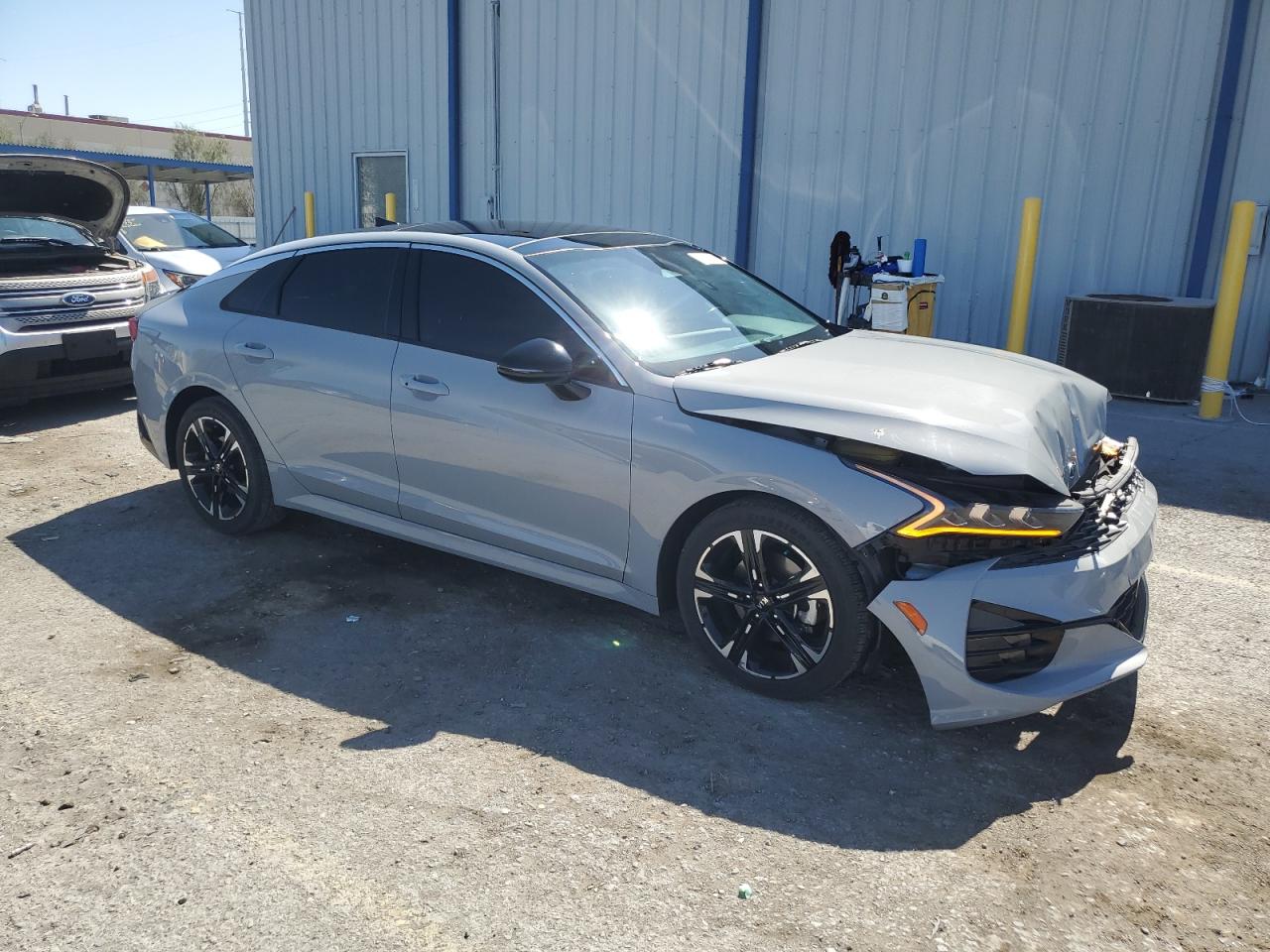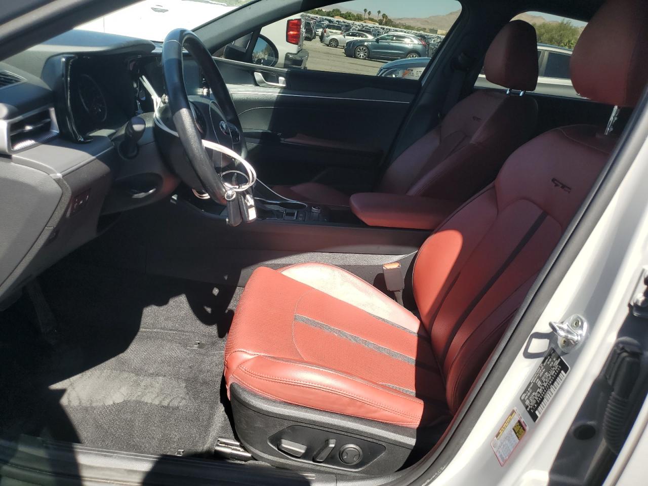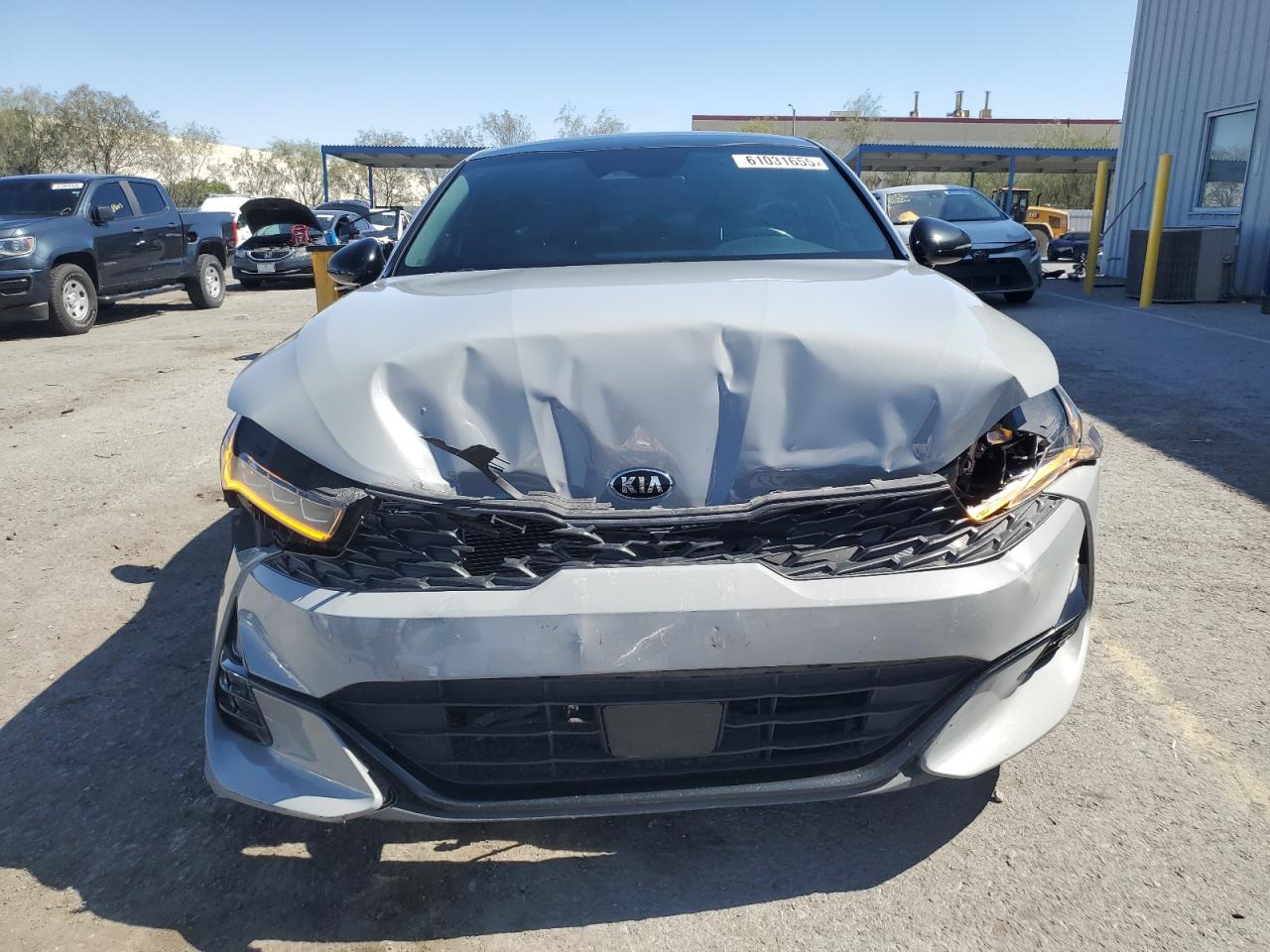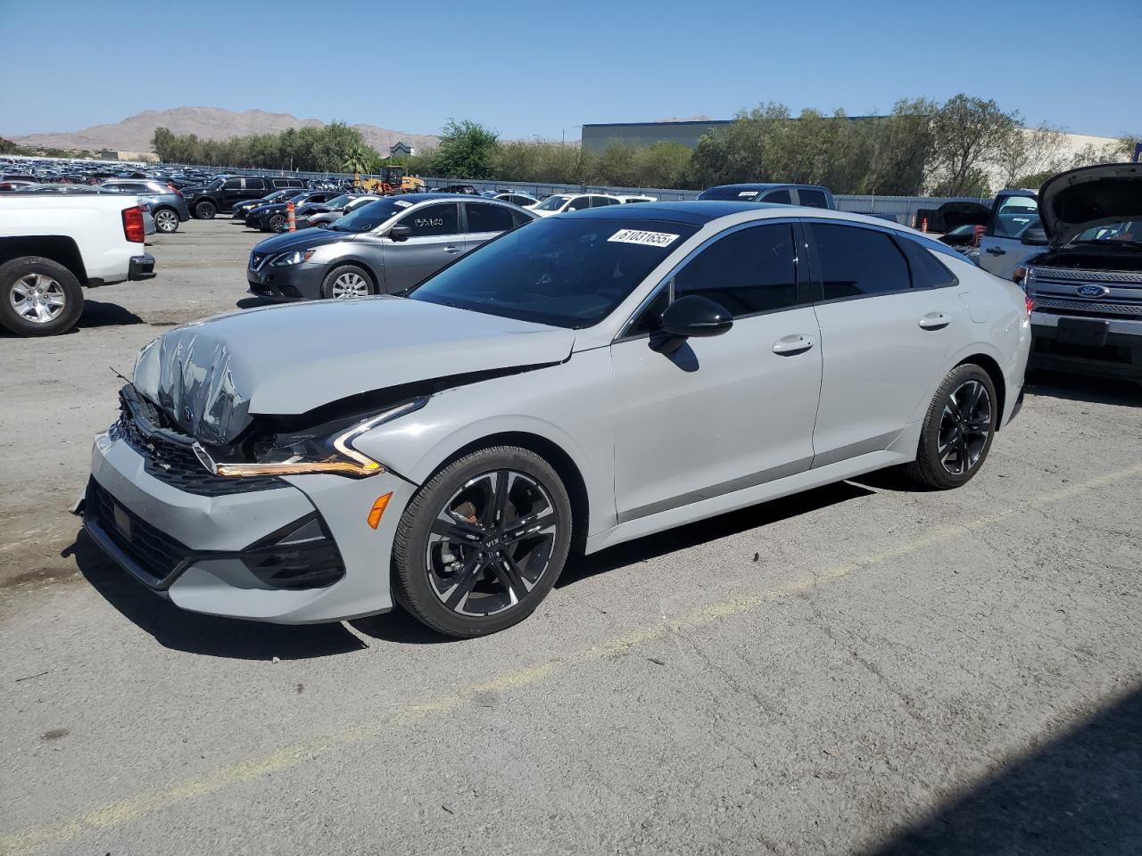 FairThe 2021 KIA K5 GT LINE, gray in color, exhibits significant front-end damage. The primary damage is concentrated on the front end, while there is no apparent secondary damage. The vehicle starts and runs, verified as 'Run & Drive'. Interior appears to be in good condition with red seats.