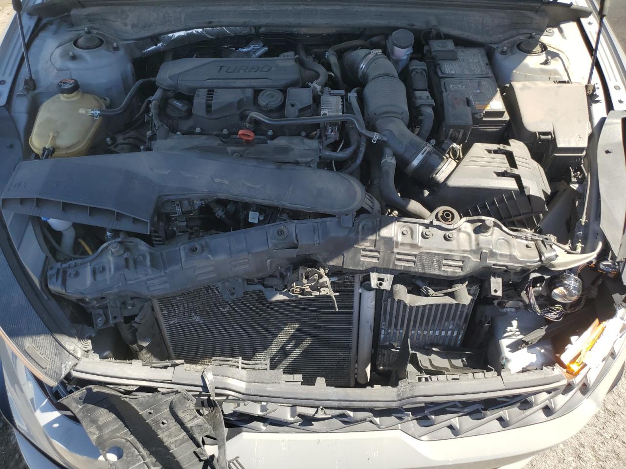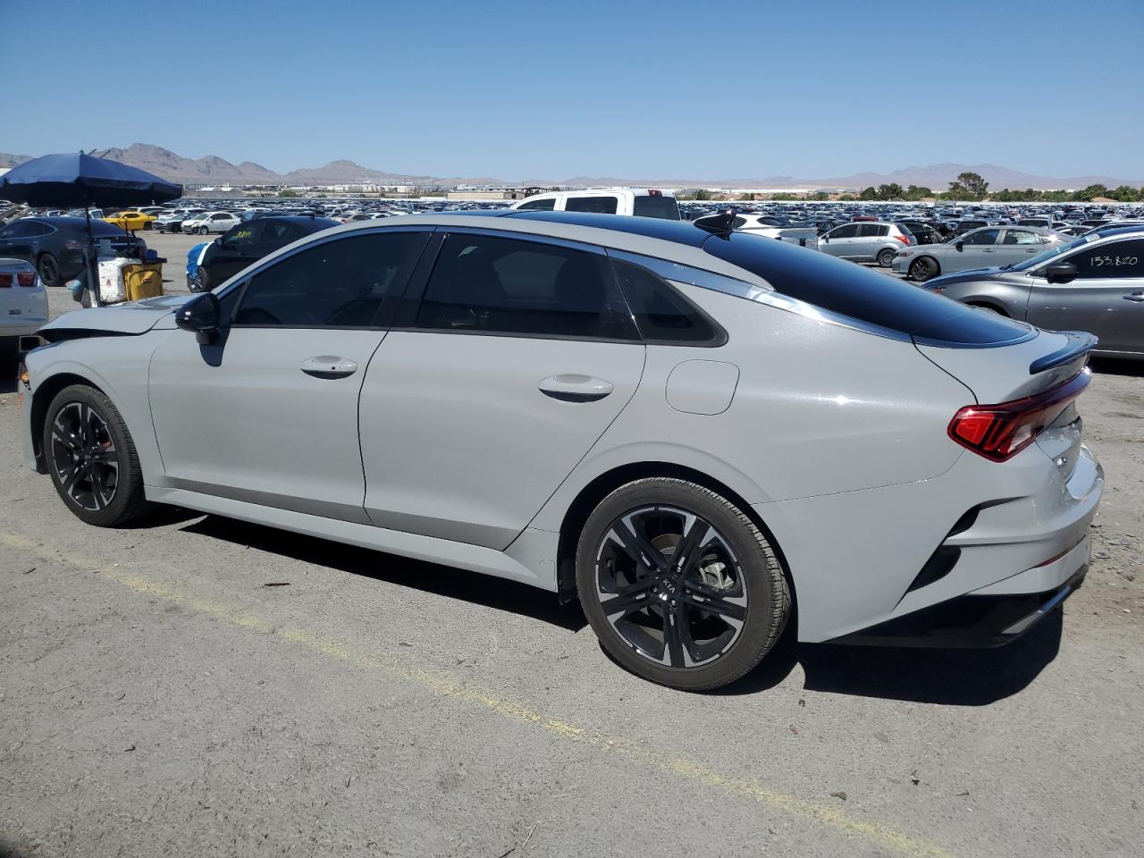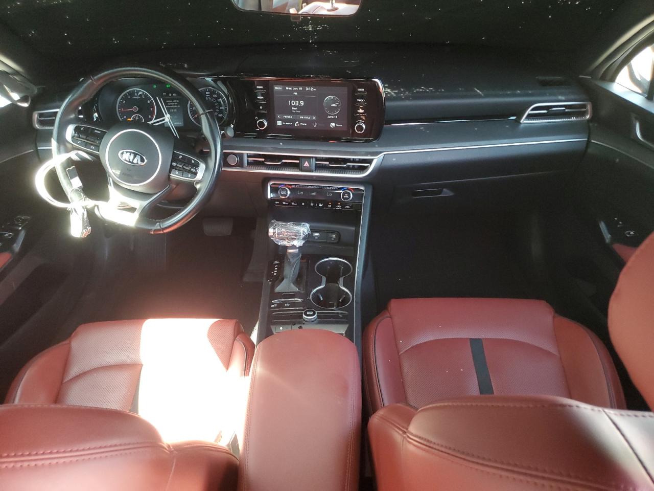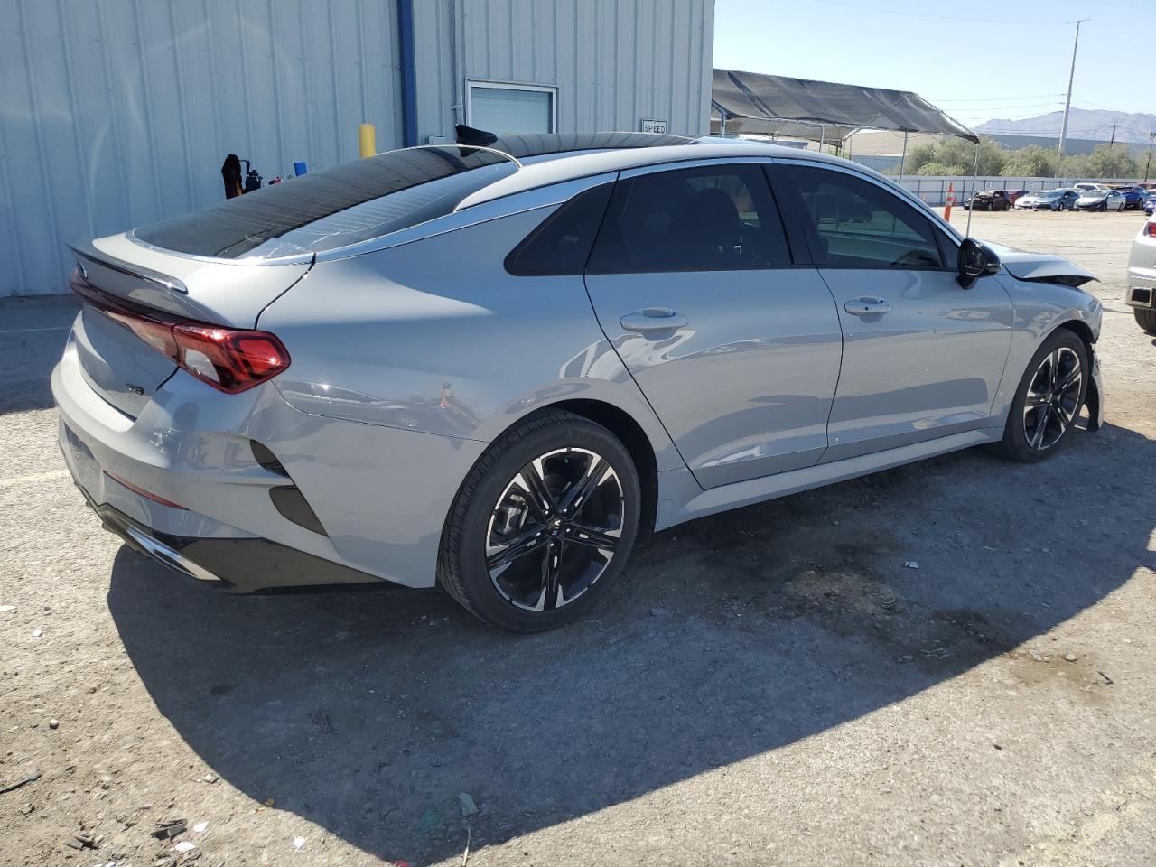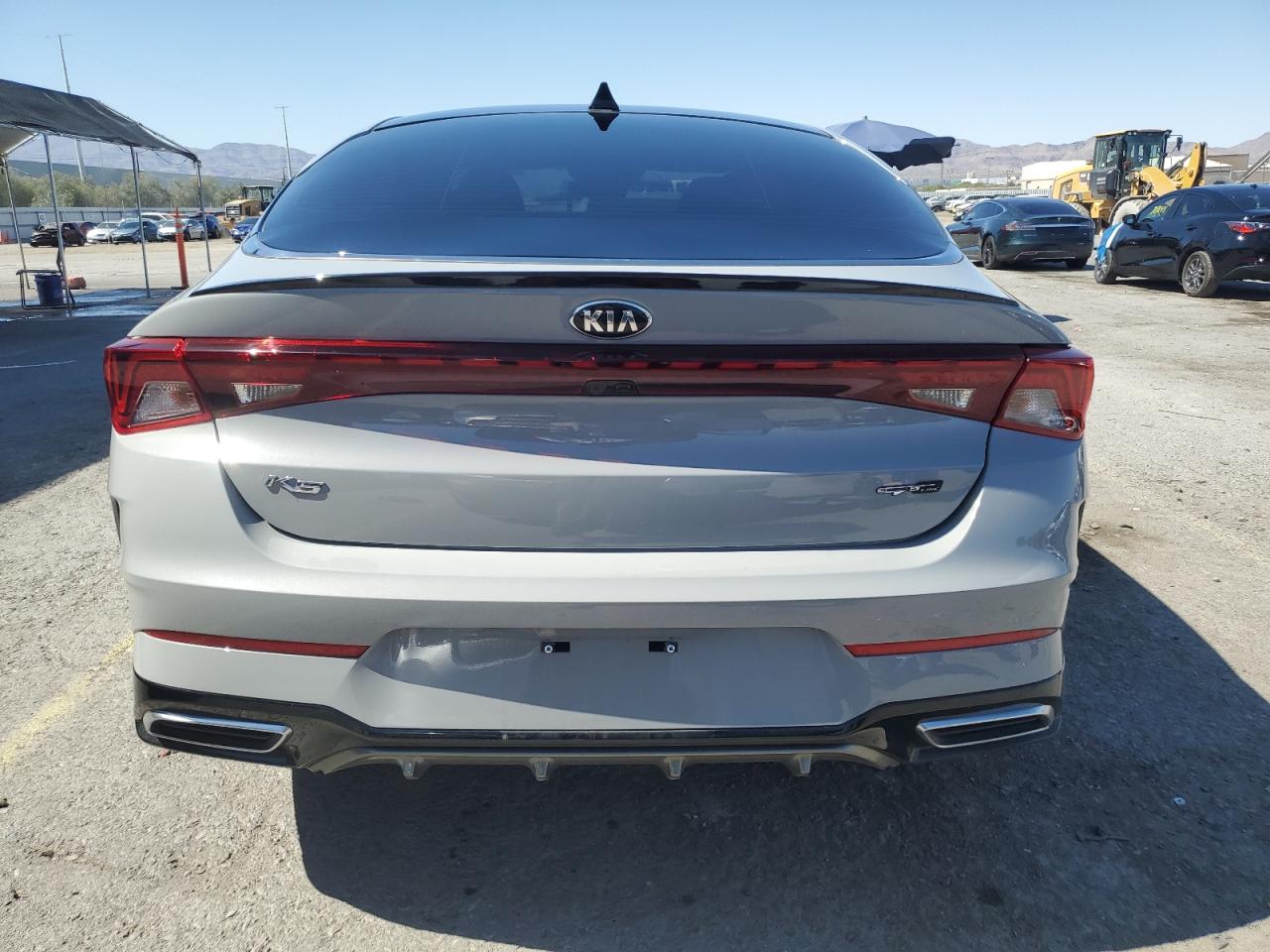 FairThe 2021 KIA K5 GT LINE, gray in color, exhibits significant front-end damage. The primary damage is concentrated on the front end, while there is no apparent secondary damage. The vehicle starts and runs, verified as 'Run & Drive'. Interior appears to be in good condition with red seats.