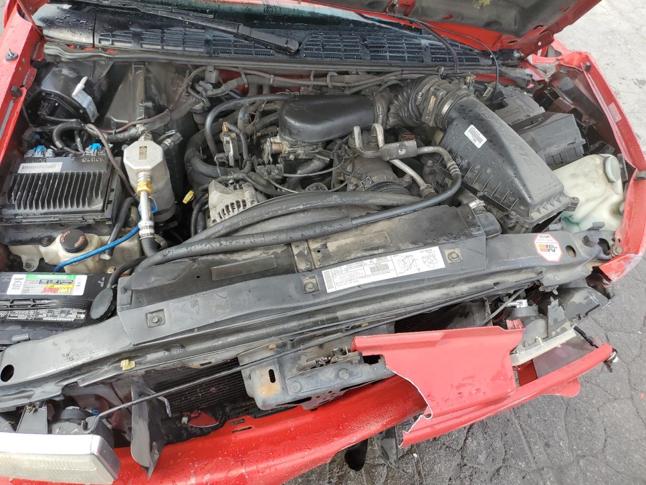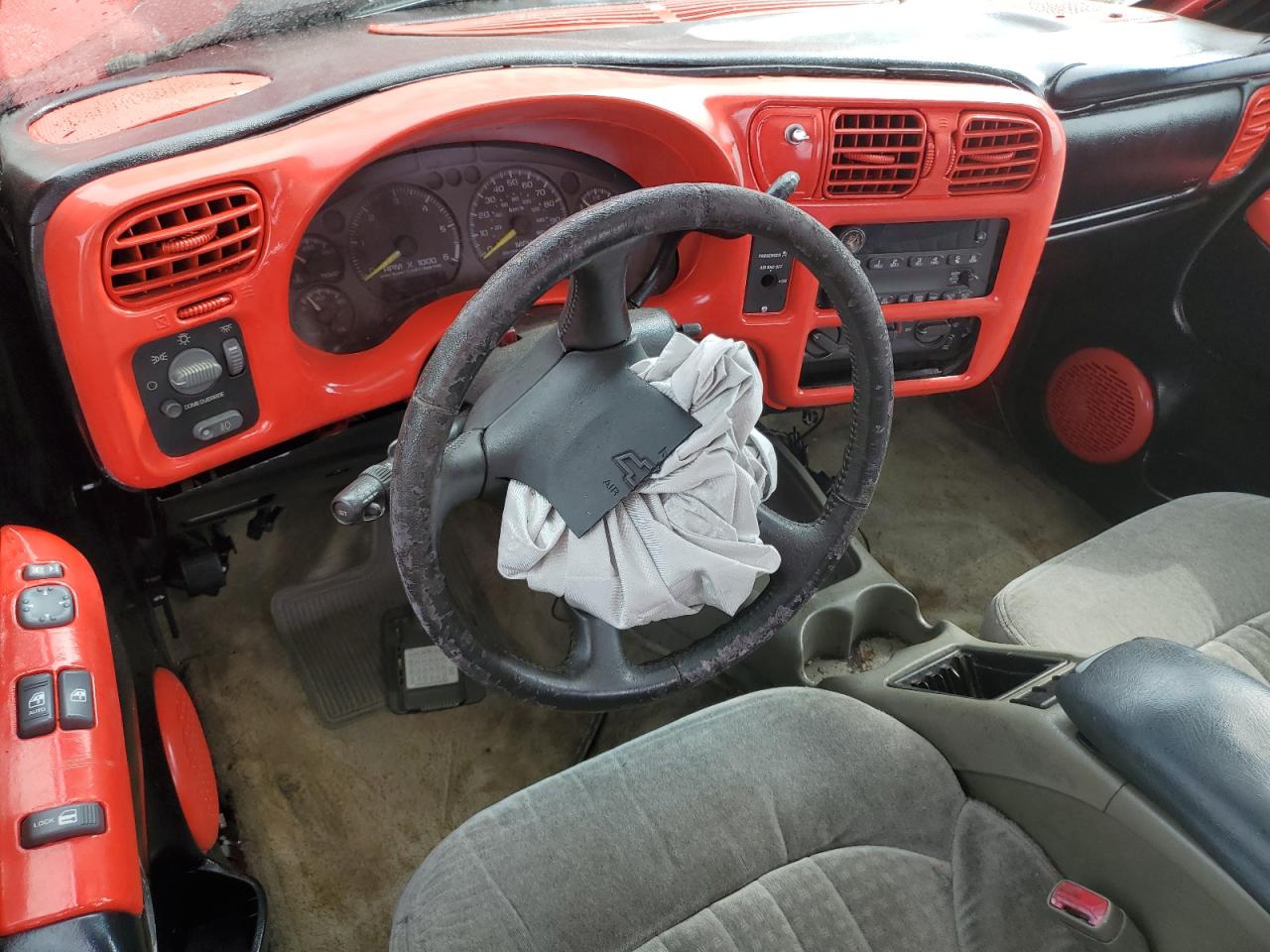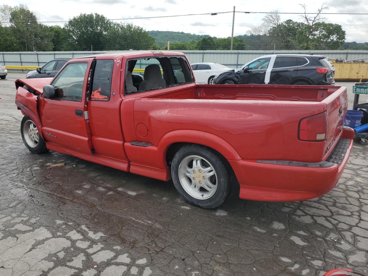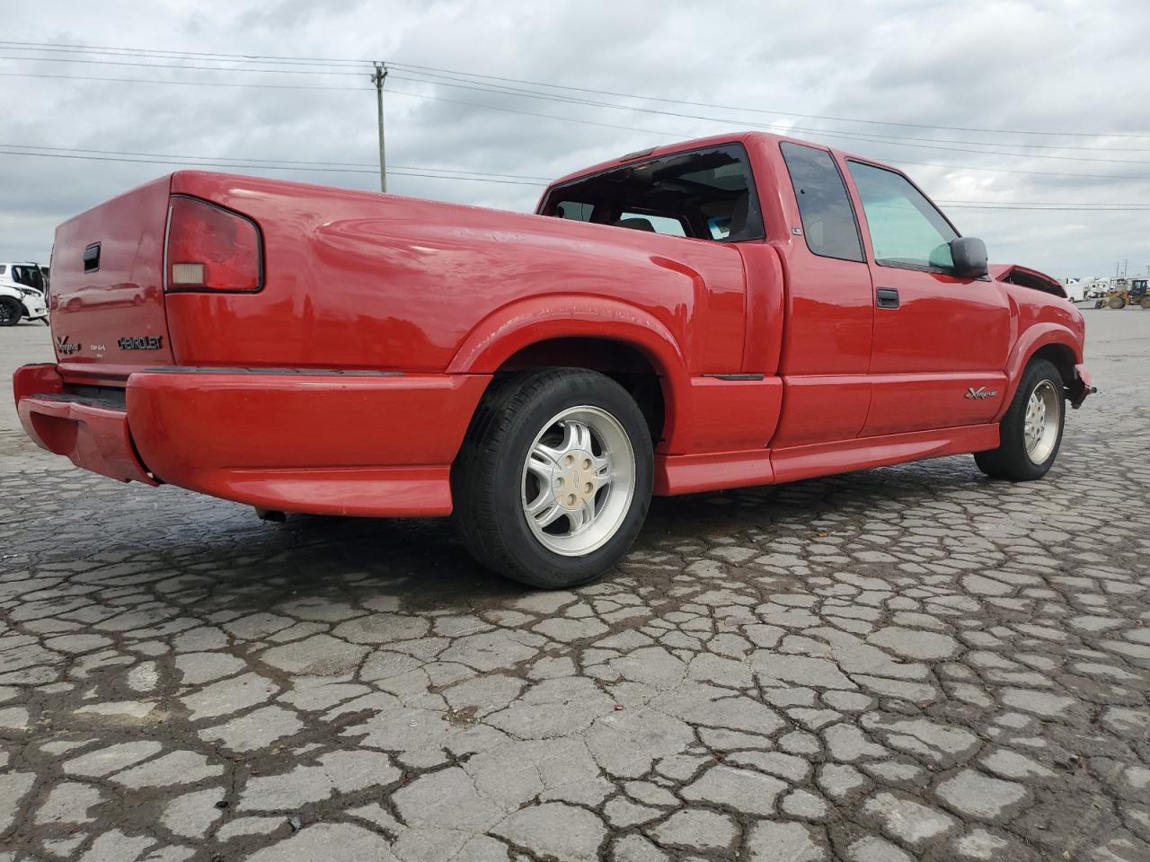 FairThe red 2000 Chevrolet S-10 Xtreme truck has sustained significant damage. The front end of the vehicle has substantial damage, and the airbags have deployed. The interior shows signs of wear and damage as well. The wheels appear to be in decent condition.